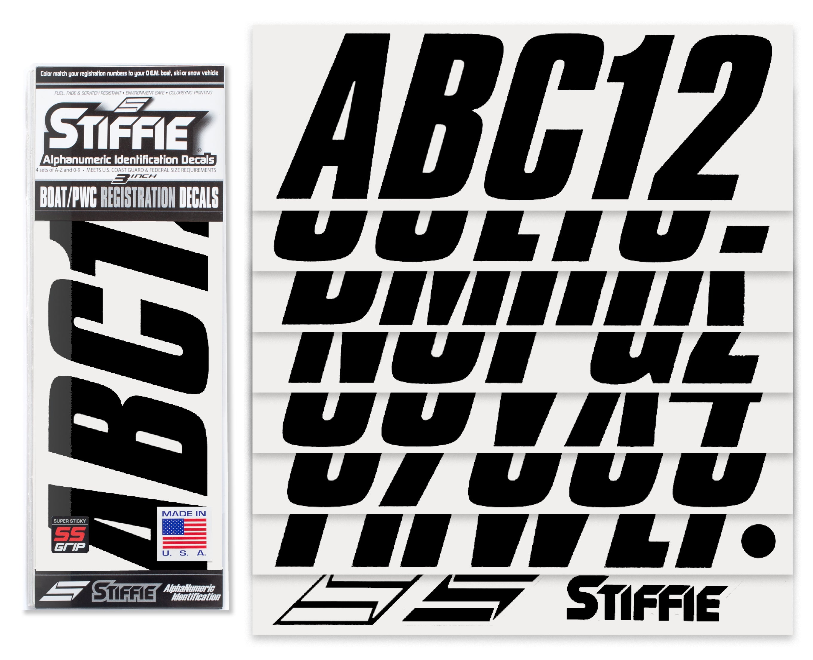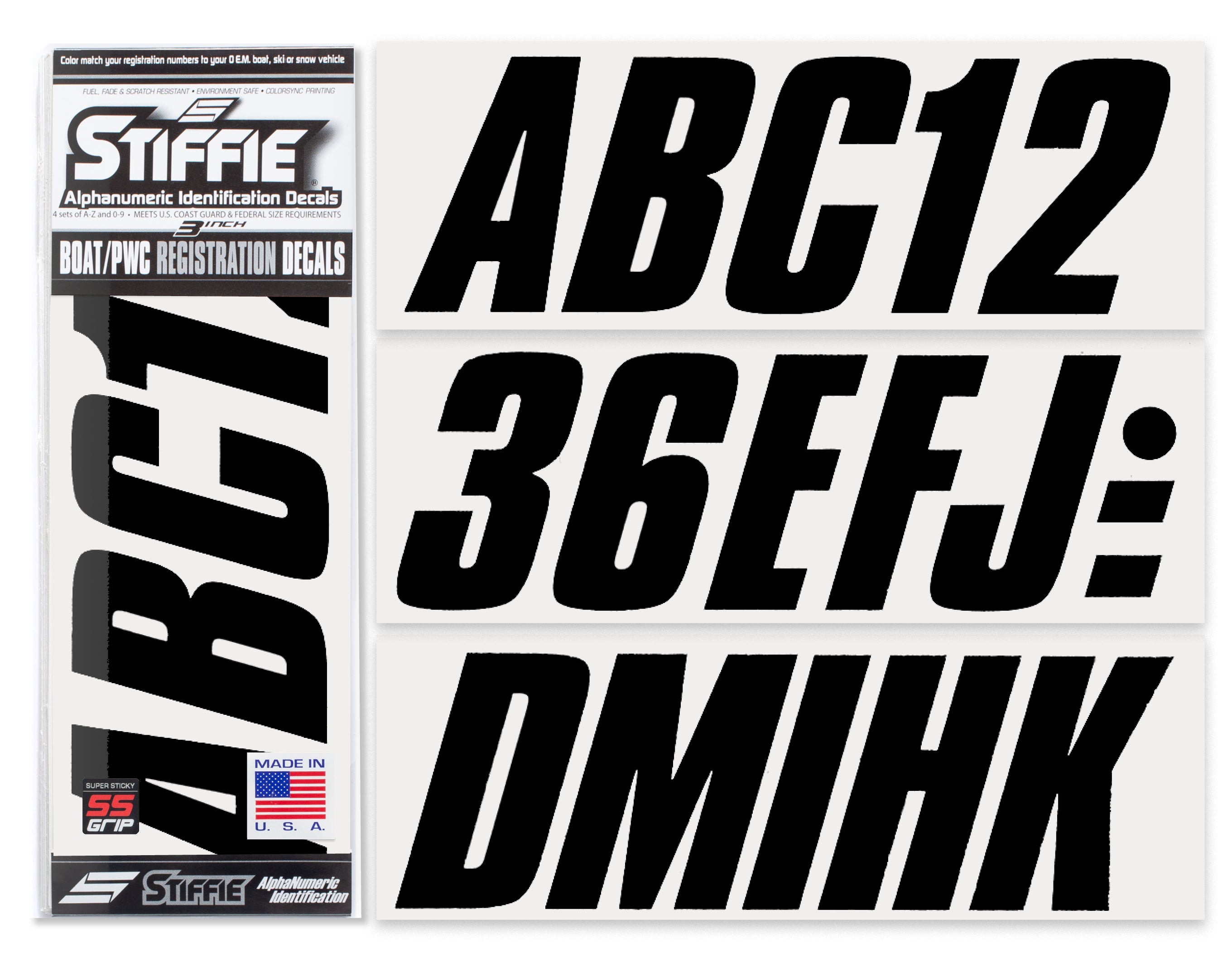 STIFFIE Shift Black Super Sticky 3" Alpha Numeric Registration Identification Numbers Stickers Decals for Sea-Doo Spark, Inflatable Boats, Ribs, Hypalon/PVC, PWC and Boats.