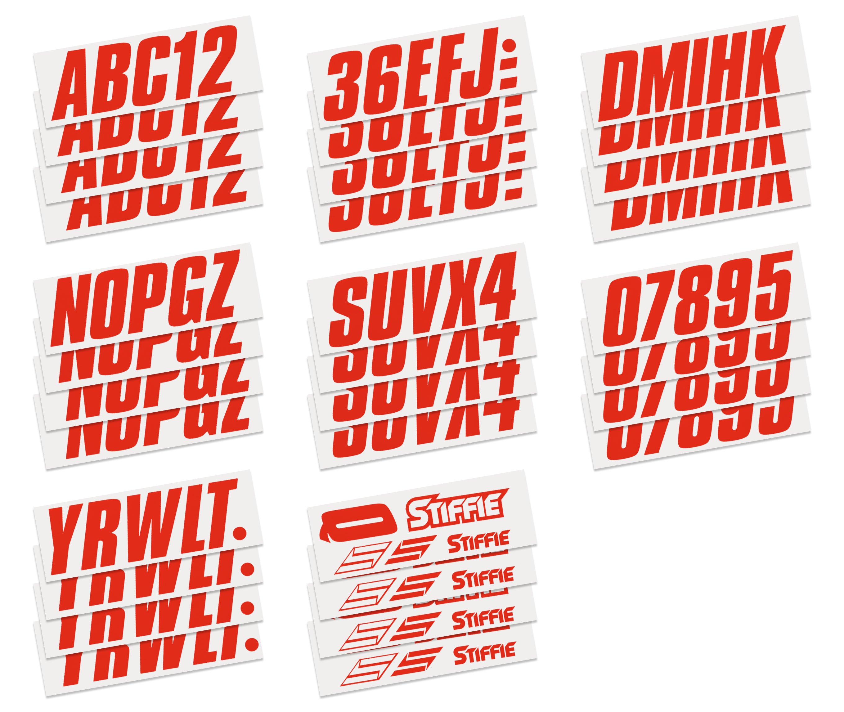 - All STIFFIE kits include 4 each of the letters A-Z and the numbers 0-9 for a total of 146 decals.