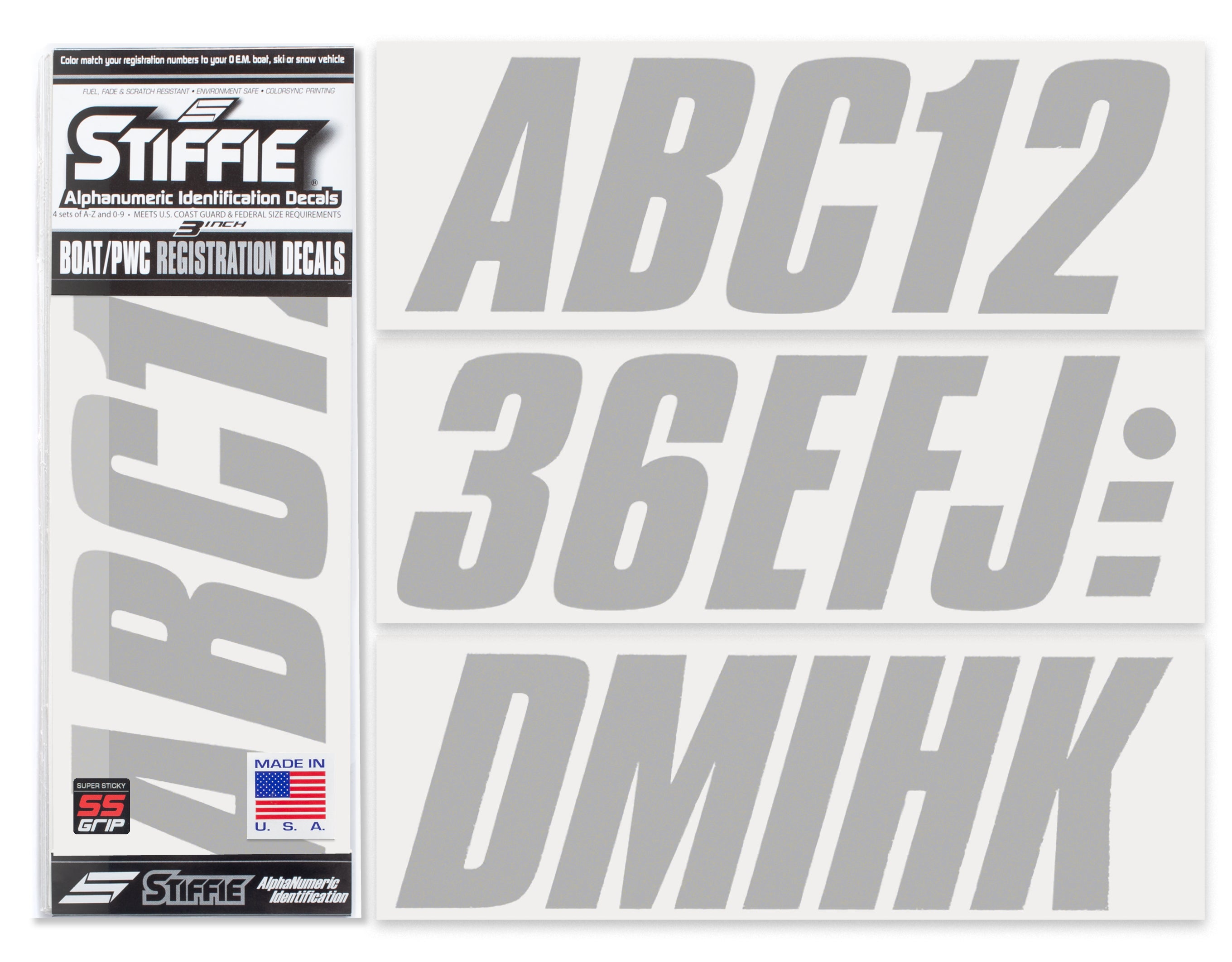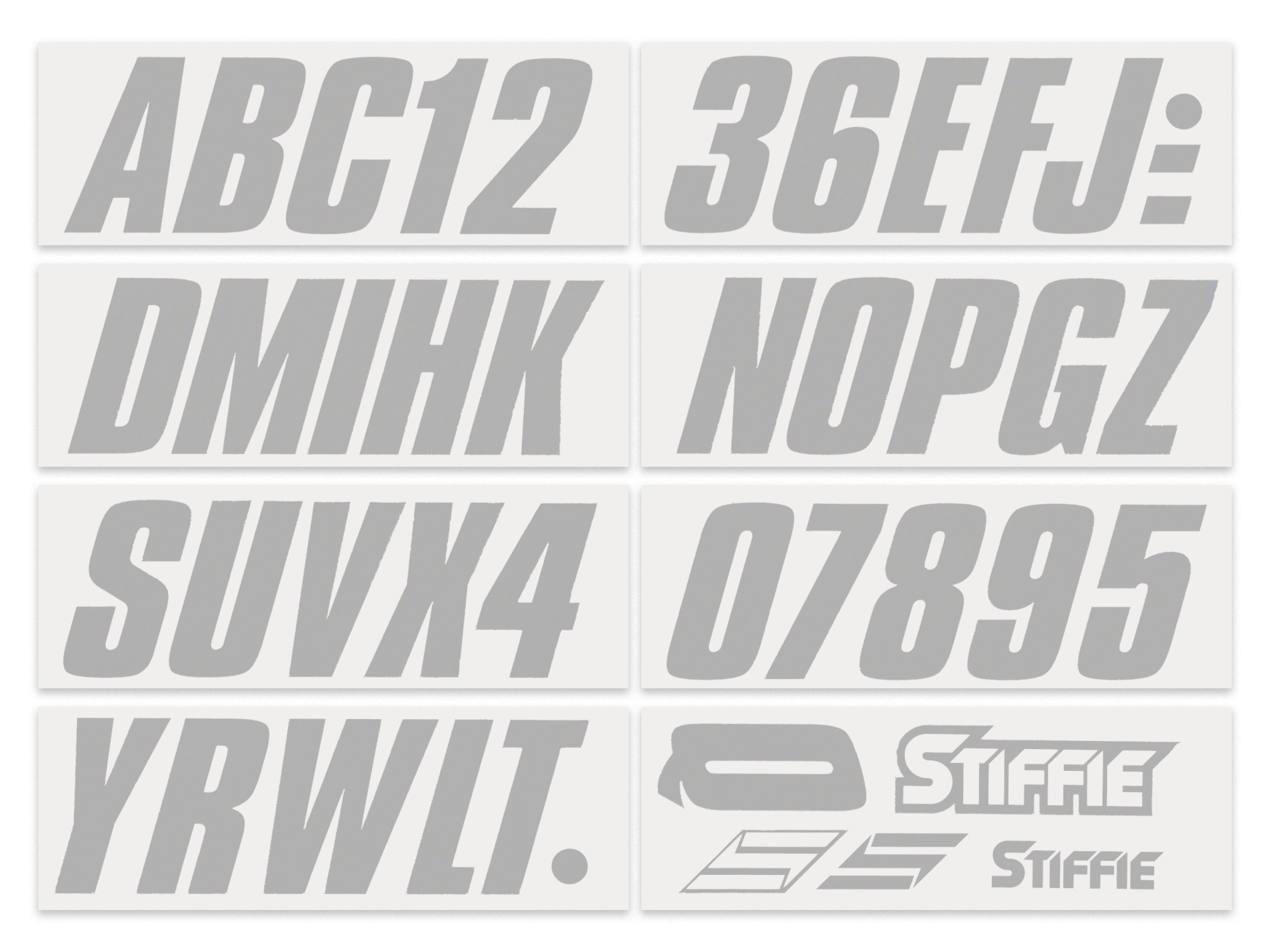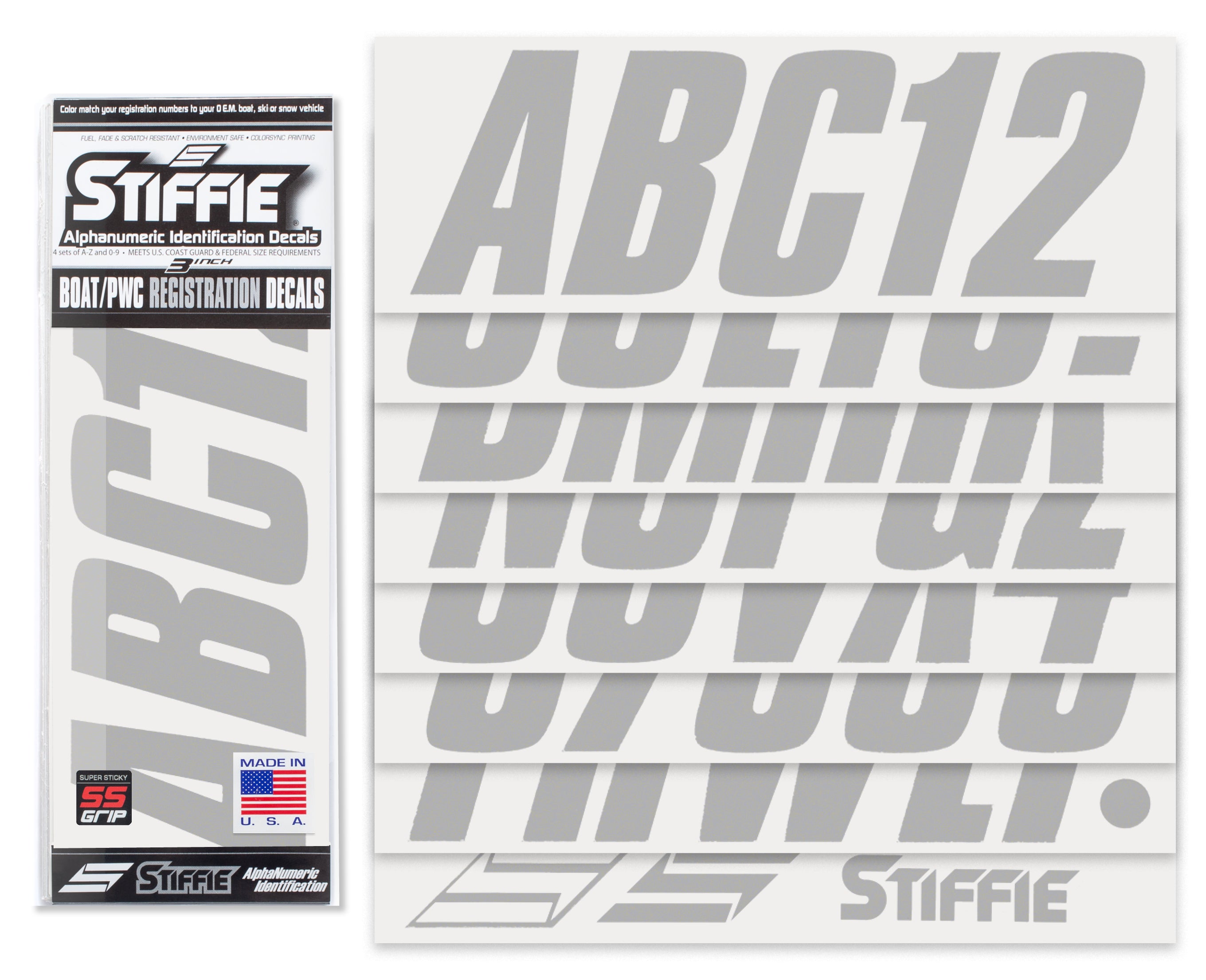 STIFFIE Shift Silver Super Sticky 3" Alpha Numeric Registration Identification Numbers Stickers Decals for Sea-Doo Spark, Inflatable Boats, Ribs, Hypalon/PVC, PWC and Boats.