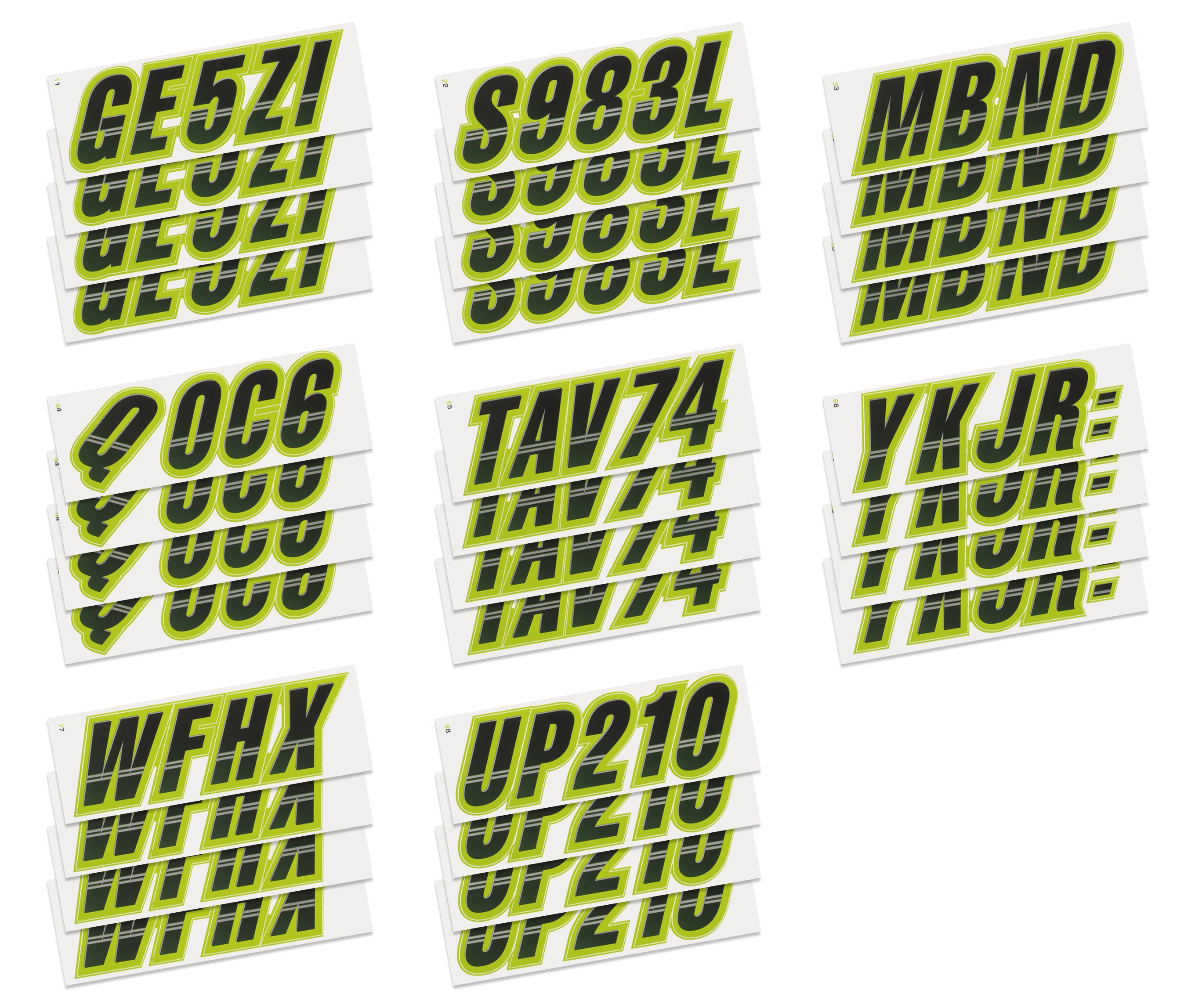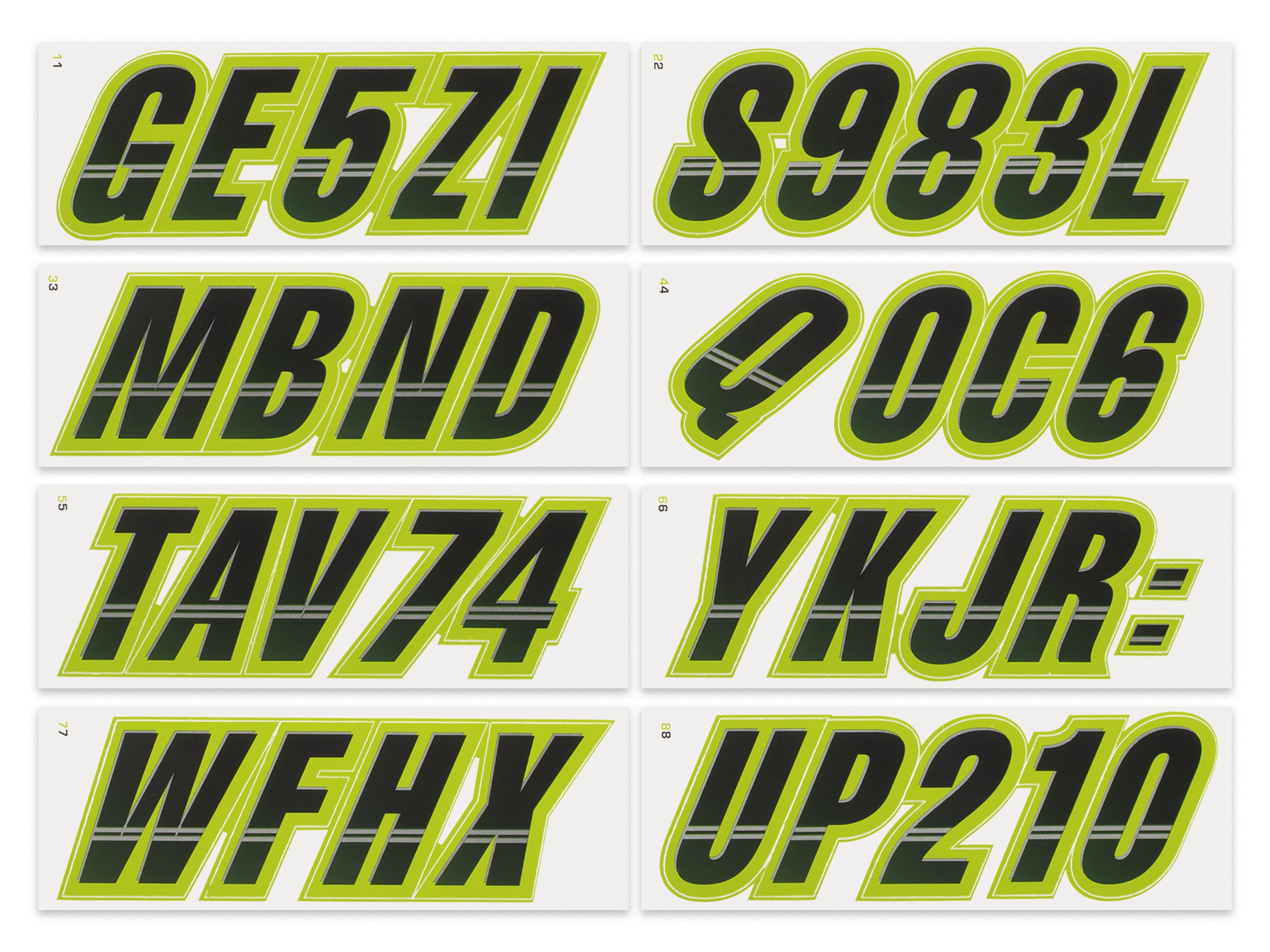 The STIFFIE Techtron™ Alpha Numeric Identification Kit has filled the void for a racing inspired boat registration decal. This style’s two-color design features a forward-facing slant with an exterior color fade-in that graduates from the bottom upward. It’s circle track, auto racing inspired form is the basis of the individual characters which are set off by an interior half toned highlight, providing a 3-dimensional look.