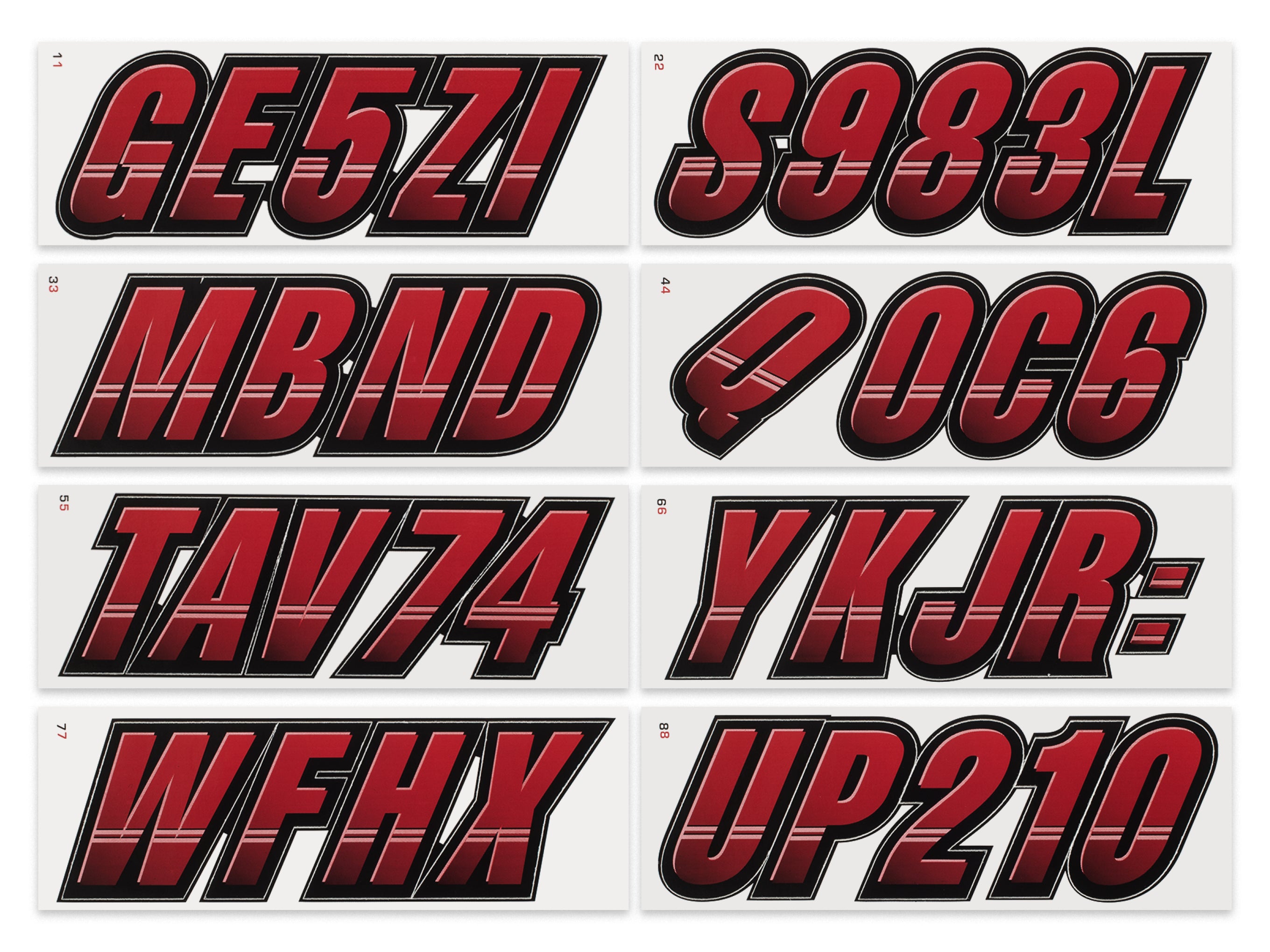 The STIFFIE Techtron™ Alpha Numeric Identification Kit has filled the void for a racing inspired boat registration decal. This style’s two-color design features a forward-facing slant with an exterior color fade-in that graduates from the bottom upward. It’s circle track, auto racing inspired form is the basis of the individual characters which are set off by an interior half toned highlight, providing a 3-dimensional look.