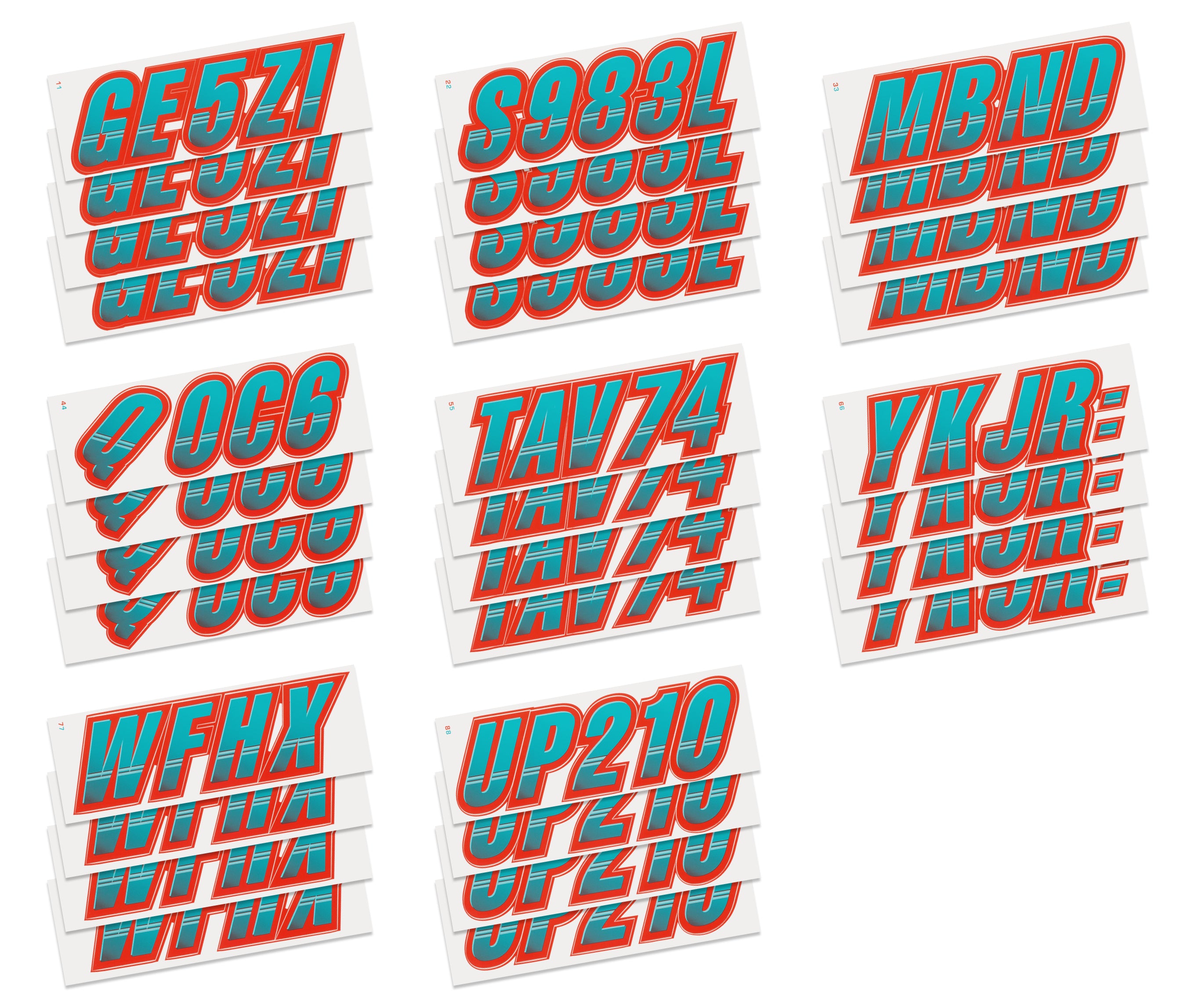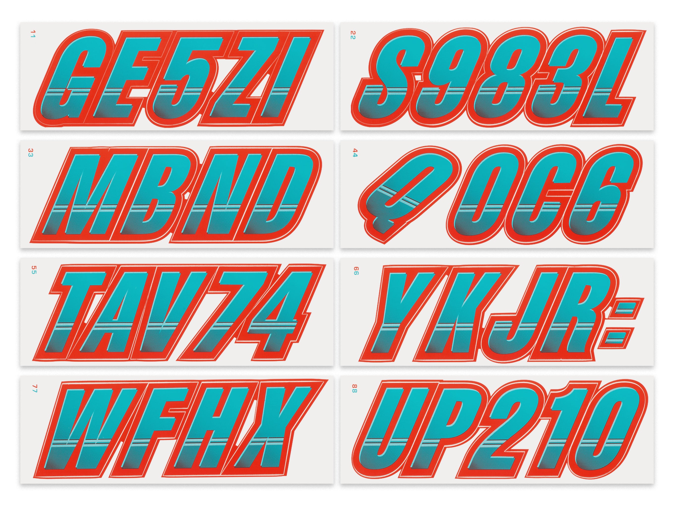 The STIFFIE Techtron™ Alpha Numeric Identification Kit has filled the void for a racing inspired boat registration decal. This style’s two-color design features a forward-facing slant with an exterior color fade-in that graduates from the bottom upward. It’s circle track, auto racing inspired form is the basis of the individual characters which are set off by an interior half toned highlight, providing a 3-dimensional look.