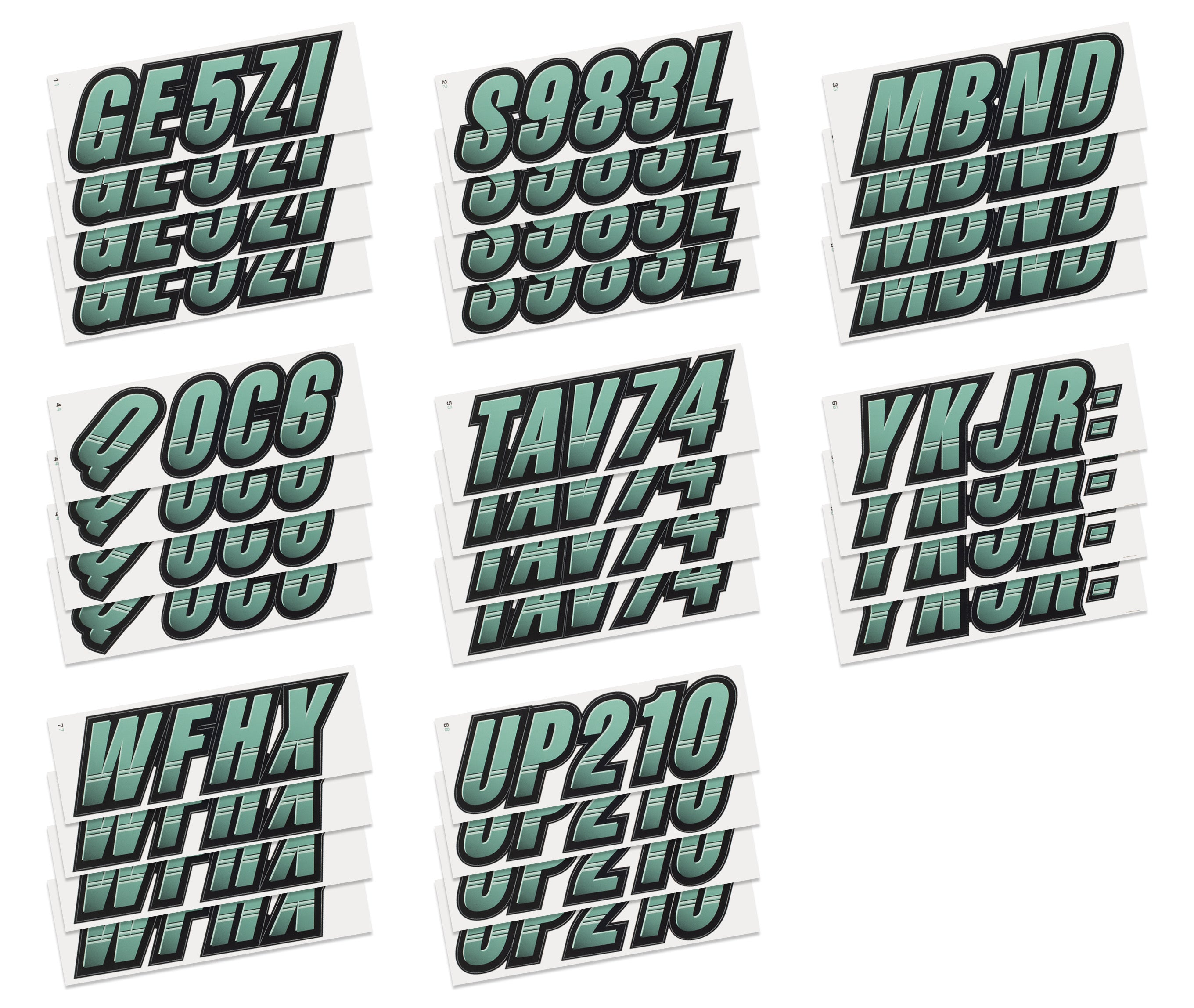 The STIFFIE Techtron™ Alpha Numeric Identification Kit has filled the void for a racing inspired boat registration decal. This style’s two-color design features a forward-facing slant with an exterior color fade-in that graduates from the bottom upward. It’s circle track, auto racing inspired form is the basis of the individual characters which are set off by an interior half toned highlight, providing a 3-dimensional look.