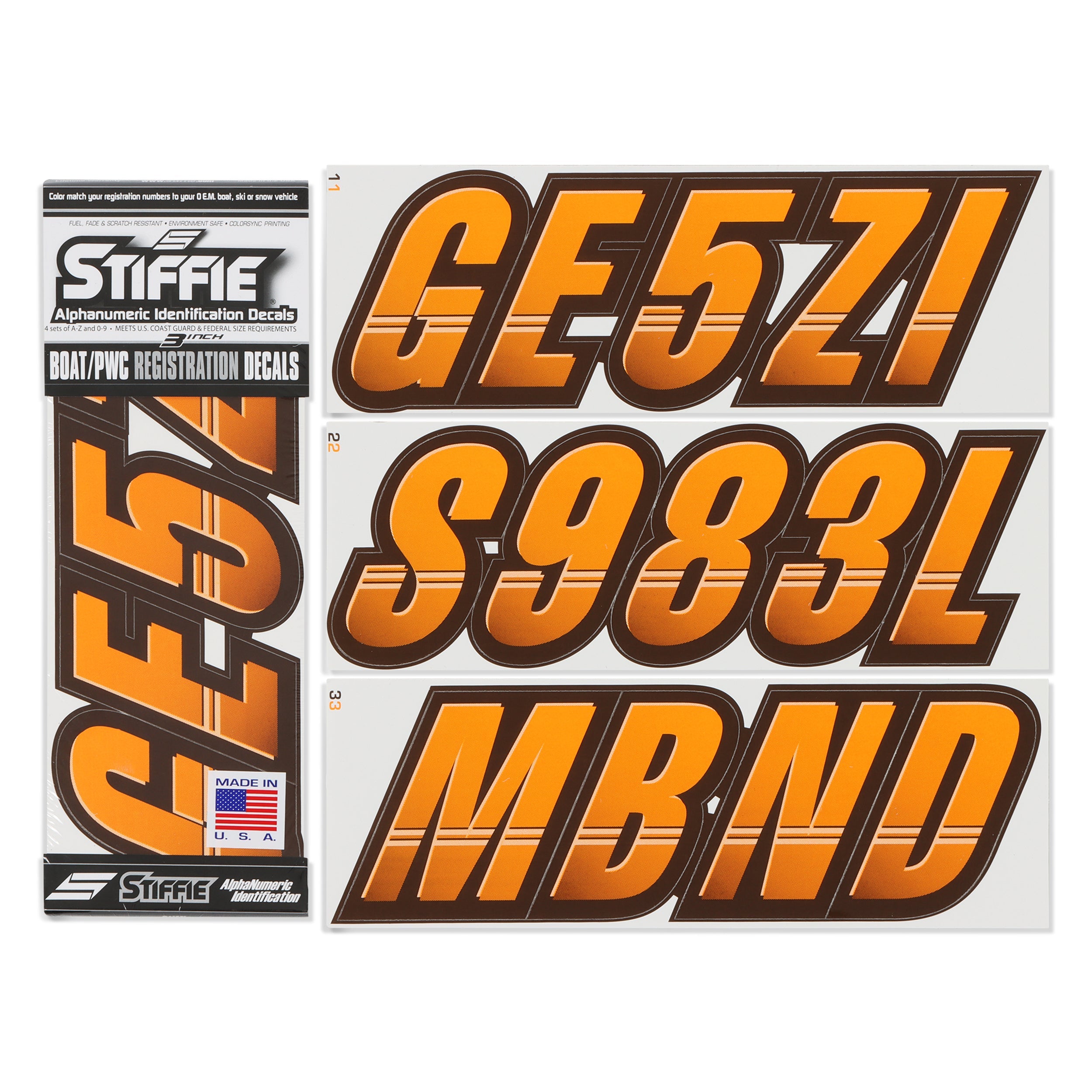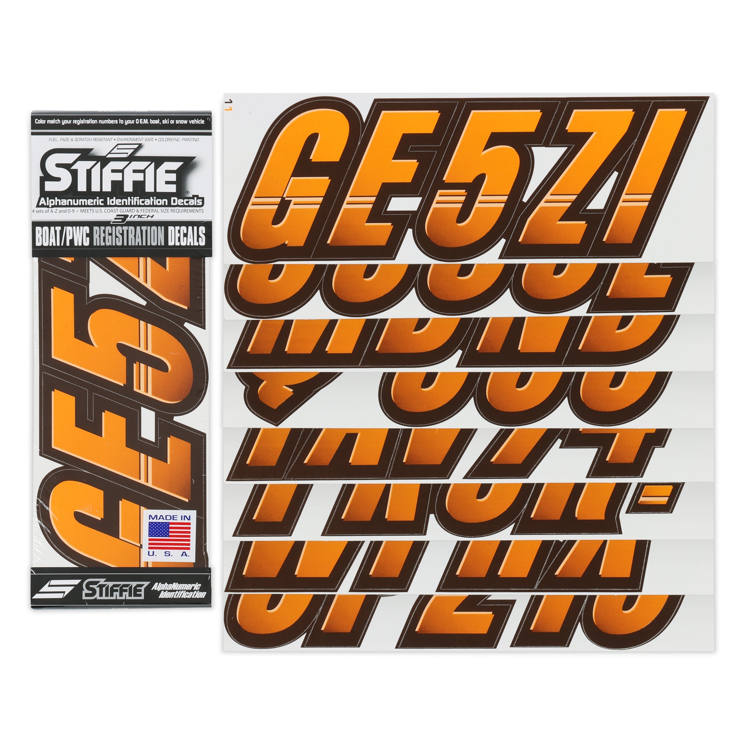 All Alphanumeric ID Kits offered by STIFFIE come with characters that are 3" in height and meet or exceed US Coast Guard Regulations. Every ID kit comes with 4 sets of 0-9 and A-Z decals (146 total decals). STIFFIE Alphanumeric registration decals are resistant to chemical deterioration, fading, curling, tearing and scratching. STIFFIE decals are also UV Coated for protection from harmful ultra-violet (UV) rays.