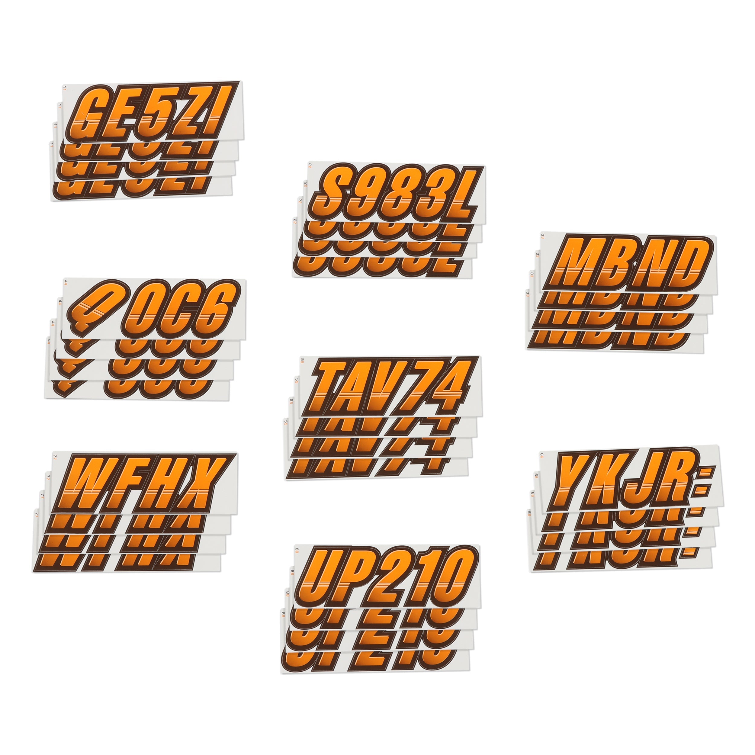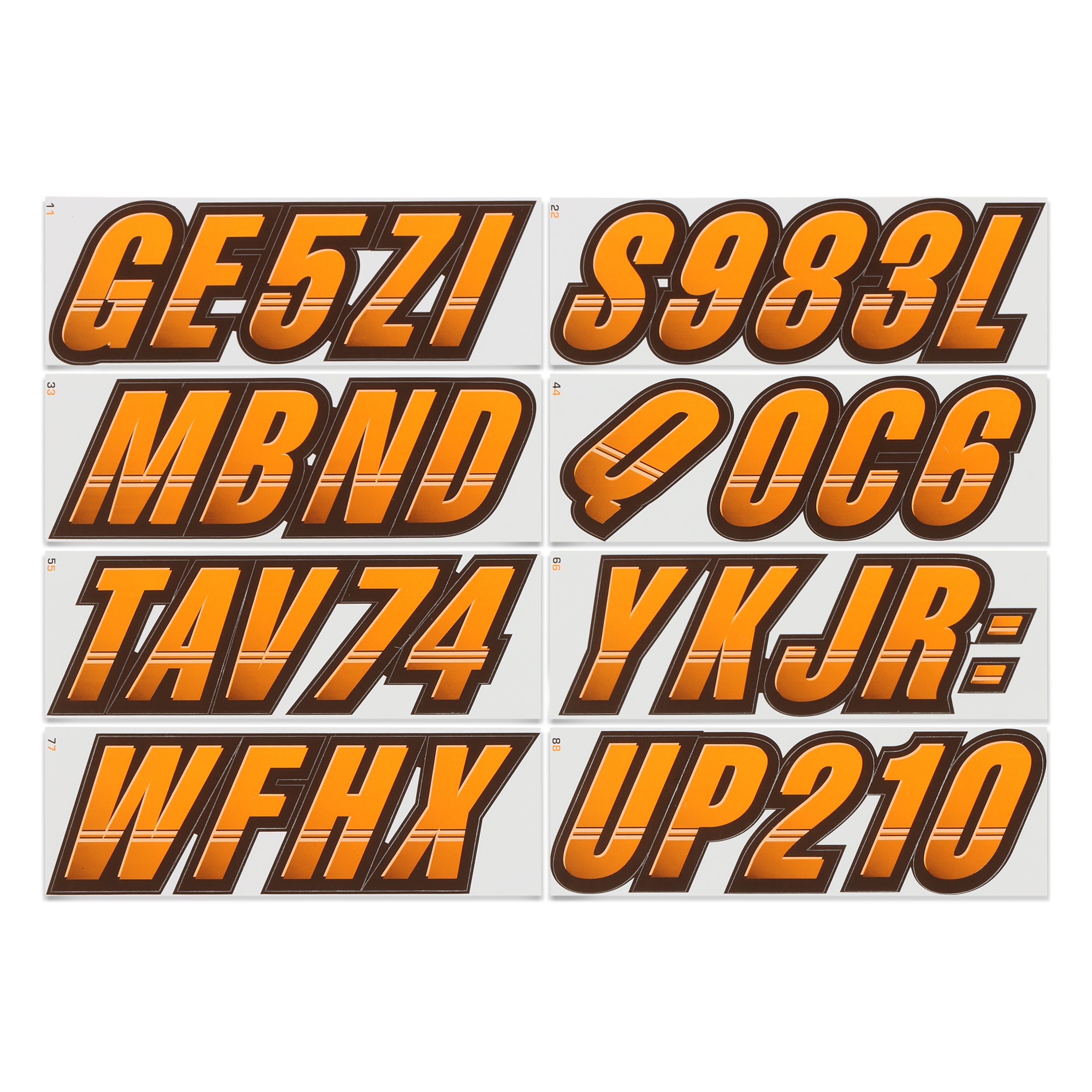 The STIFFIE Techtron™ Alpha Numeric Identification Kit has filled the void for a racing inspired boat registration decal. This style’s two-color design features a forward-facing slant with an exterior color fade-in that graduates from the bottom upward. It’s circle track, auto racing inspired form is the basis of the individual characters which are set off by an interior half toned highlight, providing a 3-dimensional look.