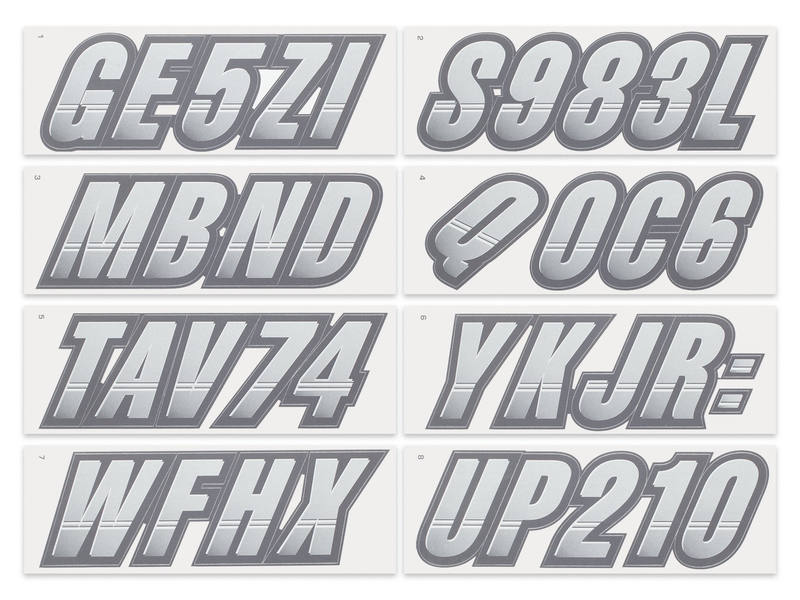 The STIFFIE Techtron™ Alpha Numeric Identification Kit has filled the void for a racing inspired boat registration decal. This style’s two-color design features a forward-facing slant with an exterior color fade-in that graduates from the bottom upward. It’s circle track, auto racing inspired form is the basis of the individual characters which are set off by an interior half toned highlight, providing a 3-dimensional look.