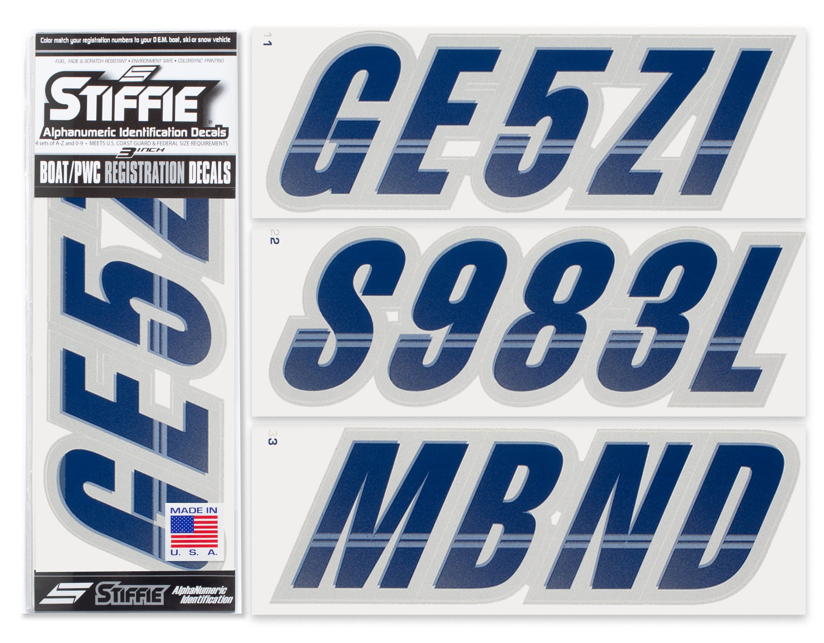 STIFFIE Techtron Navy/Metallic Silver 3” Boat & PWC Registration Decals • Numbers Letters Stickers