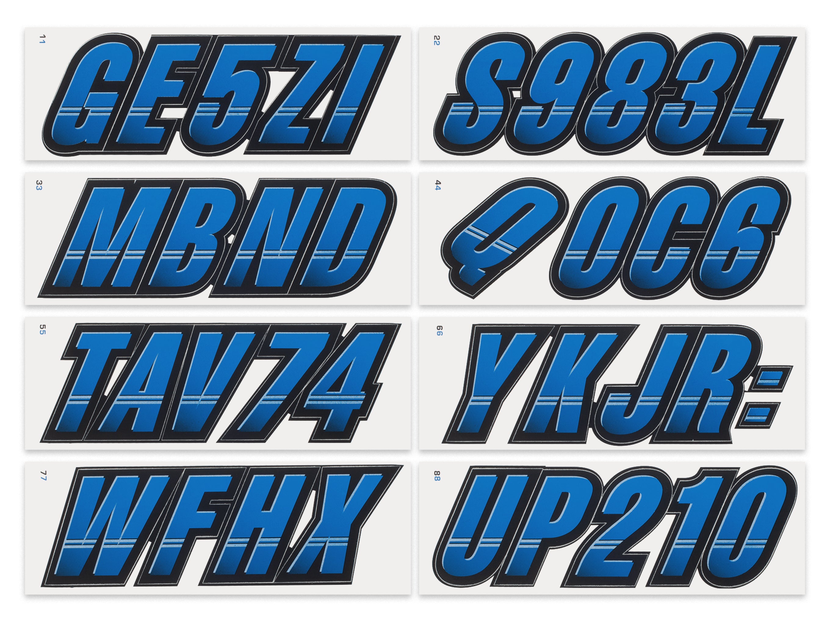 The STIFFIE Techtron™ Alpha Numeric Identification Kit has filled the void for a racing inspired boat registration decal. This style’s two-color design features a forward-facing slant with an exterior color fade-in that graduates from the bottom upward. It’s circle track, auto racing inspired form is the basis of the individual characters which are set off by an interior half toned highlight, providing a 3-dimensional look.