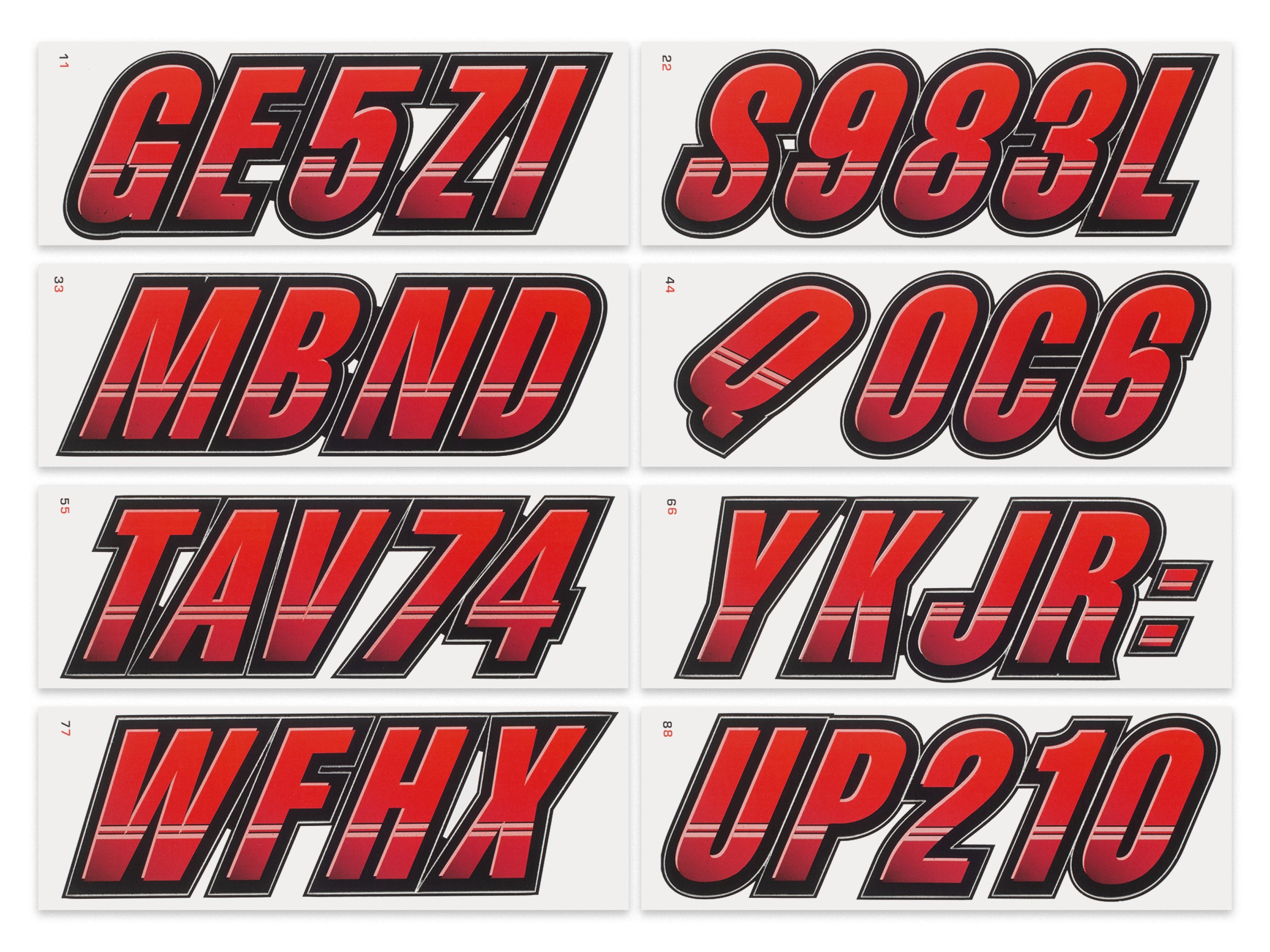 The STIFFIE Techtron™ Alpha Numeric Identification Kit has filled the void for a racing inspired boat registration decal. This style’s two-color design features a forward-facing slant with an exterior color fade-in that graduates from the bottom upward. It’s circle track, auto racing inspired form is the basis of the individual characters which are set off by an interior half toned highlight, providing a 3-dimensional look.