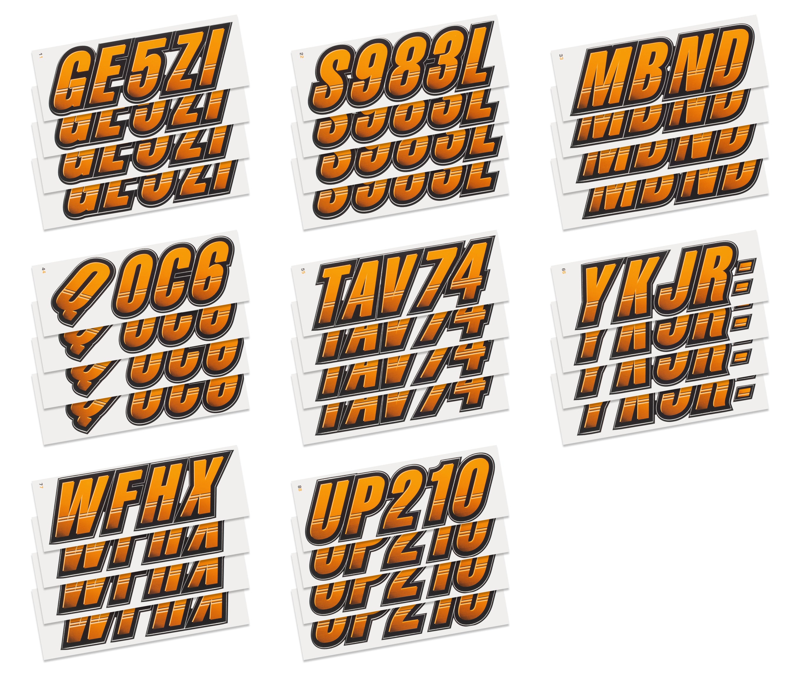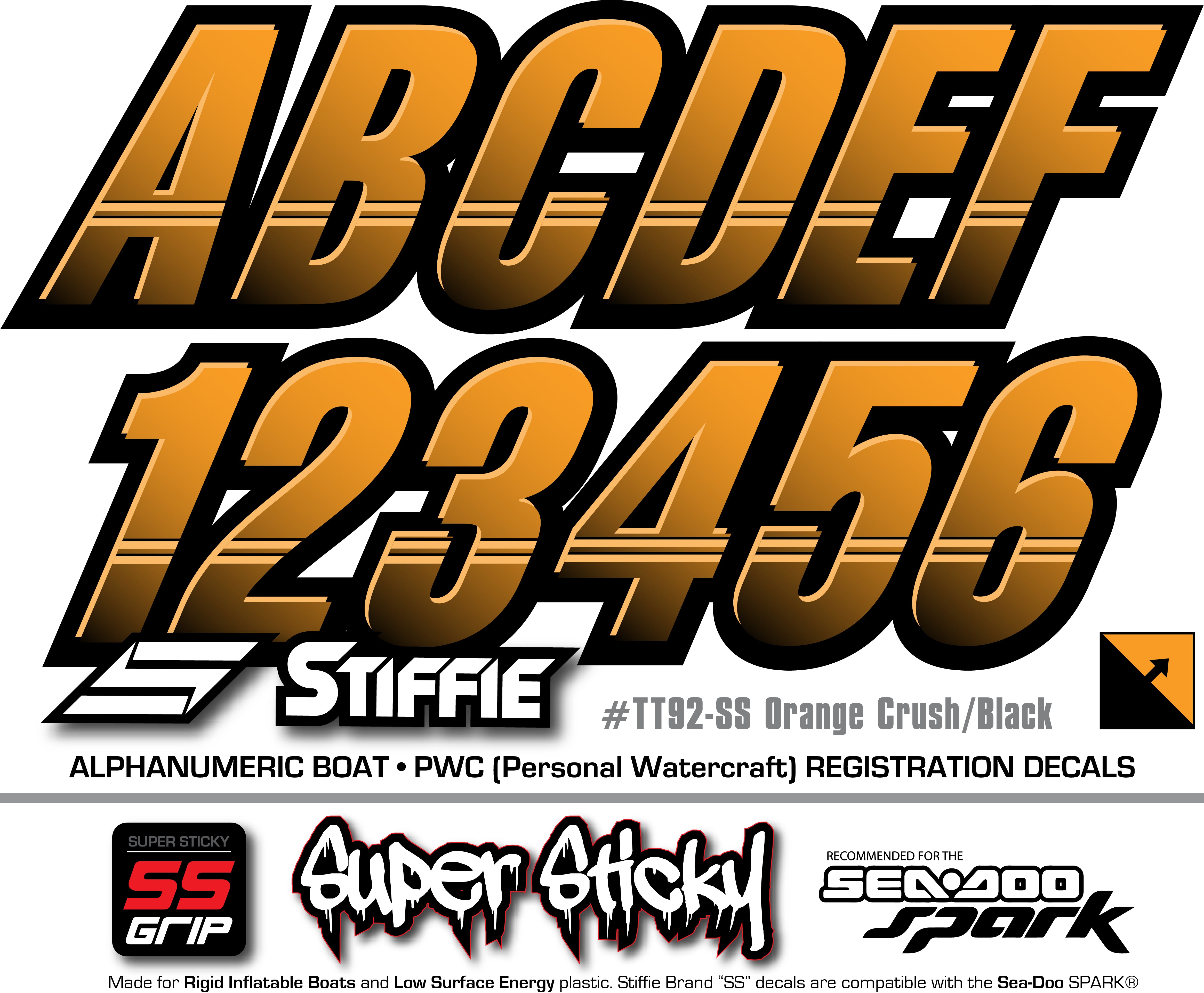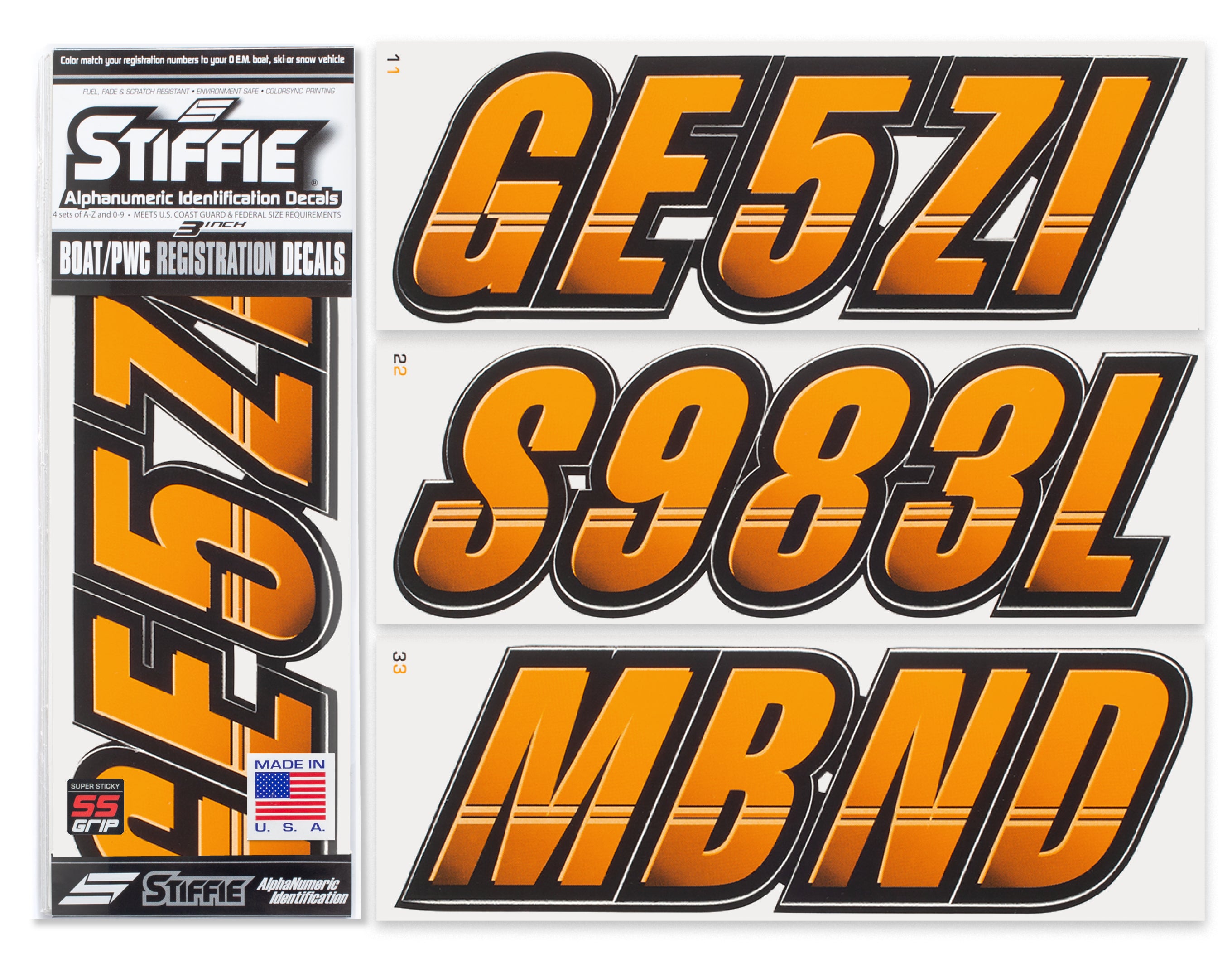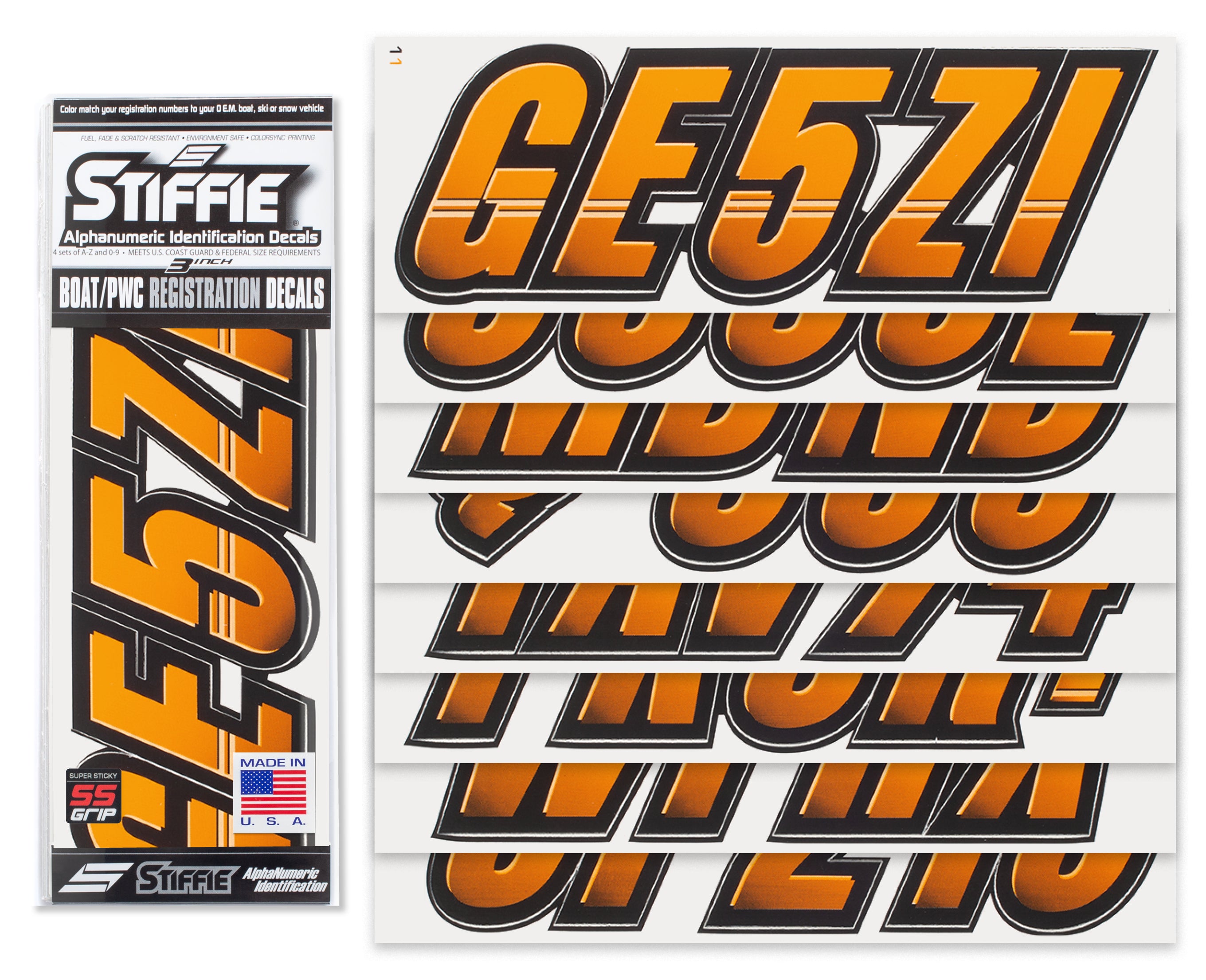 STIFFIE Techtron Orange Crush/Black 3” Super Sticky Boat & PWC Registration Decals • Numbers Letters Stickers