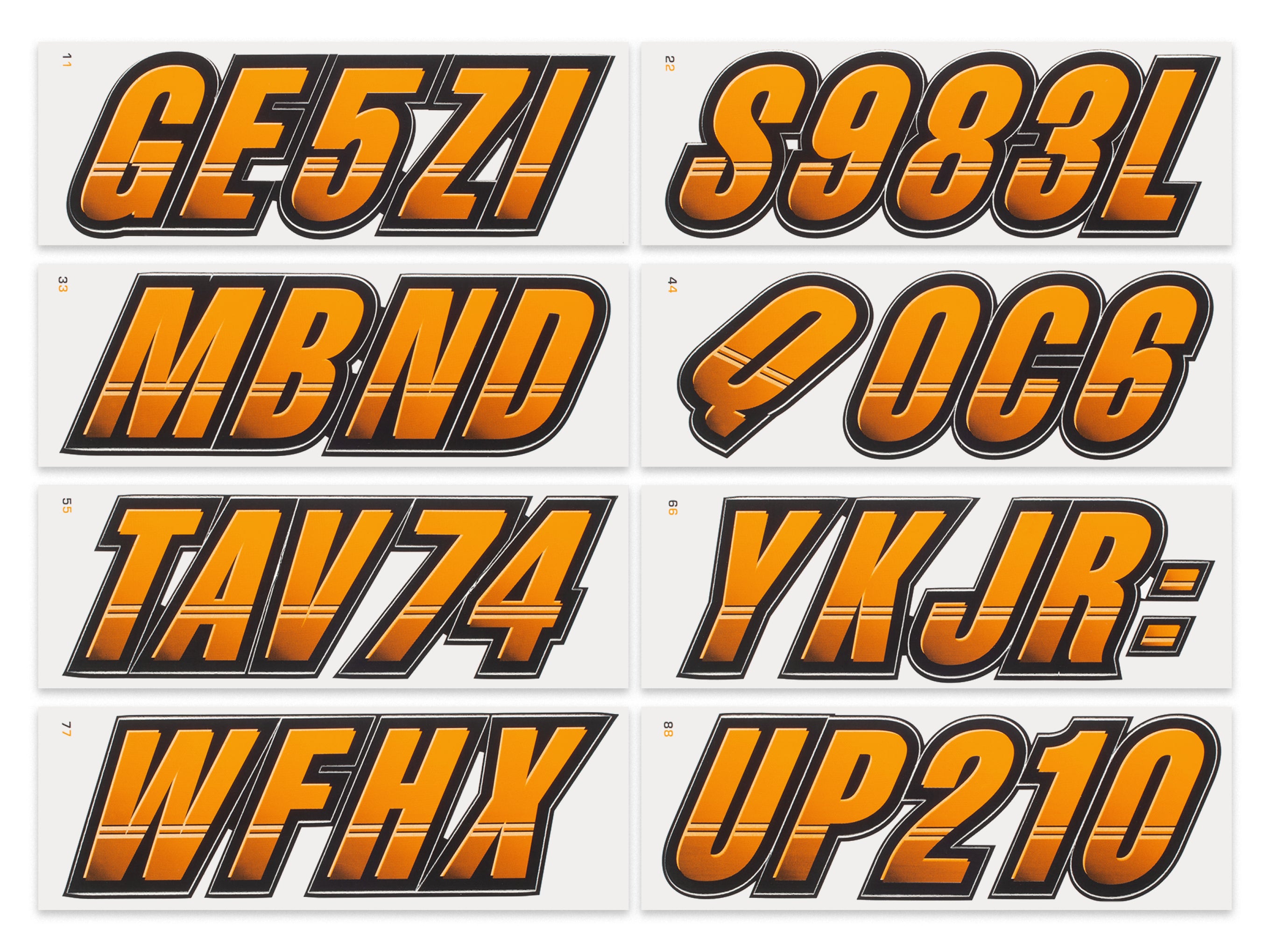 The STIFFIE Techtron™ Alpha Numeric Identification Kit has filled the void for a racing inspired boat registration decal. This style’s two-color design features a forward-facing slant with an exterior color fade-in that graduates from the bottom upward. It’s circle track, auto racing inspired form is the basis of the individual characters which are set off by an interior half toned highlight, providing a 3-dimensional look.