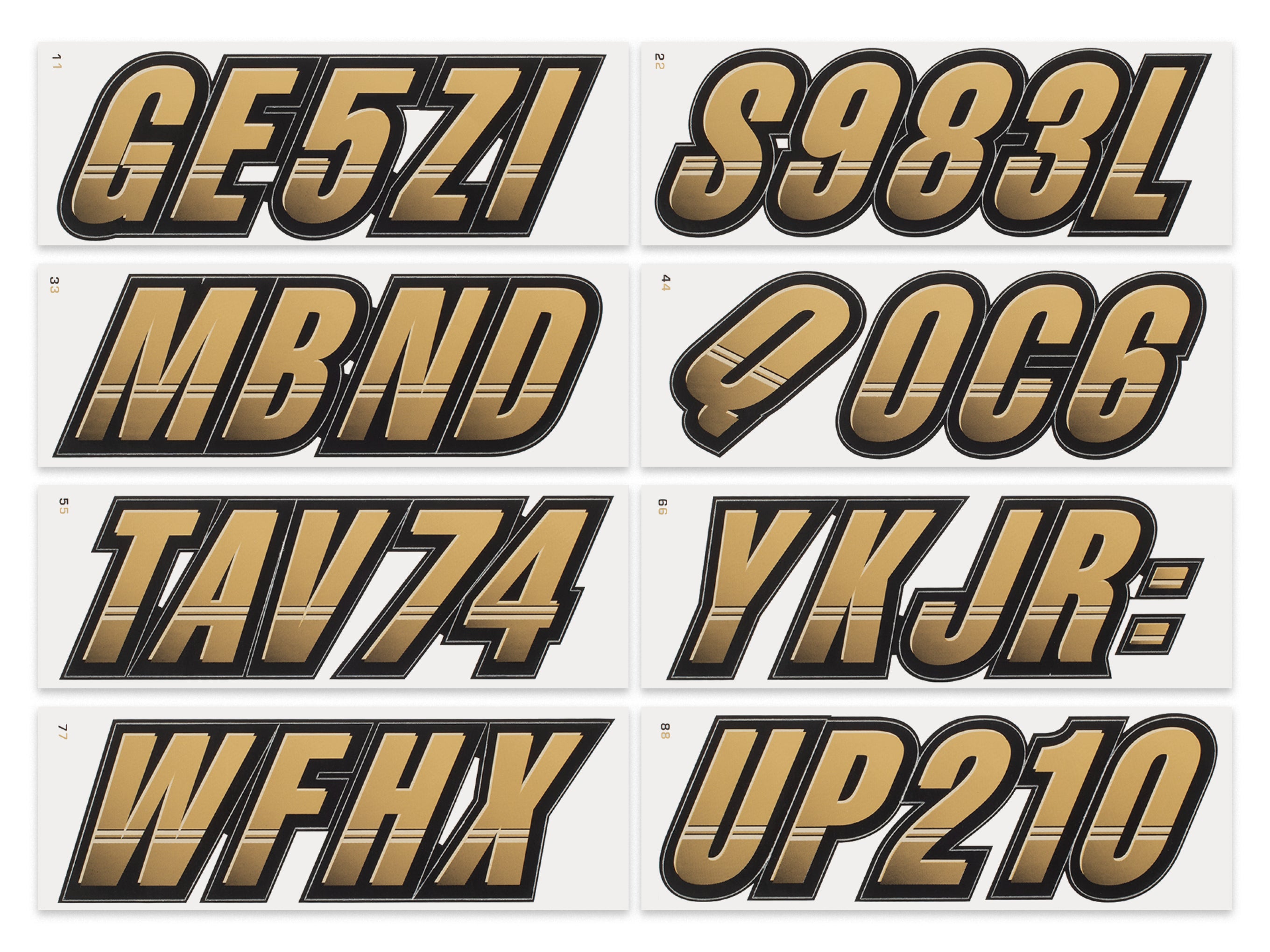The STIFFIE Techtron™ Alpha Numeric Identification Kit has filled the void for a racing inspired boat registration decal. This style’s two-color design features a forward-facing slant with an exterior color fade-in that graduates from the bottom upward. It’s circle track, auto racing inspired form is the basis of the individual characters which are set off by an interior half toned highlight, providing a 3-dimensional look.