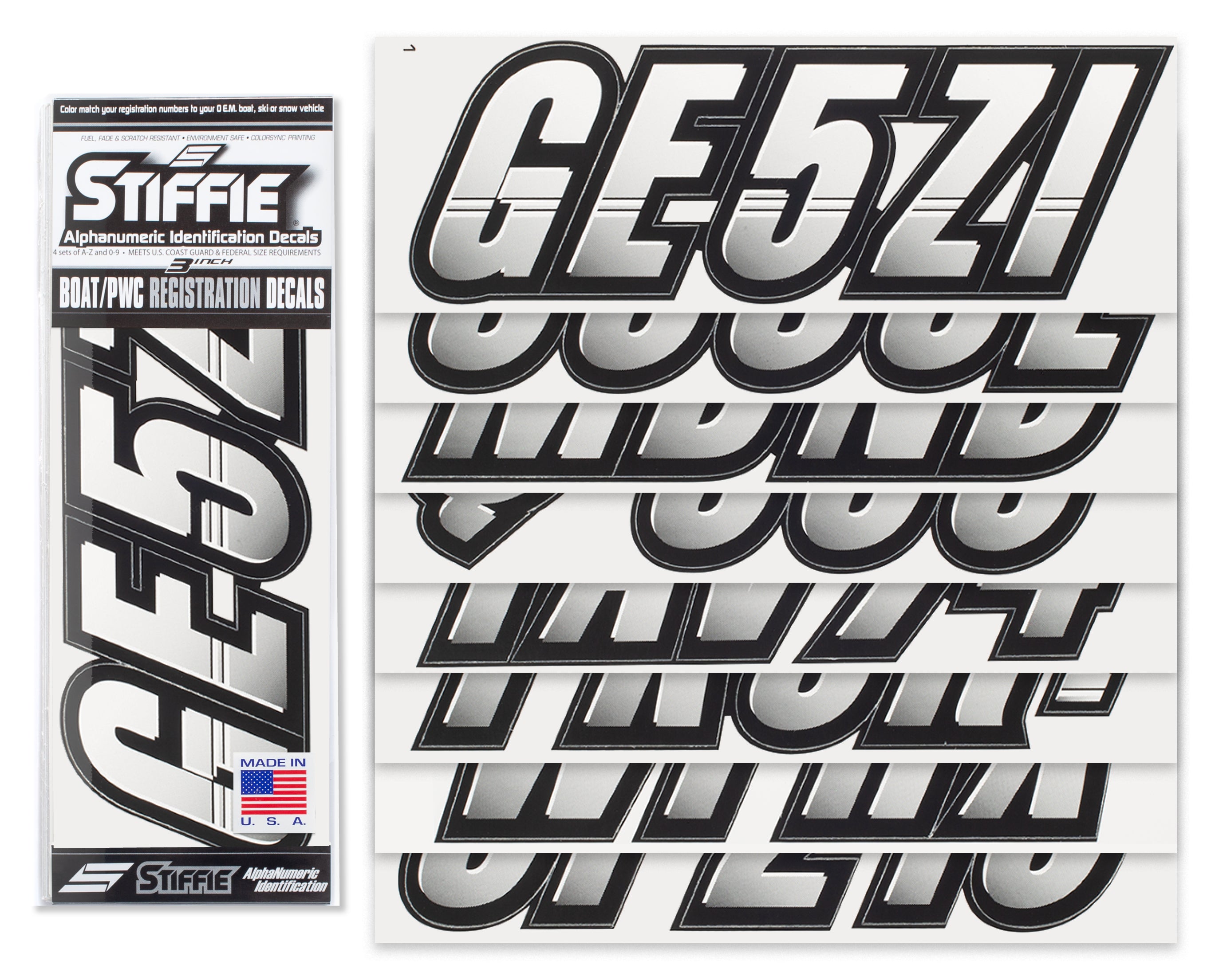 STIFFIE Alphanumeric ID kits are marine registration stickers for all water vessels, boats, personal watercraft. Our decals can also be used for DOT identifier number placement (Department of Transportation), snowmobile registration, or any application that requires the permanent identification or marking of name or number. Our decals are offered in styles and color ways that match your vessels original equipment manufacturer (OEM) color and design scheme.