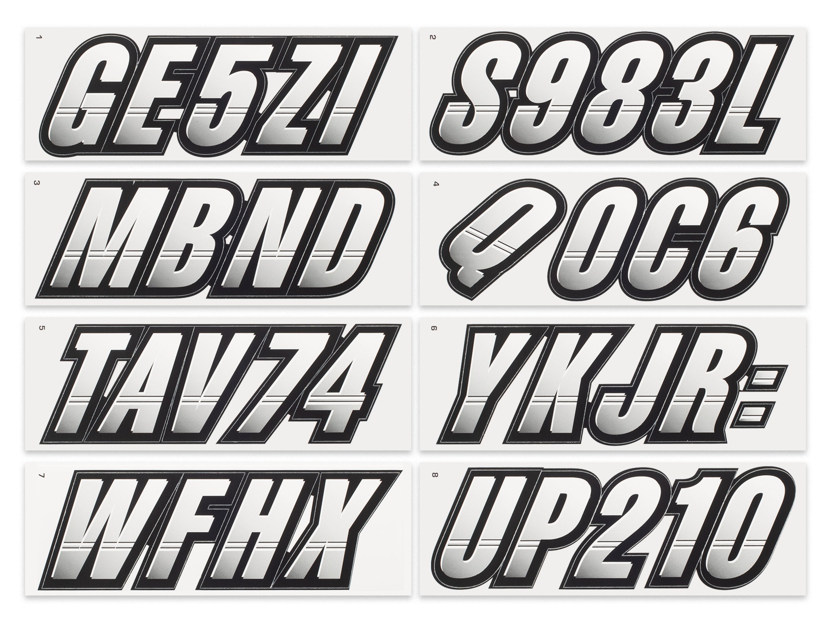 The STIFFIE Techtron™ Alpha Numeric Identification Kit has filled the void for a racing inspired boat registration decal. This style’s two-color design features a forward-facing slant with an exterior color fade-in that graduates from the bottom upward. It’s circle track, auto racing inspired form is the basis of the individual characters which are set off by an interior half toned highlight, providing a 3-dimensional look.