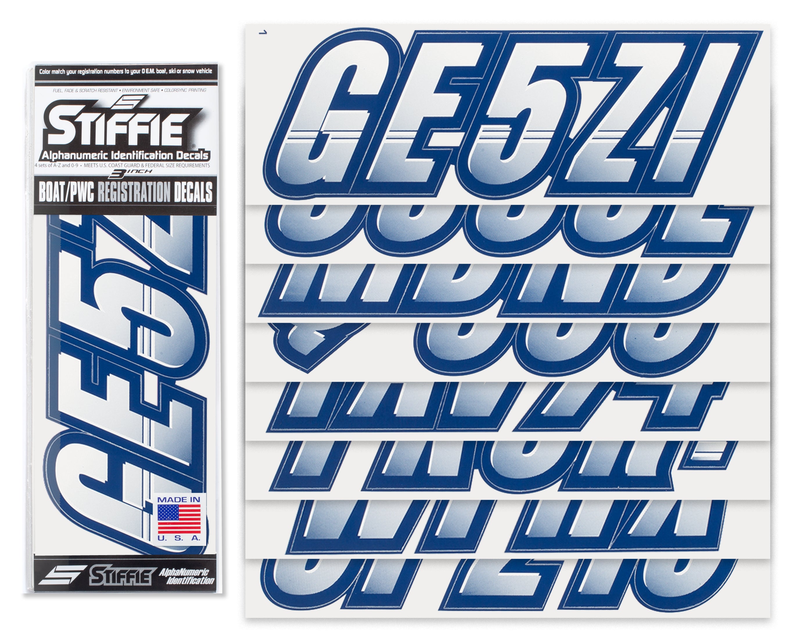 All Alphanumeric ID Kits offered by STIFFIE come with characters that are 3" in height and meet or exceed US Coast Guard Regulations. Every ID kit comes with 4 sets of 0-9 and A-Z decals (146 total decals). STIFFIE Alphanumeric registration decals are resistant to chemical deterioration, fading, curling, tearing and scratching. STIFFIE decals are also UV Coated for protection from harmful ultra-violet (UV) rays.