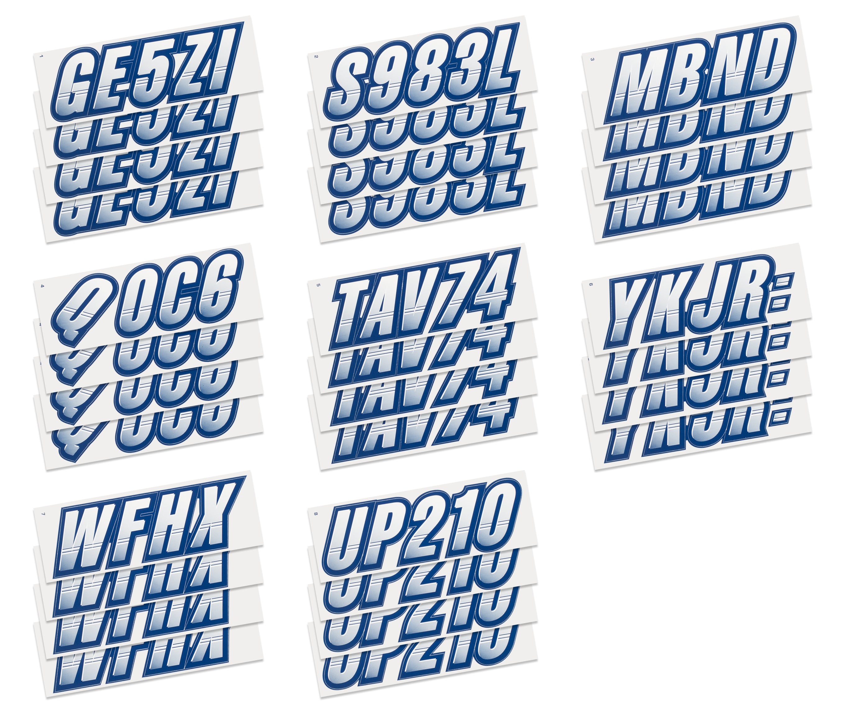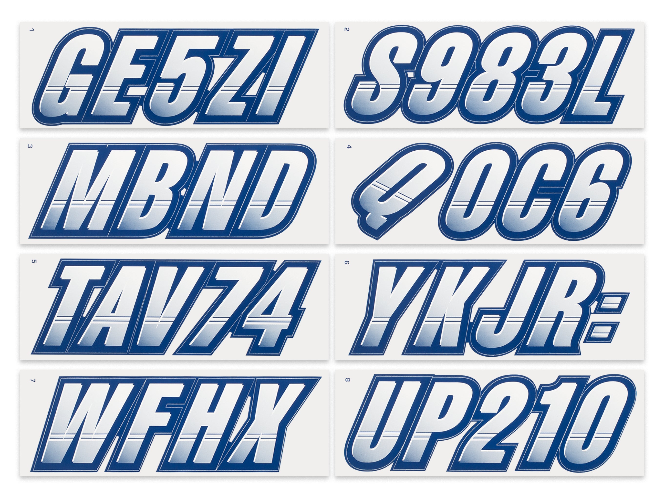The STIFFIE Techtron™ Alpha Numeric Identification Kit has filled the void for a racing inspired boat registration decal. This style’s two-color design features a forward-facing slant with an exterior color fade-in that graduates from the bottom upward. It’s circle track, auto racing inspired form is the basis of the individual characters which are set off by an interior half toned highlight, providing a 3-dimensional look.