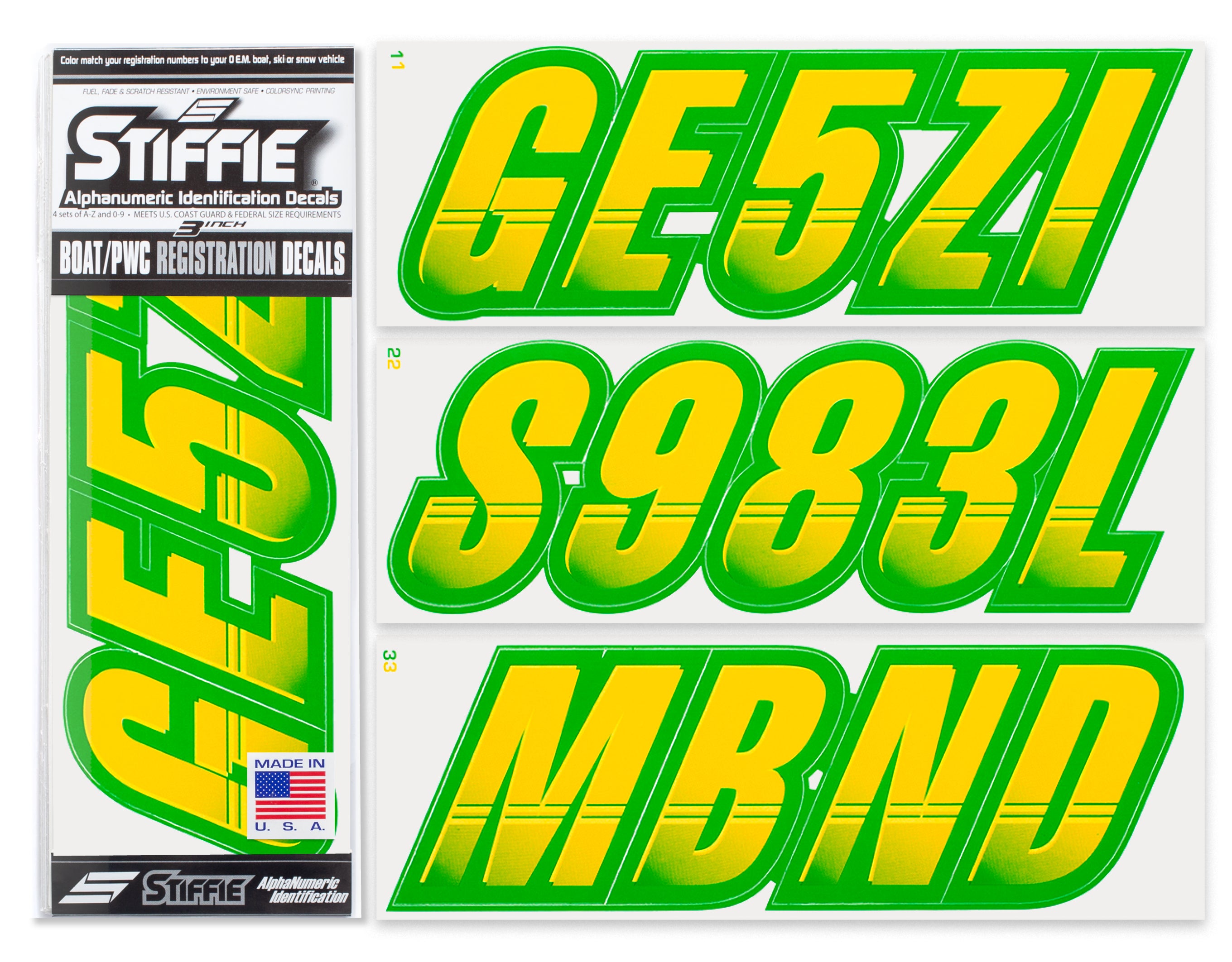 STIFFIE Techtron Yellow/Green 3” Boat & PWC Registration Decals • Numbers Letters Stickers