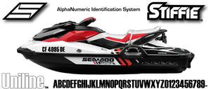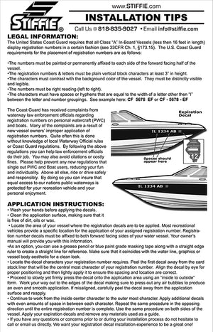 The STIFFIE Uniline Alpha Numeric Identification Kit is our original one-color design. It is a basic block style with a touch of flair. It has a semi-bold flavor with rounded corners and no slant. It is your standard one-color kit at an economical low price. If visibility, definition, legality and economy are your number one concern, then this is the registration kit for you! STIFFIE decals are made to match your OEM Boat, Marine Vessel or Personal Watercraft using our COLOR CLONE print.