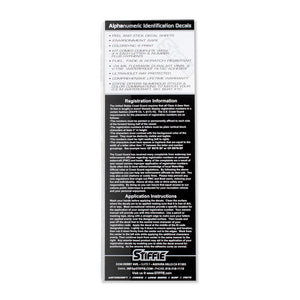 - All STIFFIE kits include 4 each of the letters A-Z and the numbers 0-9 for a total of 146 decals.