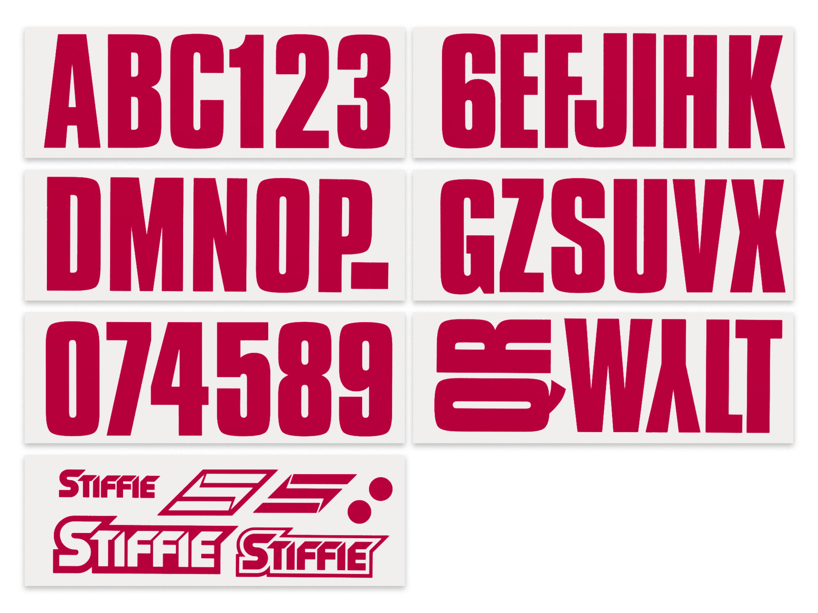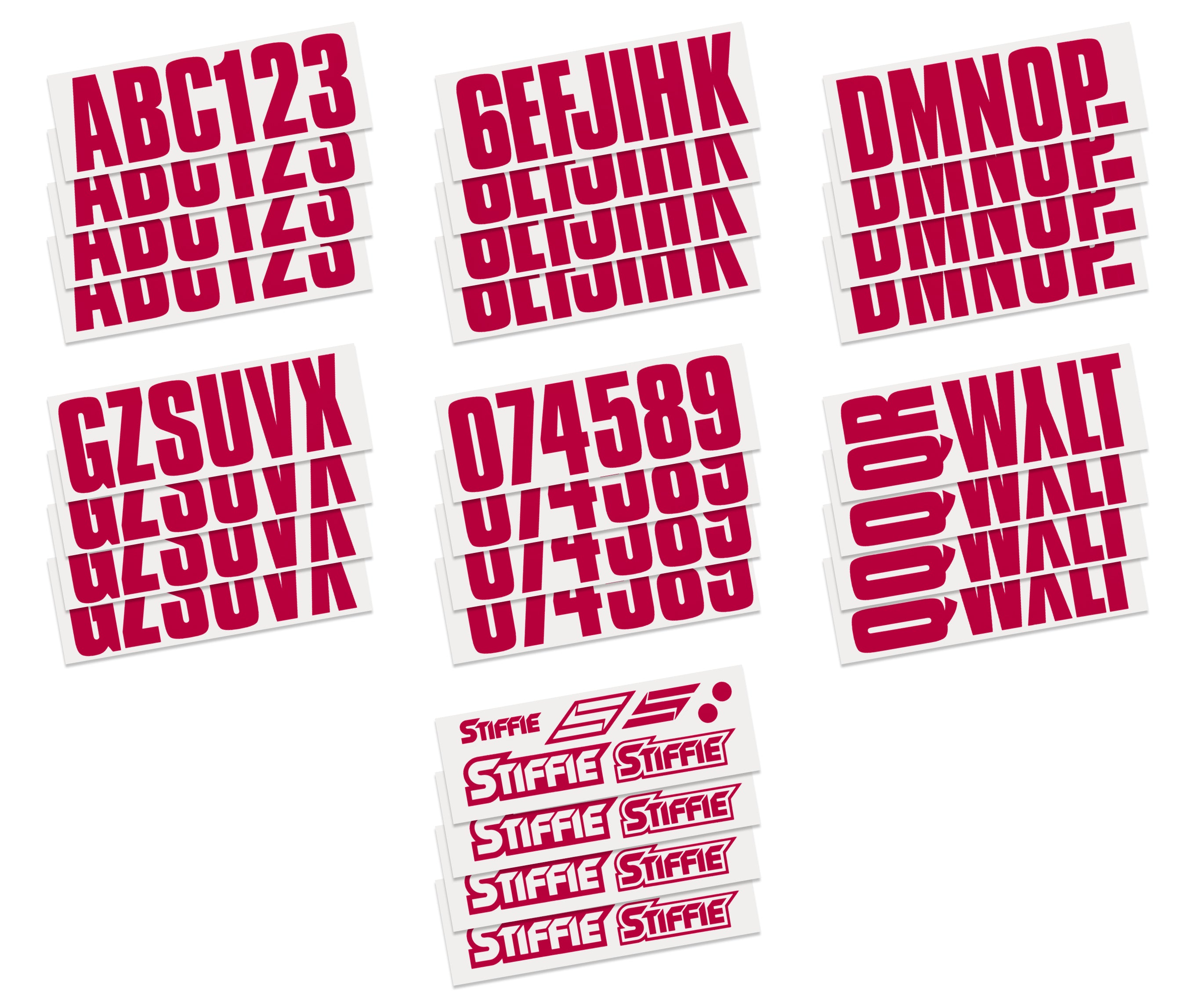 - All STIFFIE kits include 4 each of the letters A-Z and the numbers 0-9 for a total of 146 decals.