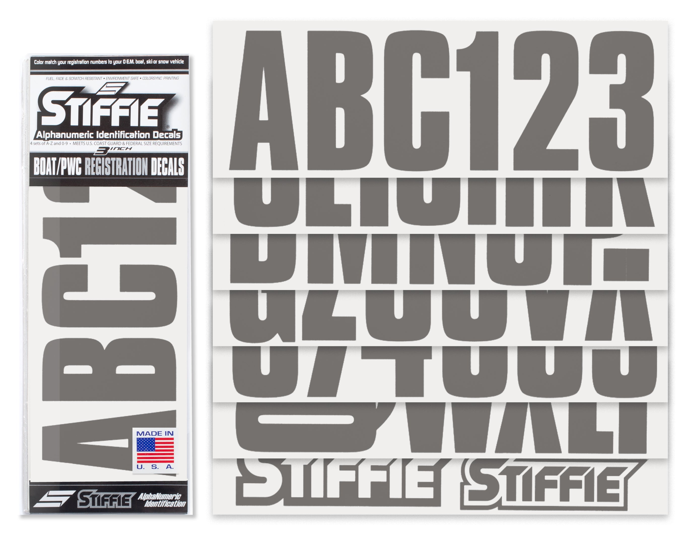 The STIFFIE Uniline Alpha Numeric Identification Kit is our original one-color design. It is a basic block style with a touch of flair. It has a semi-bold flavor with rounded corners and no slant. It is your standard one-color kit at an economical low price. If visibility, definition, legality and economy are your number one concern, then this is the registration kit for you! STIFFIE decals are made to match your OEM Boat, Marine Vessel or Personal Watercraft using our COLOR CLONE print.