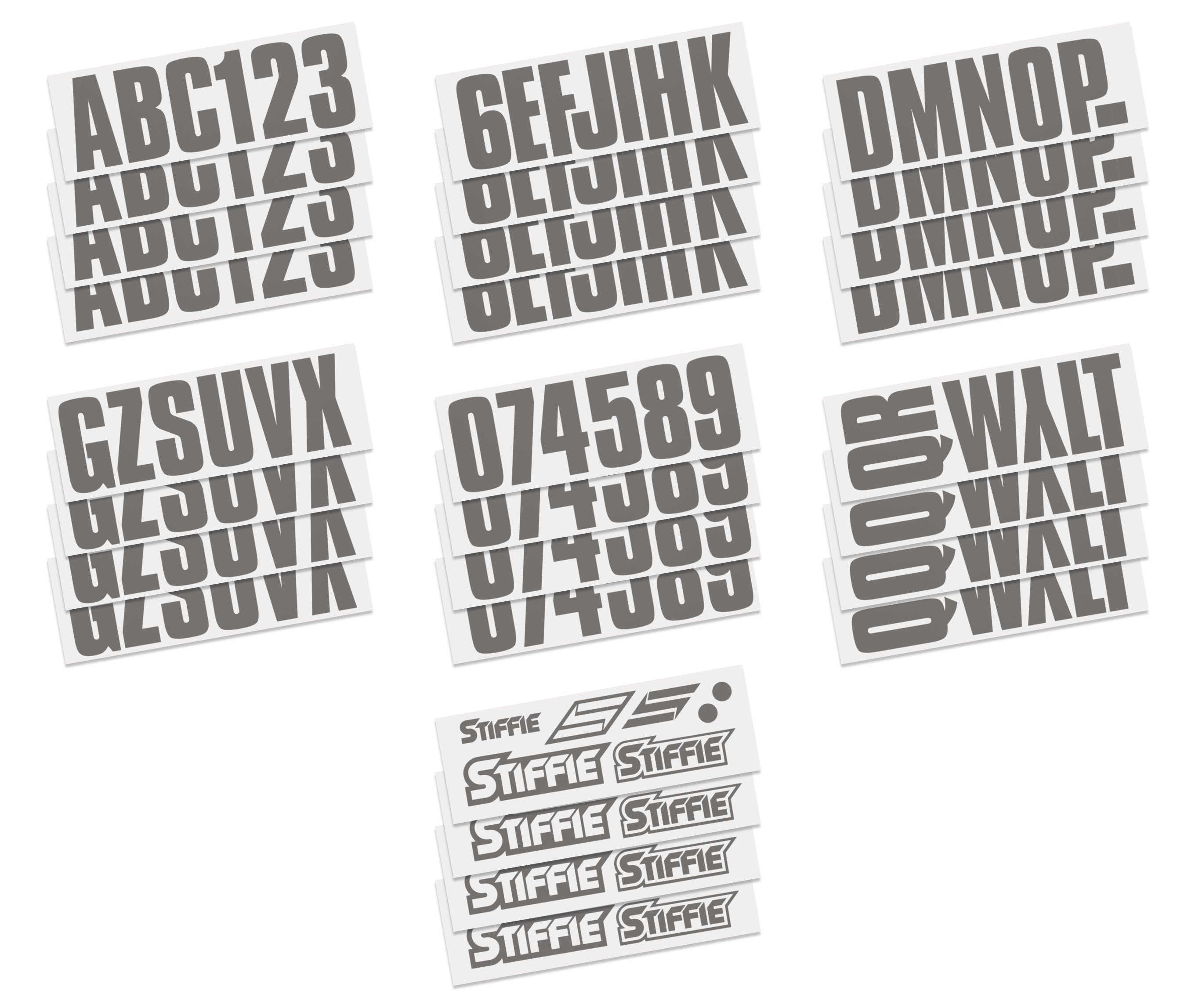 - All STIFFIE kits include 4 each of the letters A-Z and the numbers 0-9 for a total of 146 decals.