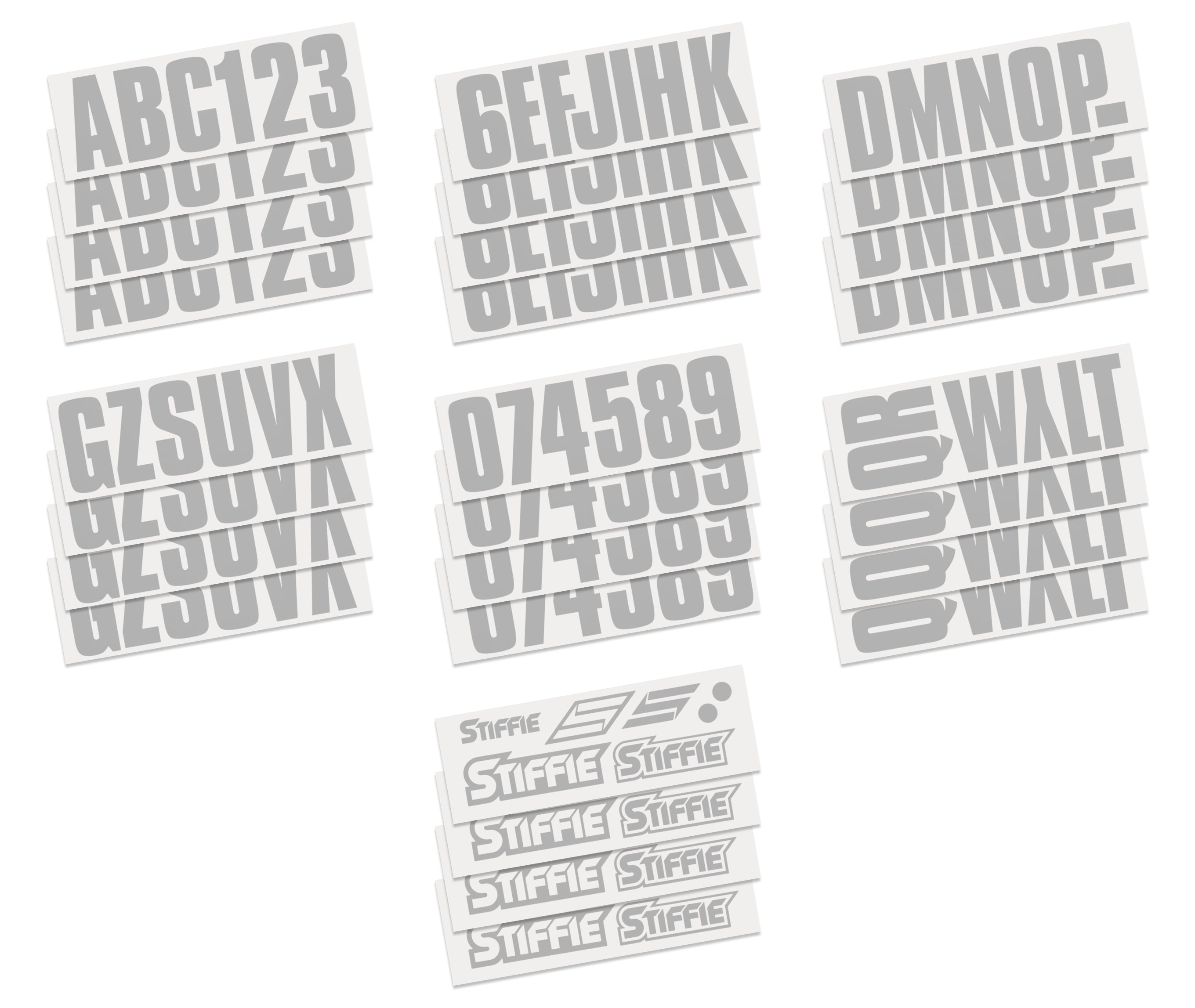 - All STIFFIE kits include 4 each of the letters A-Z and the numbers 0-9 for a total of 146 decals.
