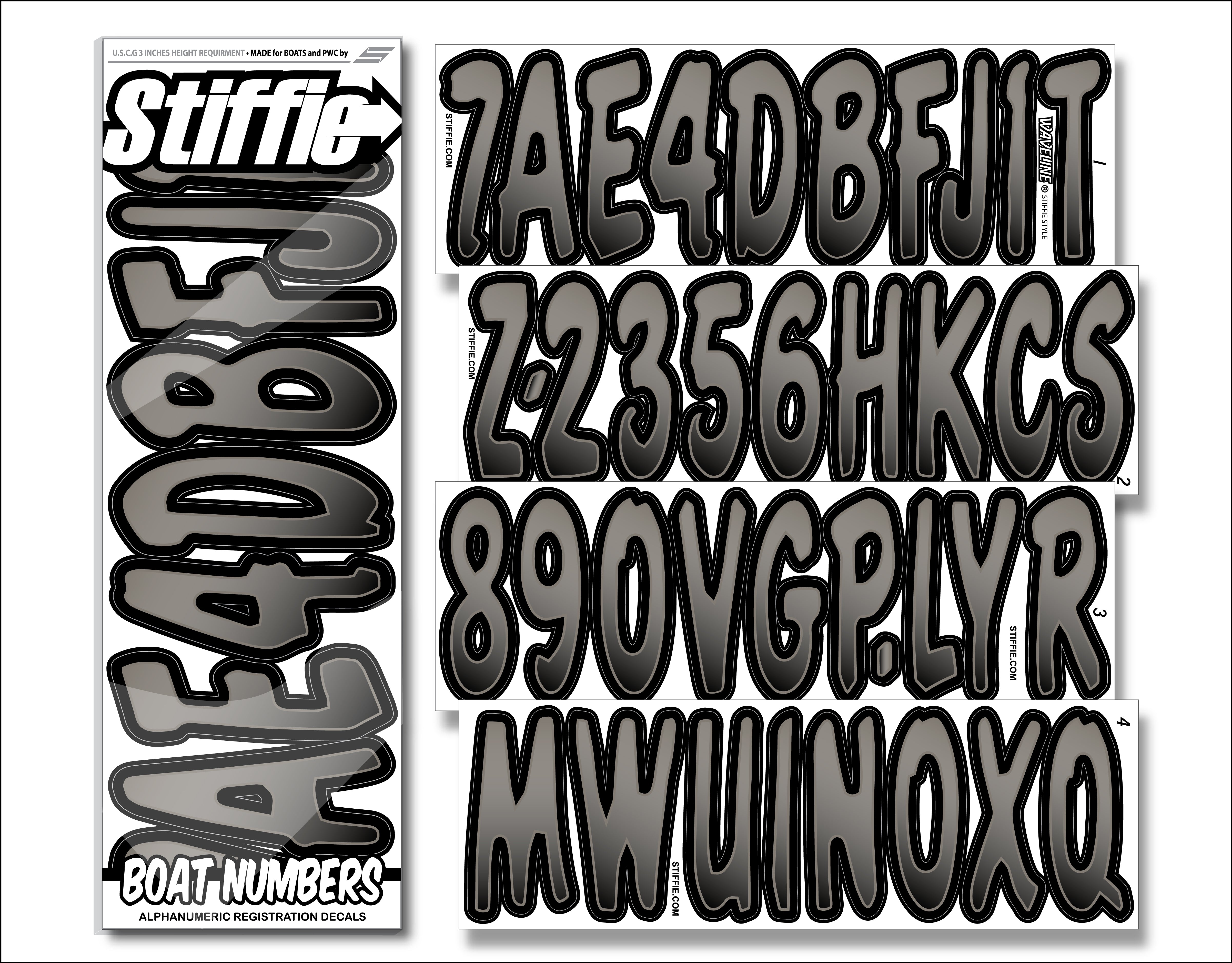 STIFFIE Waveline Charcoal/Black 3” Boat & PWC Registration Decals • Numbers Letters Stickers