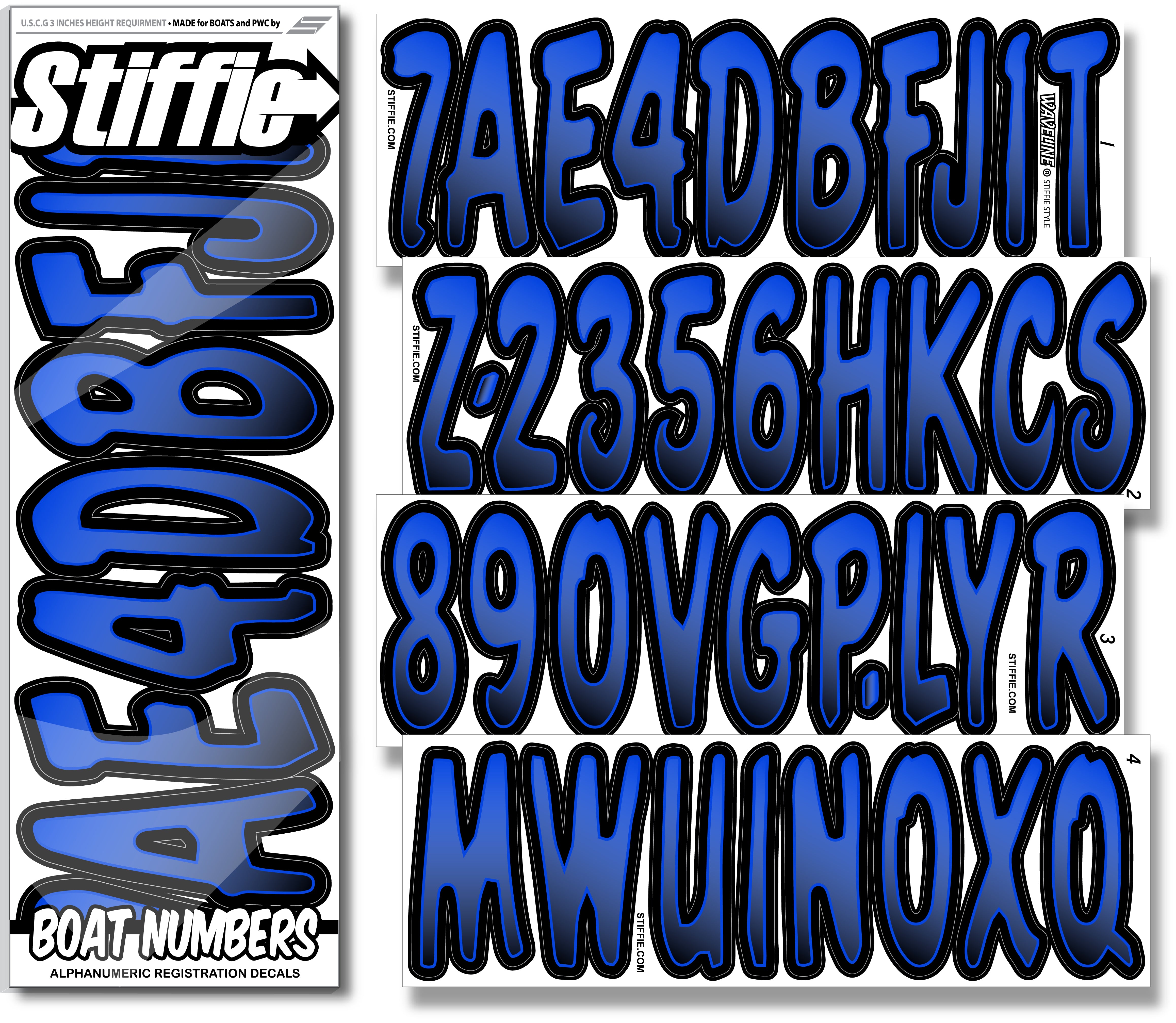 STIFFIE Waveline Blue/Black 3” Boat & PWC Registration Decals • Numbers Letters Stickers