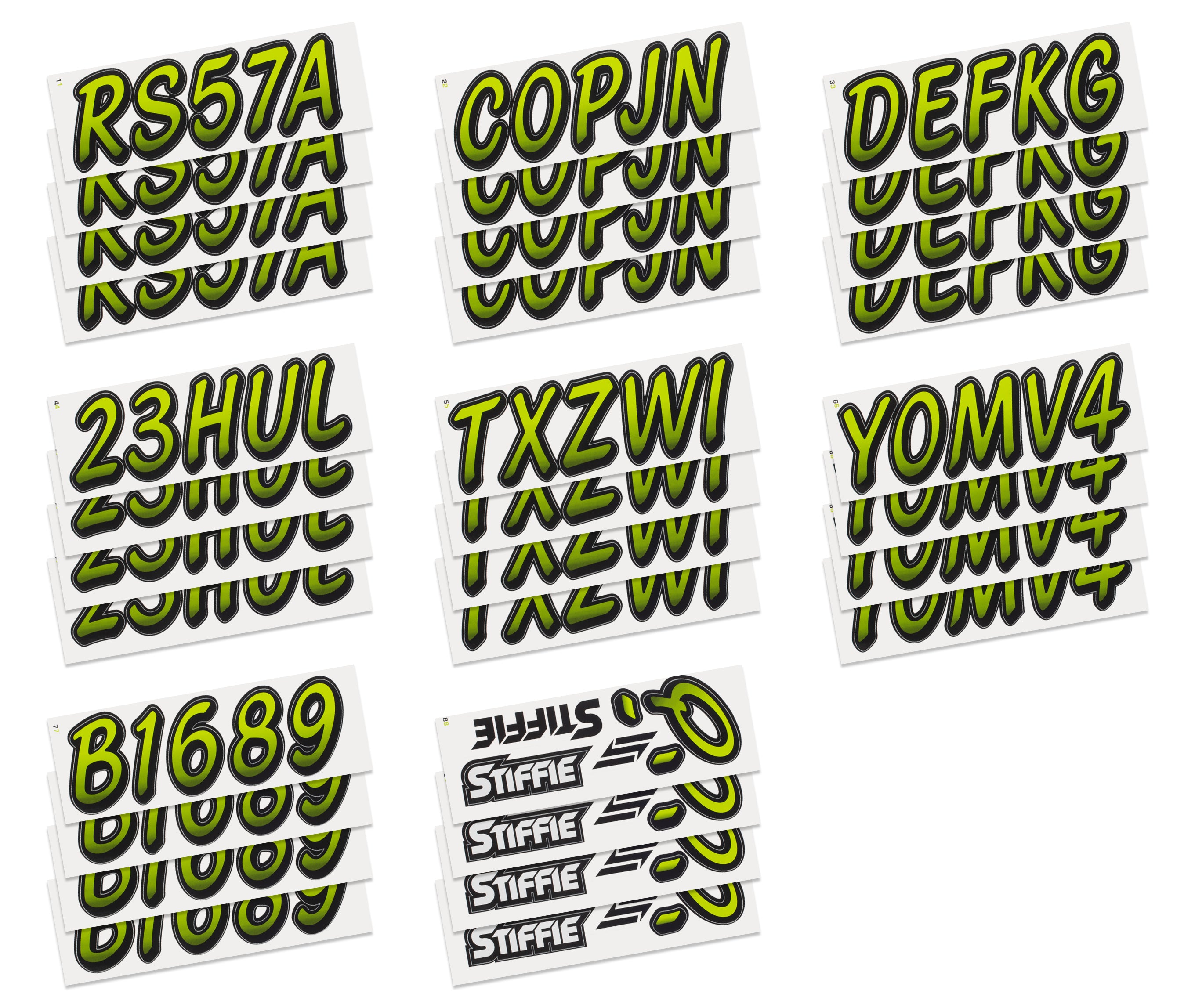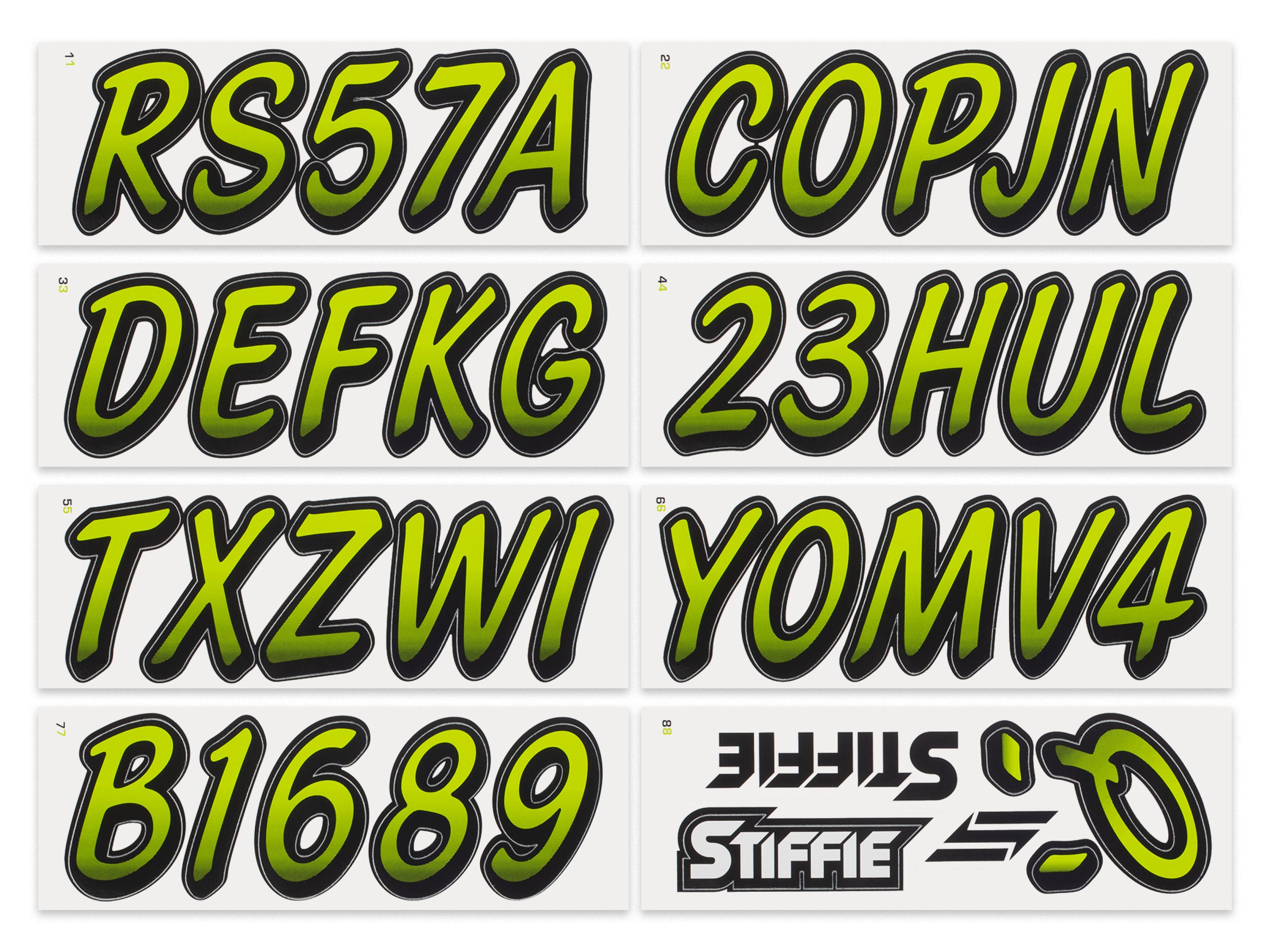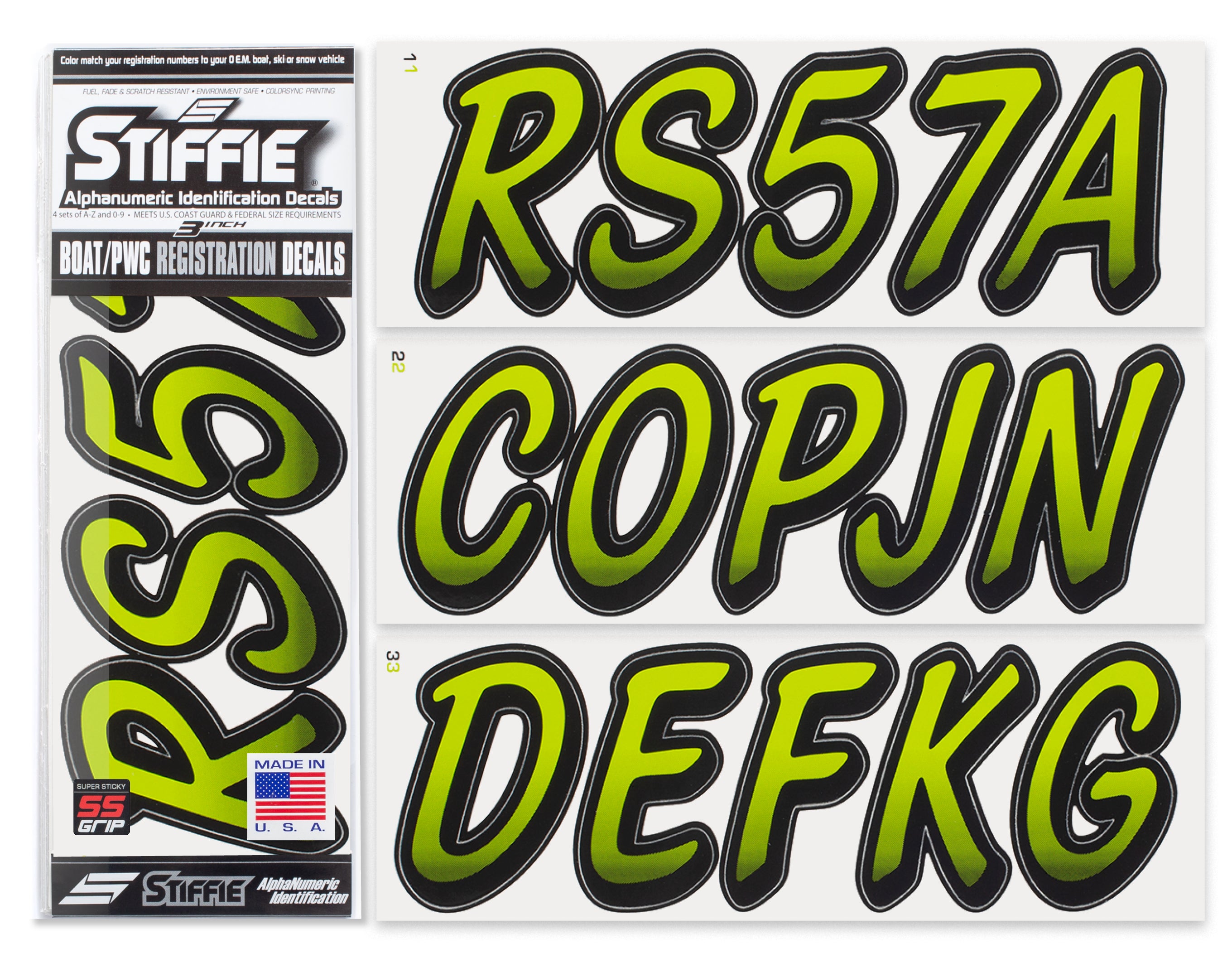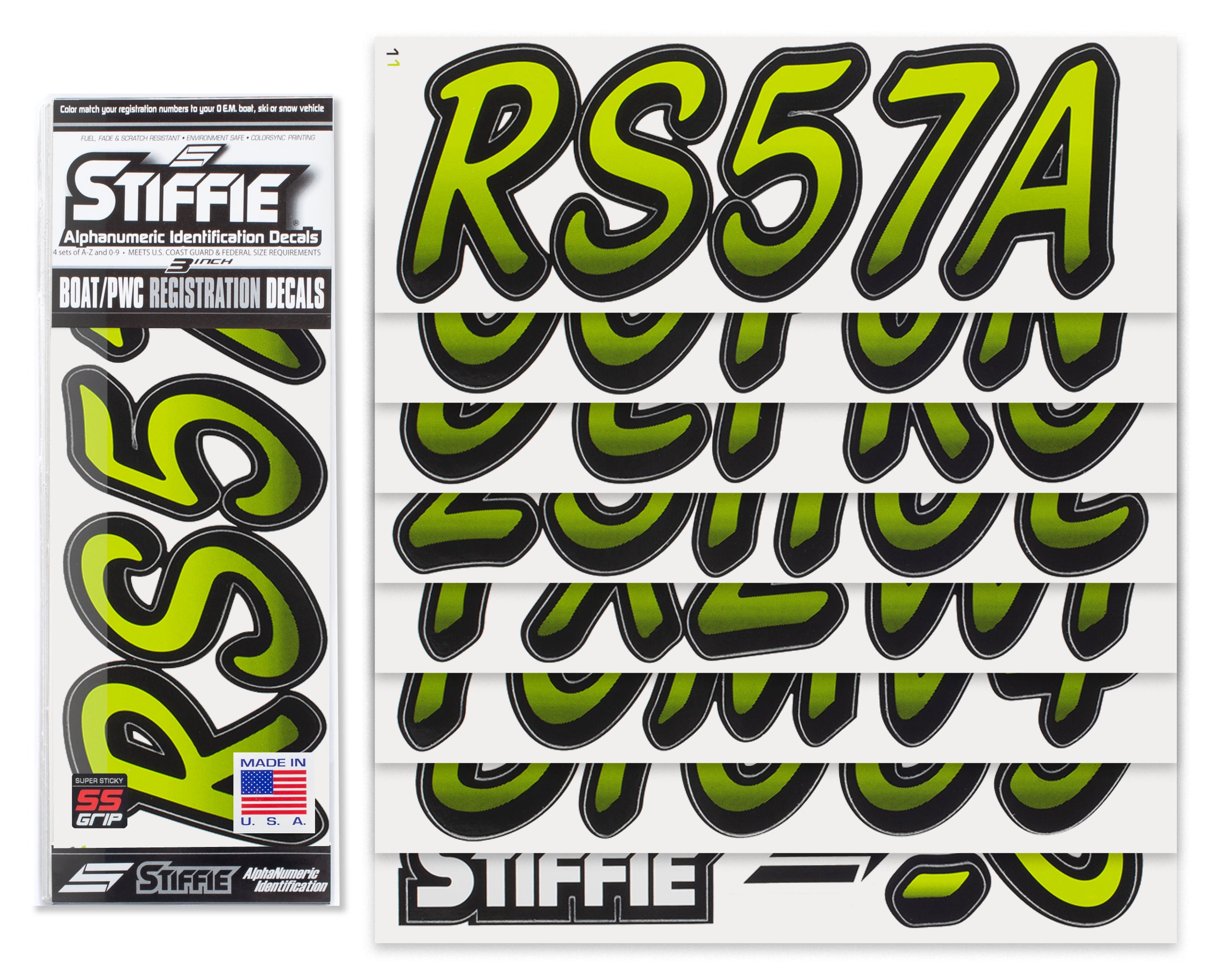 STIFFIE Whipline Atomic Green/Black 3" Super Sticky Boat & PWC Registration Decals • Numbers Letters Stickers