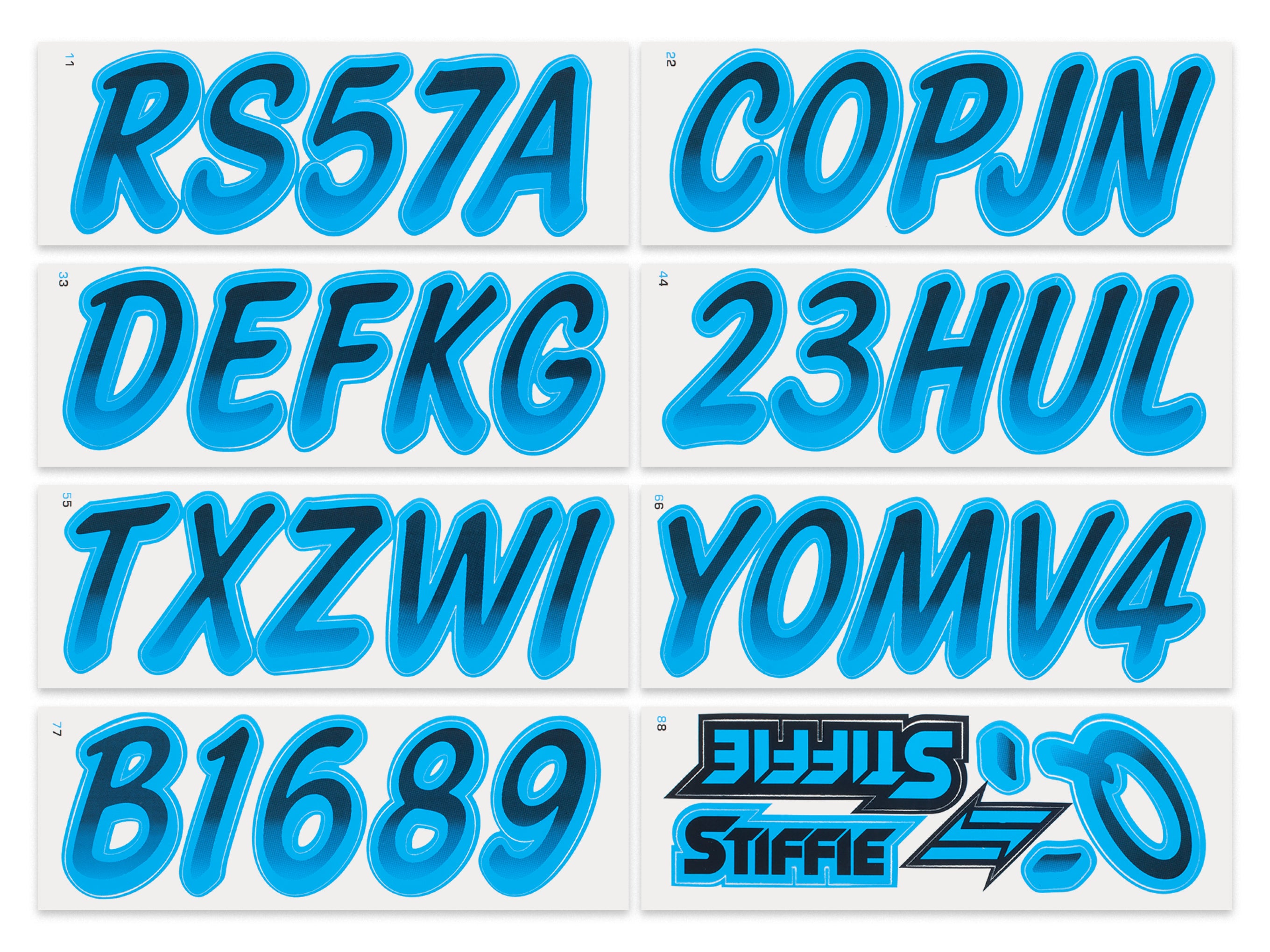 STIFFIE Alphanumeric ID kits are marine registration stickers for all water vessels, boats, personal watercraft. Our decals can also be used for DOT identifier number placement (Department of Transportation), snowmobile registration, or any application that requires the permanent identification or marking of name or number. Our decals are offered in styles and color ways that match your vessels original equipment manufacturer (OEM) color and design scheme.