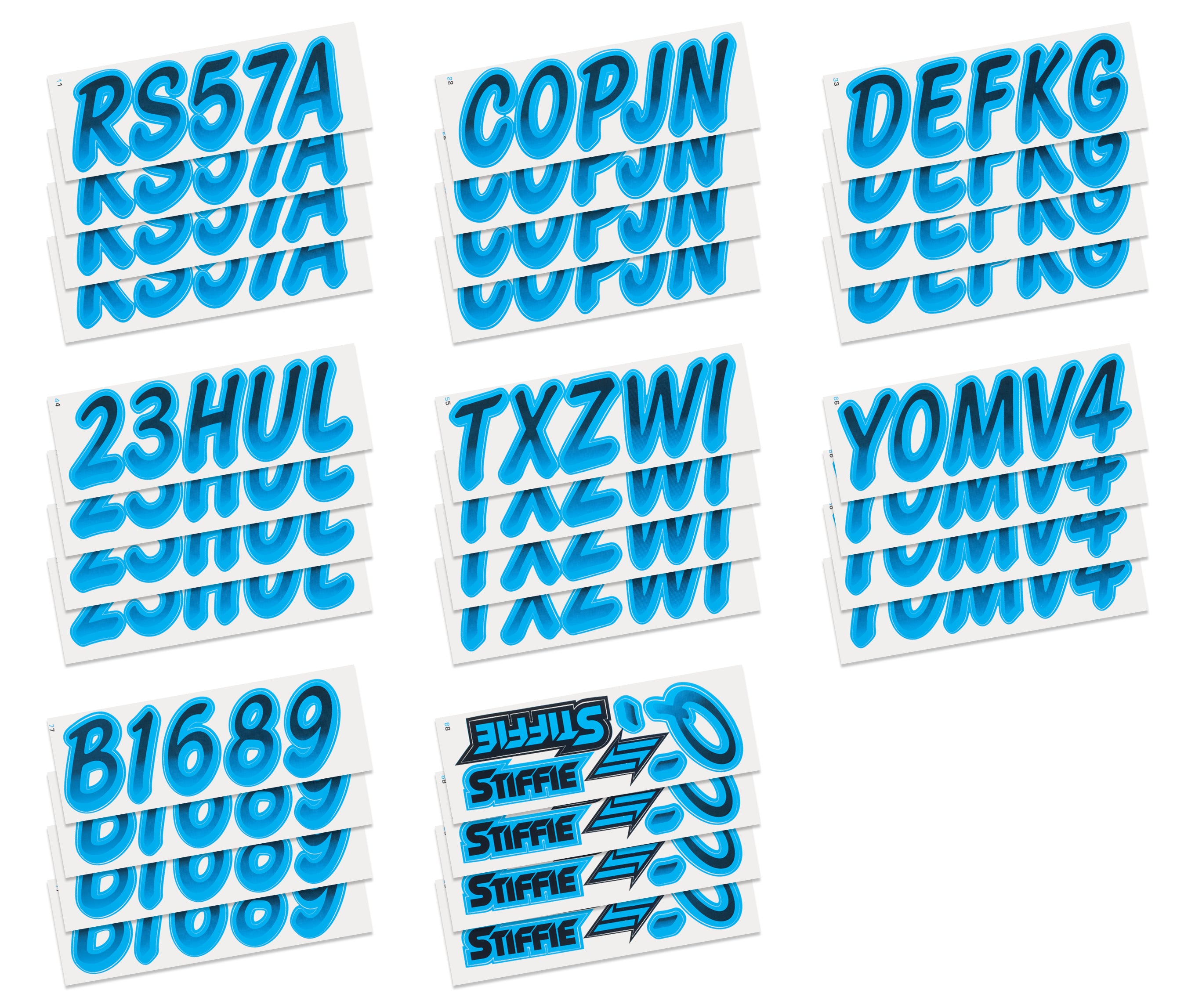 All Alphanumeric ID Kits offered by STIFFIE come with characters that are 3" in height and meet or exceed US Coast Guard Regulations. Every ID kit comes with 4 sets of 0-9 and A-Z decals (146 total decals). STIFFIE Alphanumeric registration decals are resistant to chemical deterioration, fading, curling, tearing and scratching. STIFFIE decals are also UV Coated for protection from harmful ultra-violet (UV) rays.