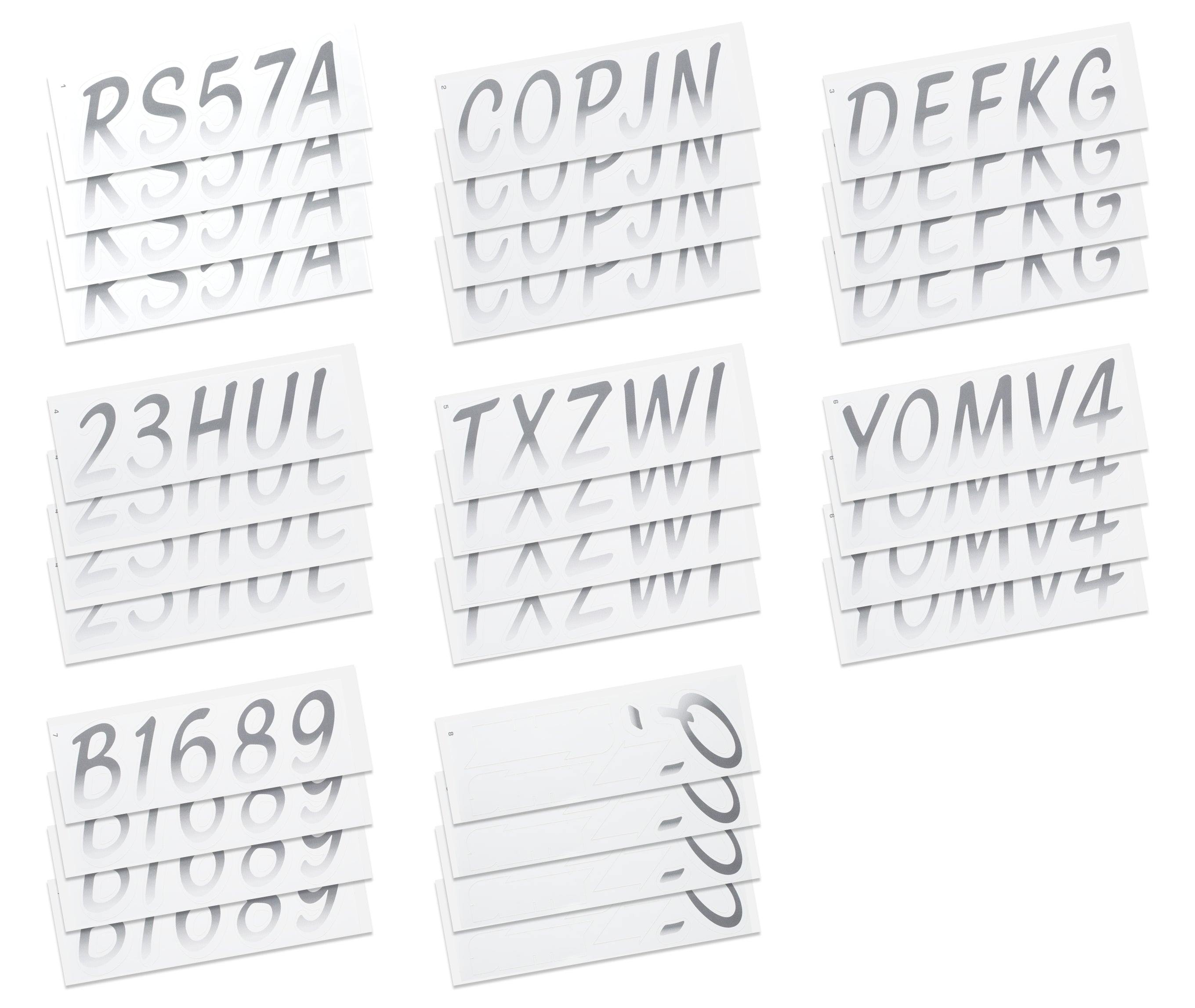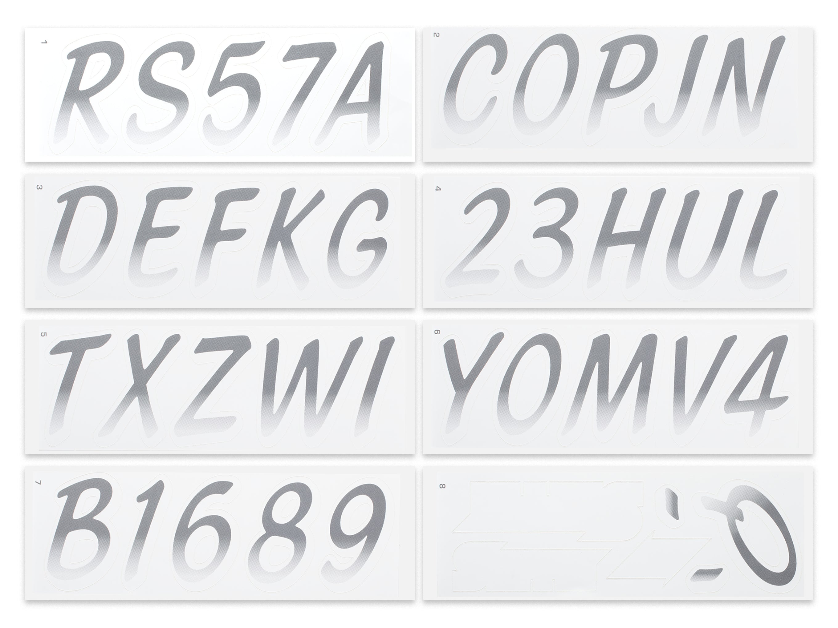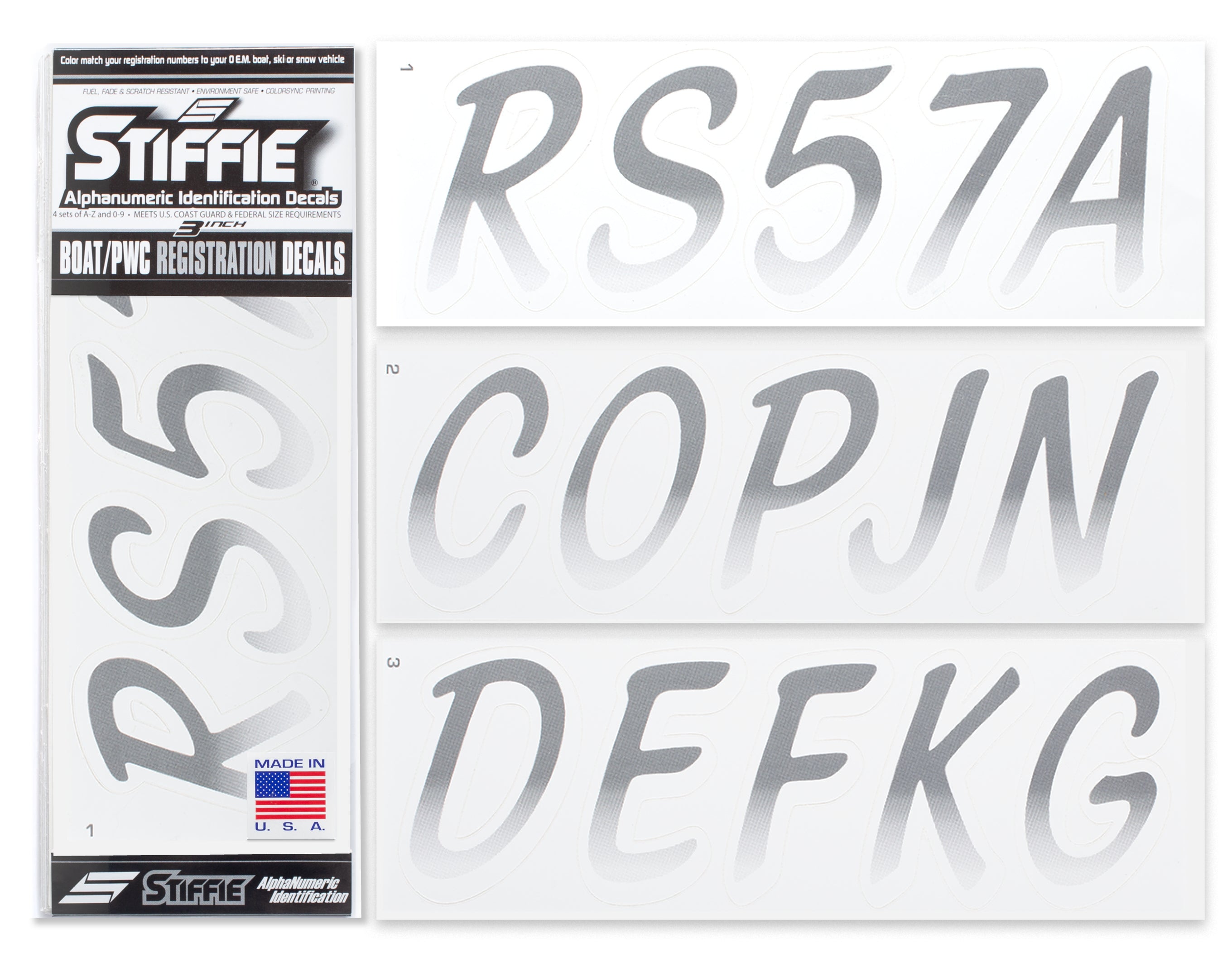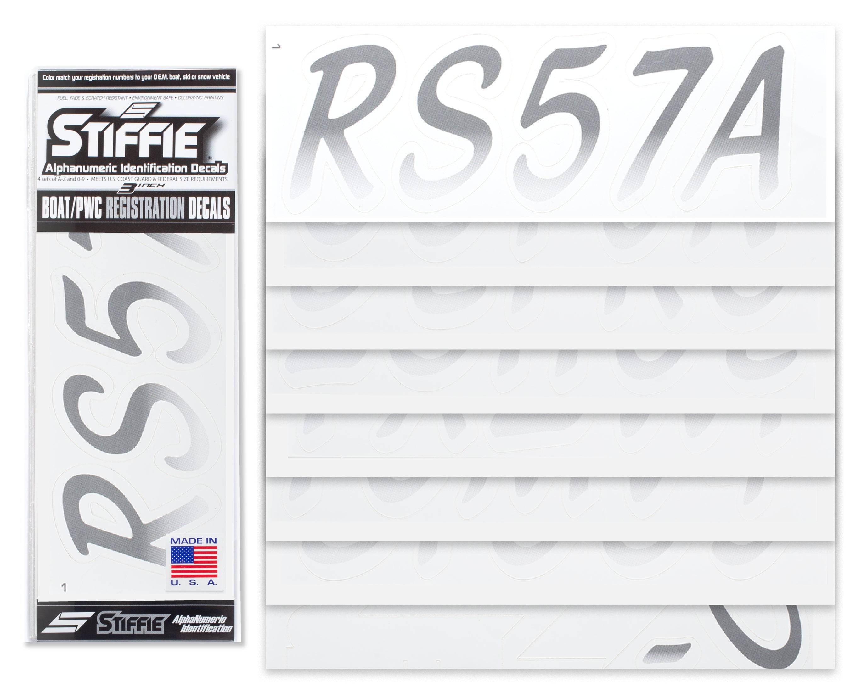 All Alphanumeric ID Kits offered by STIFFIE come with characters that are 3" in height and meet or exceed US Coast Guard Regulations. Every ID kit comes with 4 sets of 0-9 and A-Z decals (146 total decals). STIFFIE Alphanumeric registration decals are resistant to chemical deterioration, fading, curling, tearing and scratching. STIFFIE decals are also UV Coated for protection from harmful ultra-violet (UV) rays.