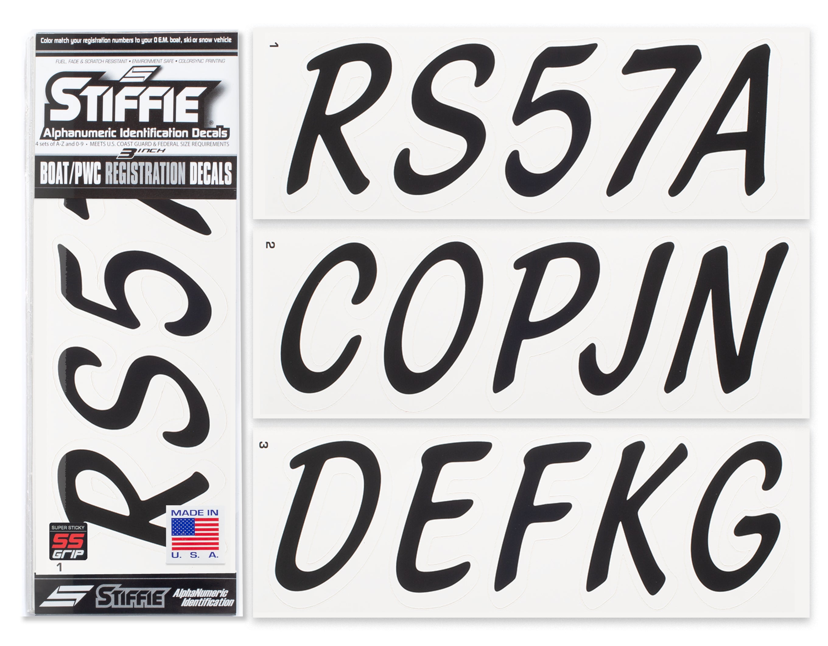 All Alphanumeric ID Kits offered by STIFFIE come with characters that are 3" in height and meet or exceed US Coast Guard Regulations. Every ID kit comes with 4 sets of 0-9 and A-Z decals (146 total decals). STIFFIE Alphanumeric registration decals are resistant to chemical deterioration, fading, curling, tearing and scratching. STIFFIE decals are also UV Coated for protection from harmful ultra-violet (UV) rays.