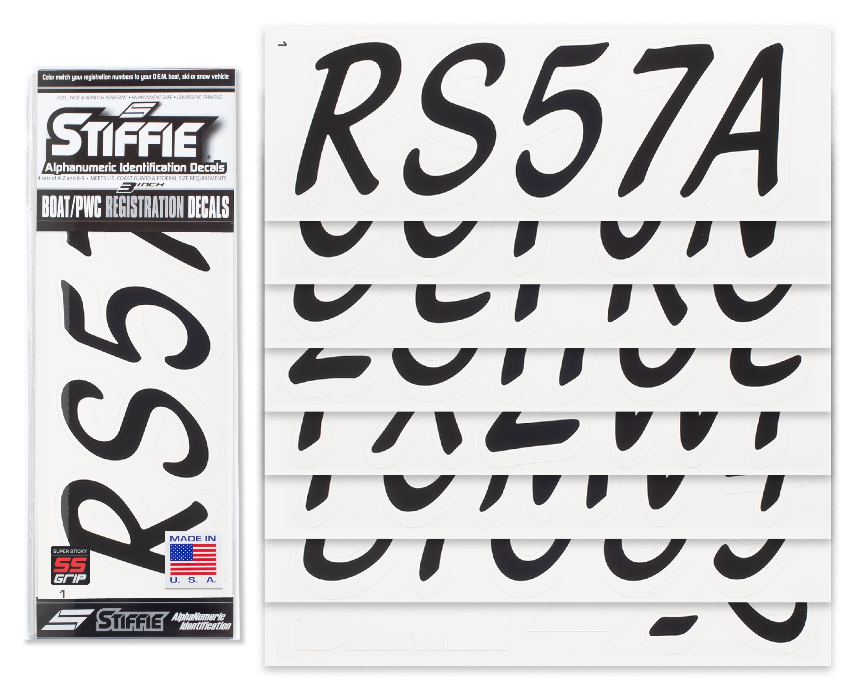 STIFFIE Whipline Solid Black/White 3” Super Sticky Boat & PWC Registration Decals • Numbers Letters Stickers