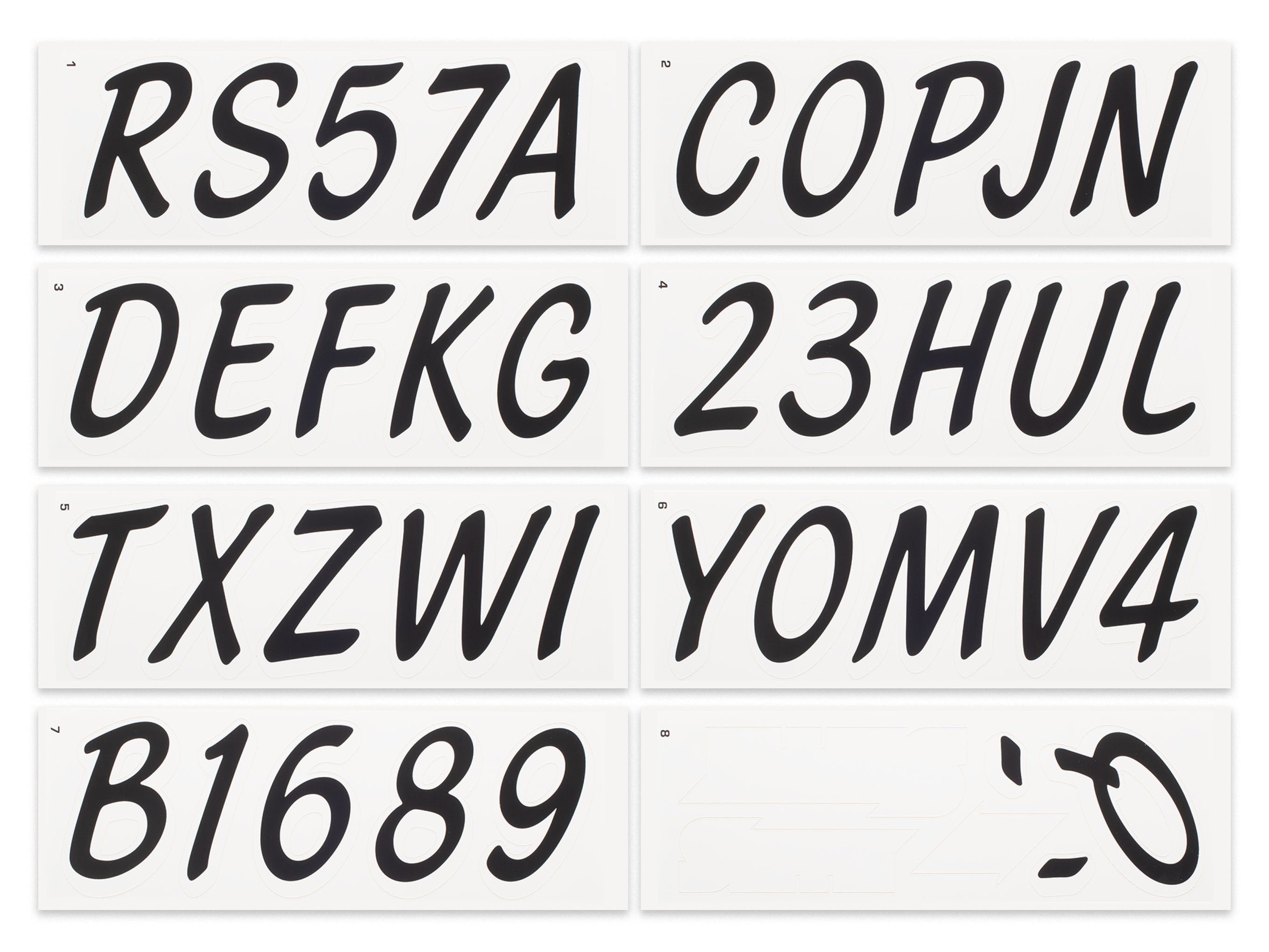 The STIFFIE WhiplineSolid™ Alpha Numeric Identification Kit is a spinoff of our best-selling STIFFIE Whipline™ design. They both use the same cursive font with a forward-facing slant and smooth, rounded edges but STIFFIE WhiplineSolid™ is offered as a solid fill, two-color boat registration numbers and letters.