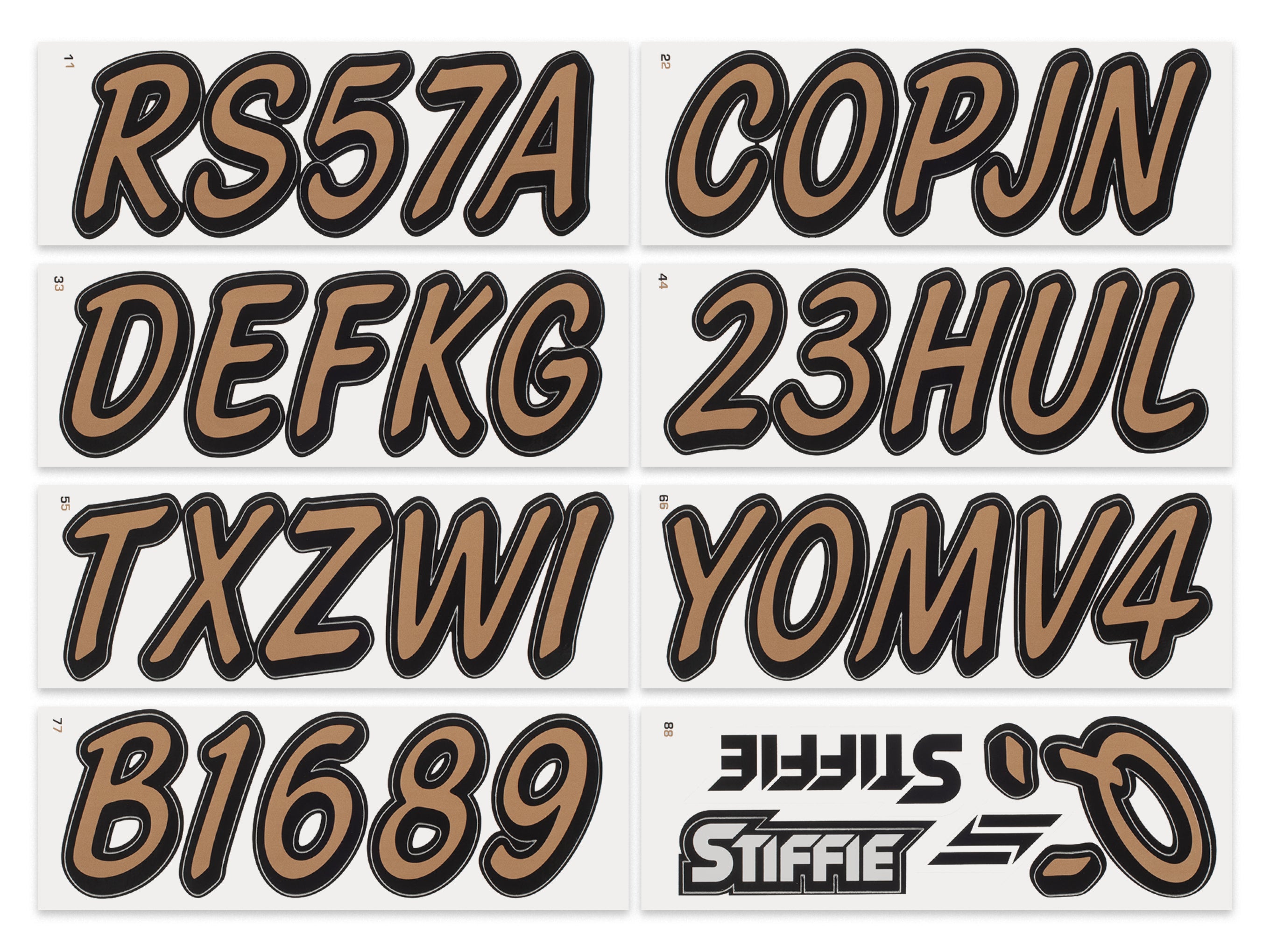 The STIFFIE WhiplineSolid™ Alpha Numeric Identification Kit is a spinoff of our best-selling STIFFIE Whipline™ design. They both use the same cursive font with a forward-facing slant and smooth, rounded edges but STIFFIE WhiplineSolid™ is offered as a solid fill, two-color boat registration numbers and letters.