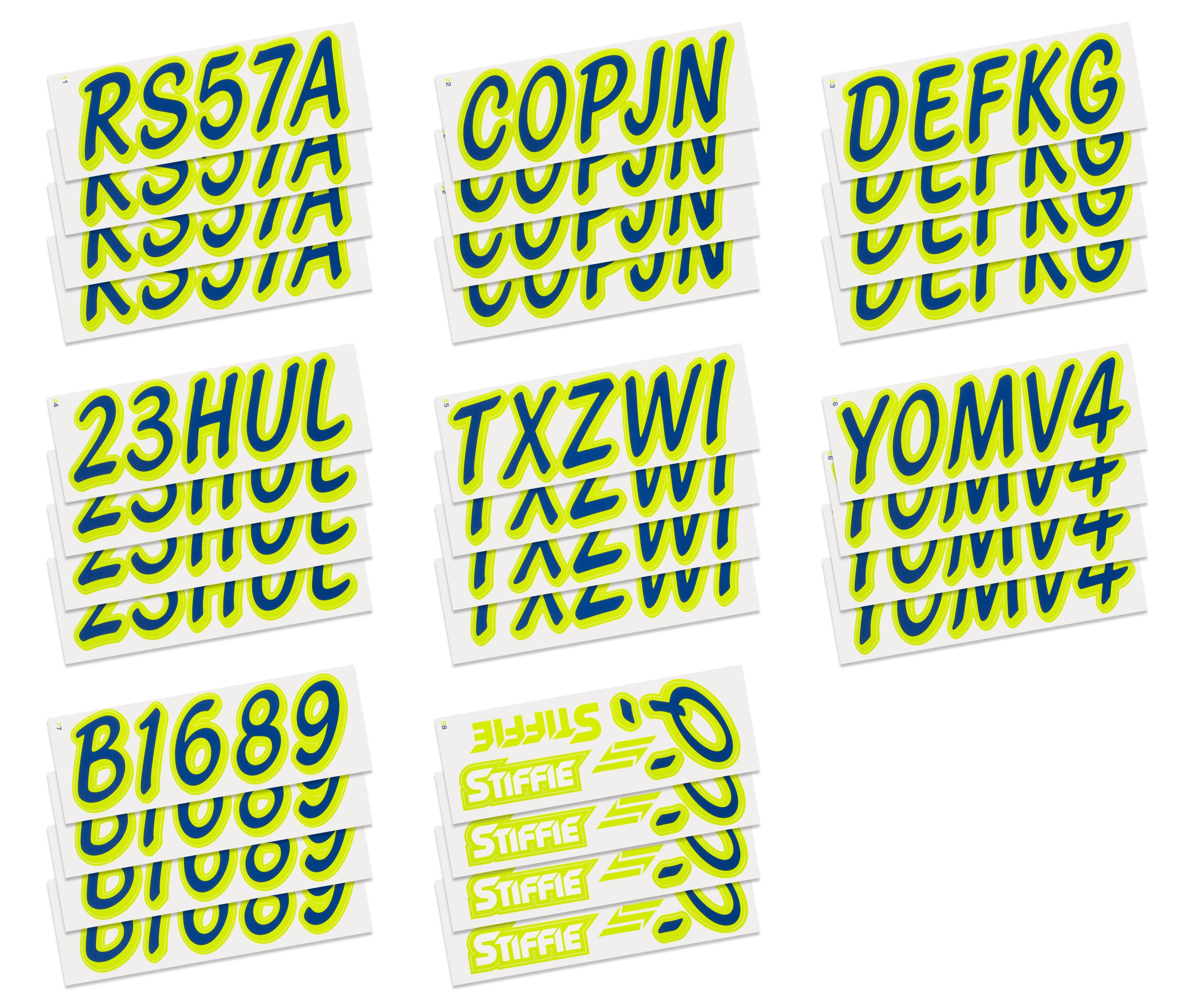 All Alphanumeric ID Kits offered by STIFFIE come with characters that are 3" in height and meet or exceed US Coast Guard Regulations. Every ID kit comes with 4 sets of 0-9 and A-Z decals (146 total decals). STIFFIE Alphanumeric registration decals are resistant to chemical deterioration, fading, curling, tearing and scratching. STIFFIE decals are also UV Coated for protection from harmful ultra-violet (UV) rays.