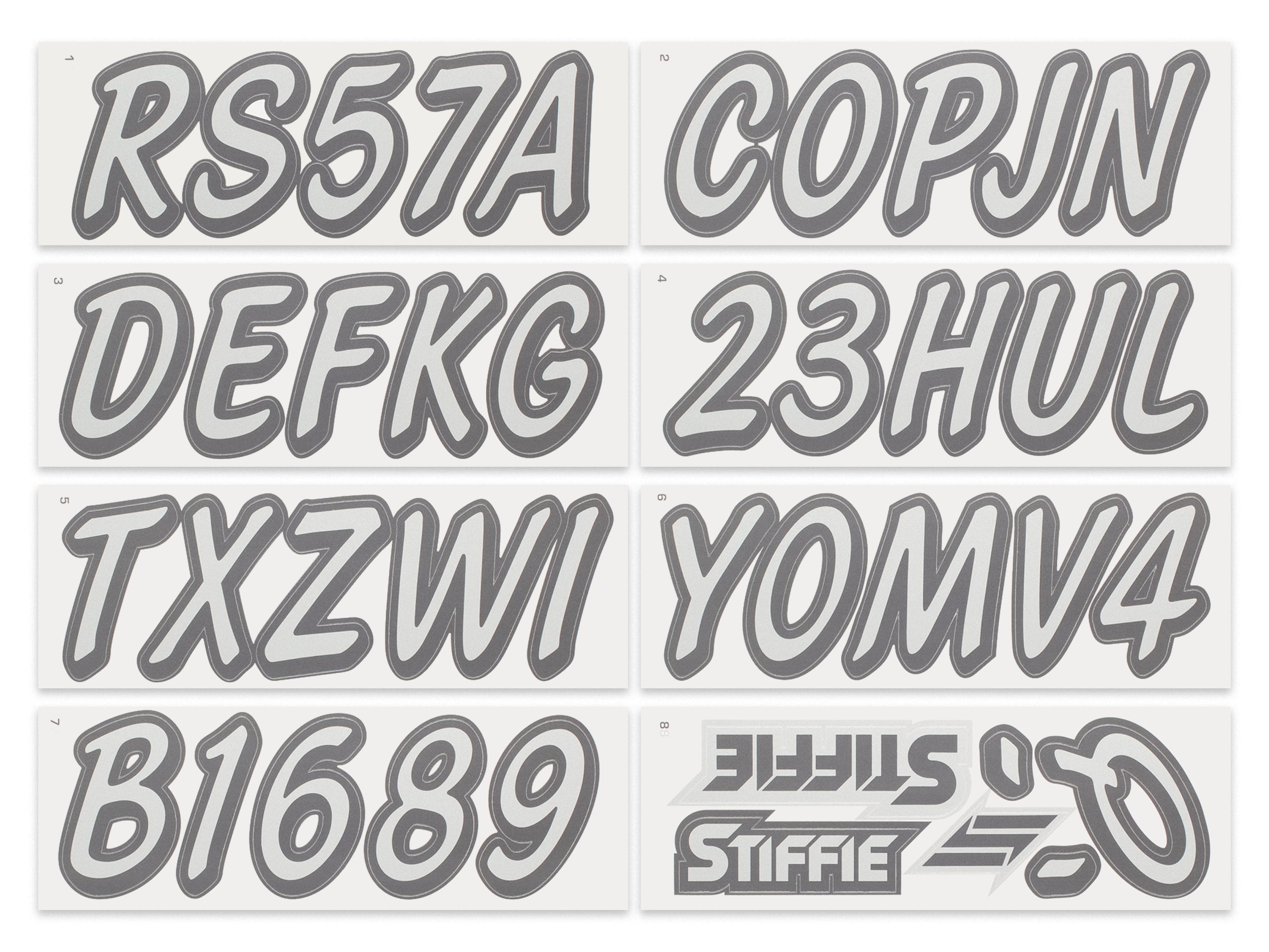 The STIFFIE WhiplineSolid™ Alpha Numeric Identification Kit is a spinoff of our best-selling STIFFIE Whipline™ design. They both use the same cursive font with a forward-facing slant and smooth, rounded edges but STIFFIE WhiplineSolid™ is offered as a solid fill, two-color boat registration numbers and letters.