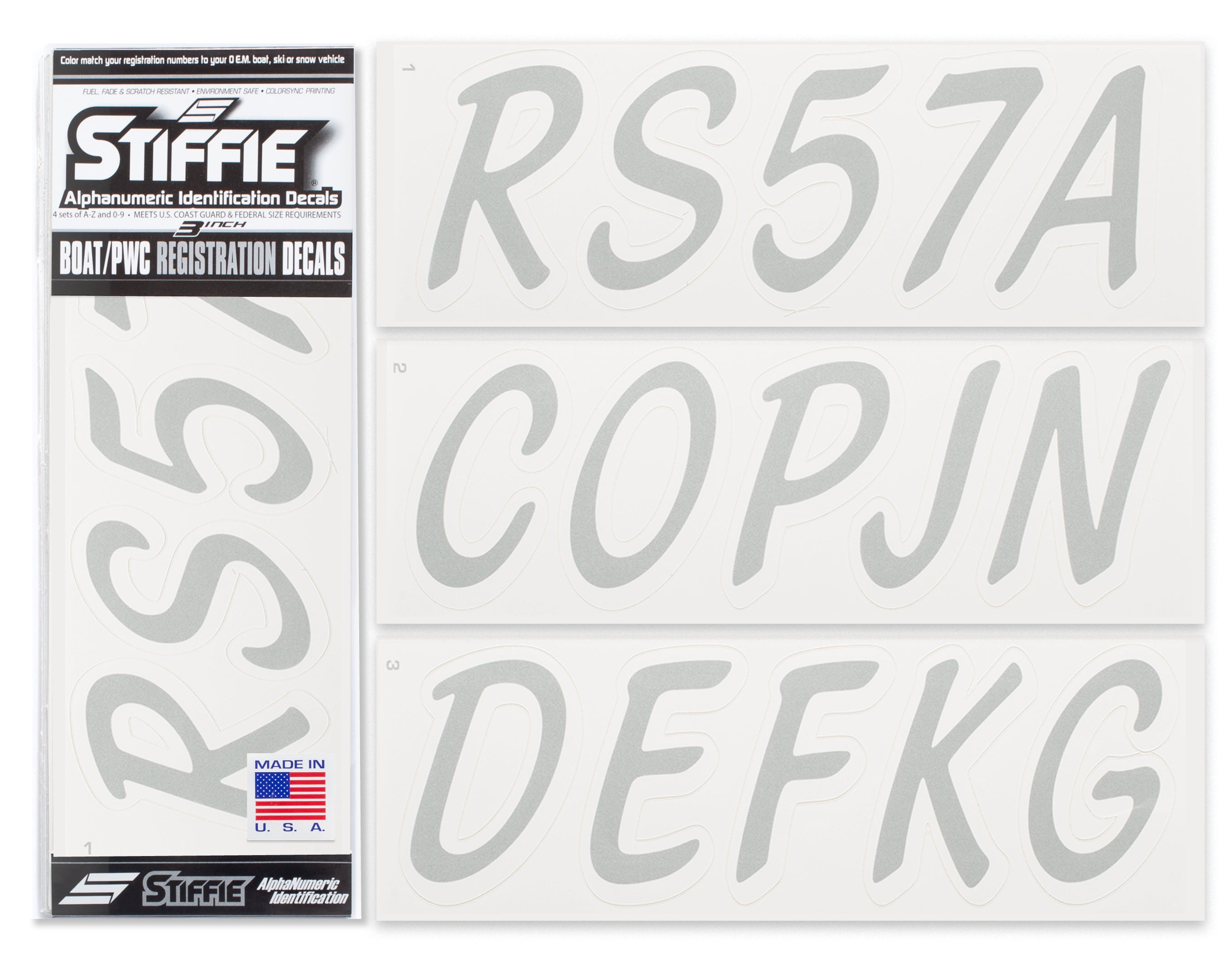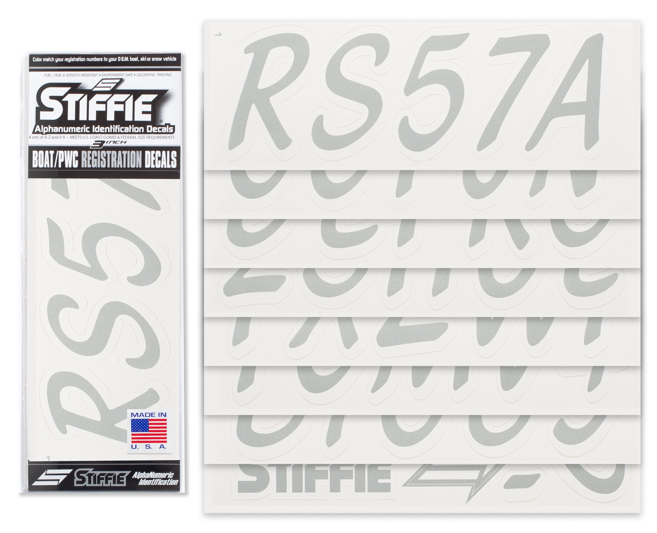 STIFFIE Whipline Solid Metallic Silver/White 3” Boat & PWC Registration Decals • Numbers Letters Stickers