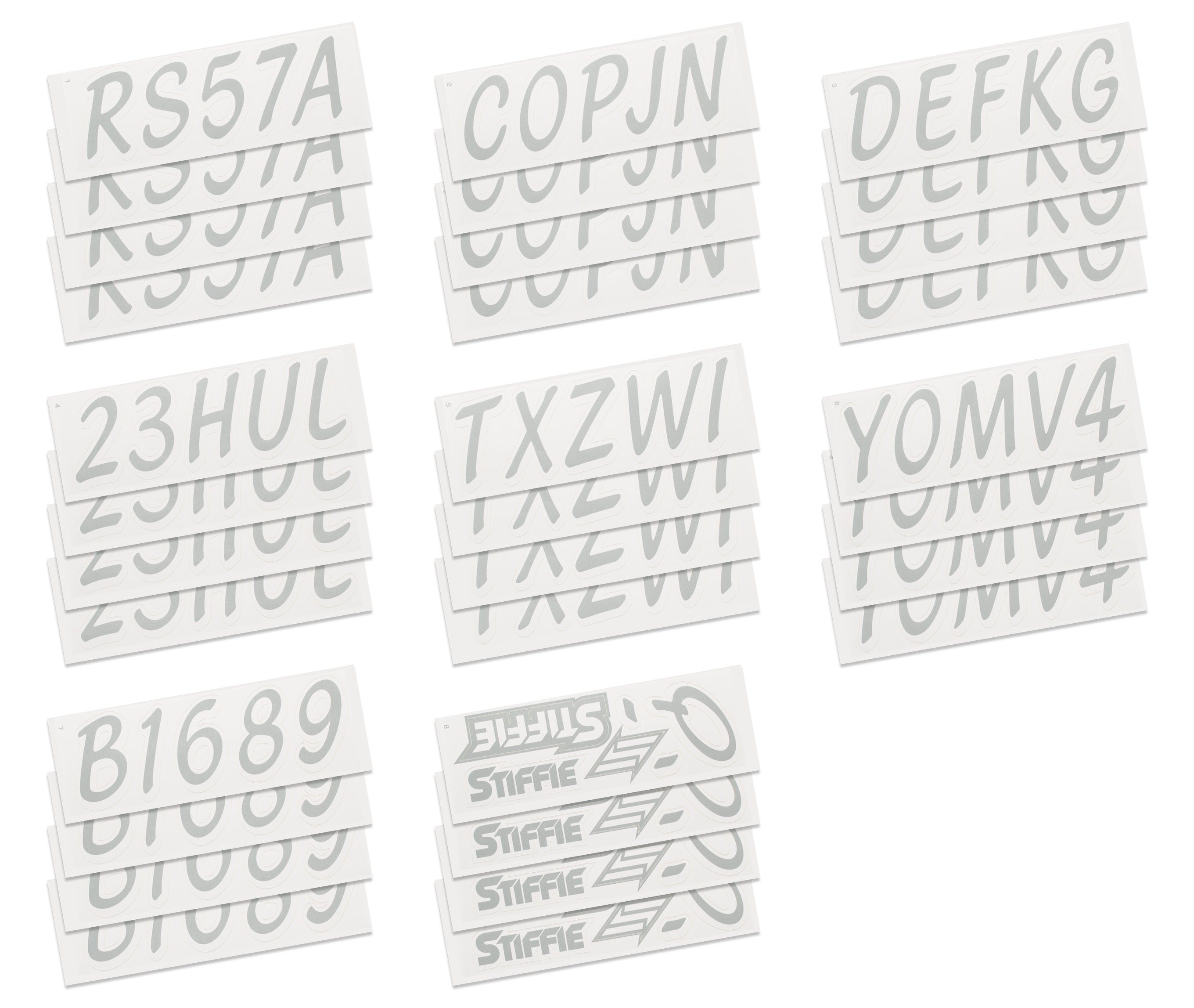 All Alphanumeric ID Kits offered by STIFFIE come with characters that are 3" in height and meet or exceed US Coast Guard Regulations. Every ID kit comes with 4 sets of 0-9 and A-Z decals (146 total decals). STIFFIE Alphanumeric registration decals are resistant to chemical deterioration, fading, curling, tearing and scratching. STIFFIE decals are also UV Coated for protection from harmful ultra-violet (UV) rays.