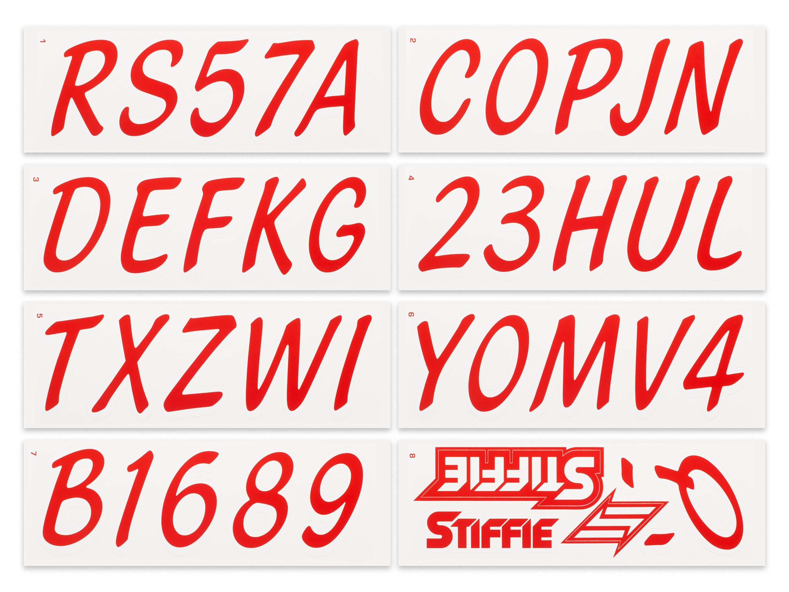 The STIFFIE WhiplineSolid™ Alpha Numeric Identification Kit is a spinoff of our best-selling STIFFIE Whipline™ design. They both use the same cursive font with a forward-facing slant and smooth, rounded edges but STIFFIE WhiplineSolid™ is offered as a solid fill, two-color boat registration numbers and letters.