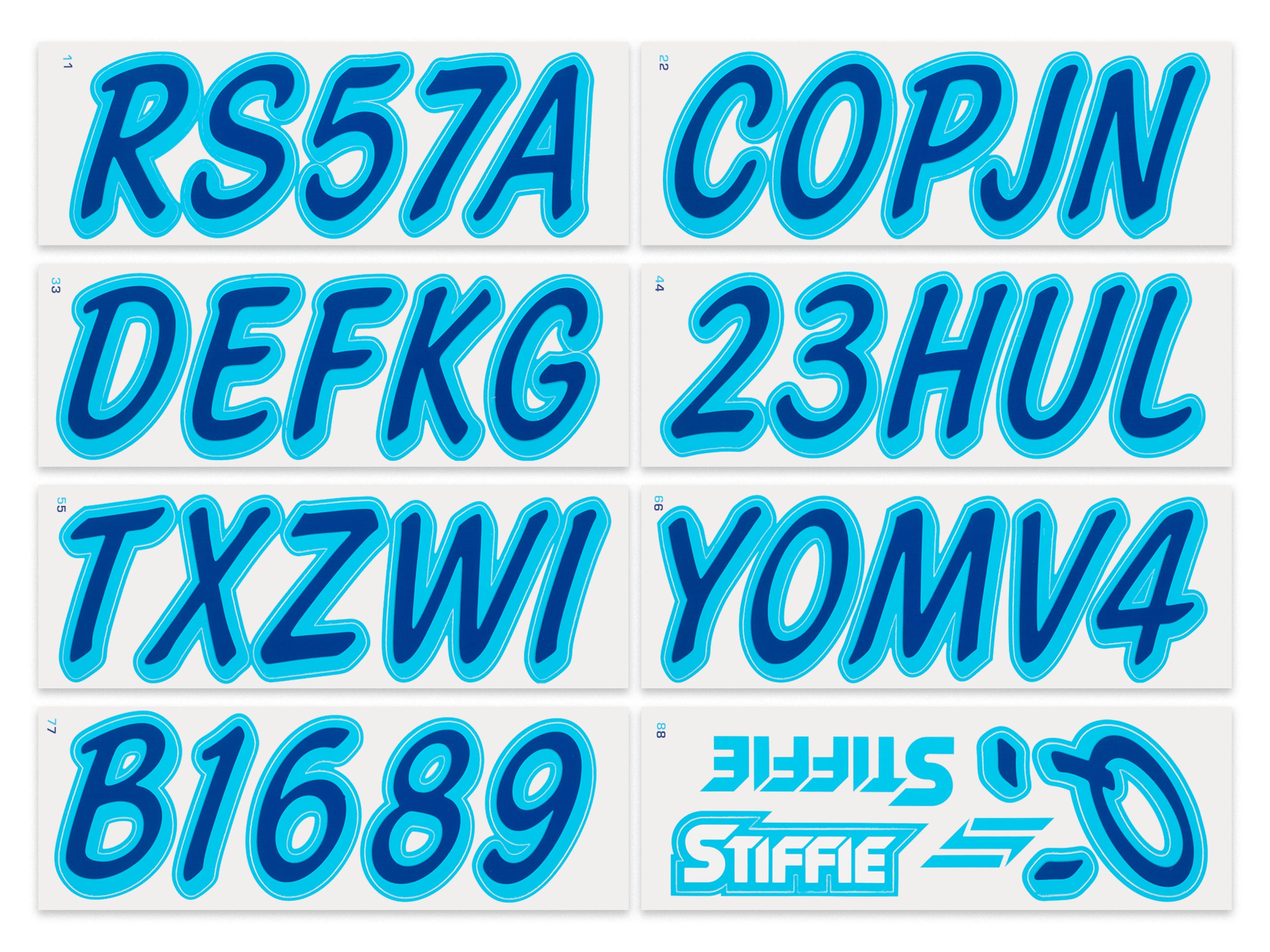 The STIFFIE WhiplineSolid™ Alpha Numeric Identification Kit is a spinoff of our best-selling STIFFIE Whipline™ design. They both use the same cursive font with a forward-facing slant and smooth, rounded edges but STIFFIE WhiplineSolid™ is offered as a solid fill, two-color boat registration numbers and letters.
