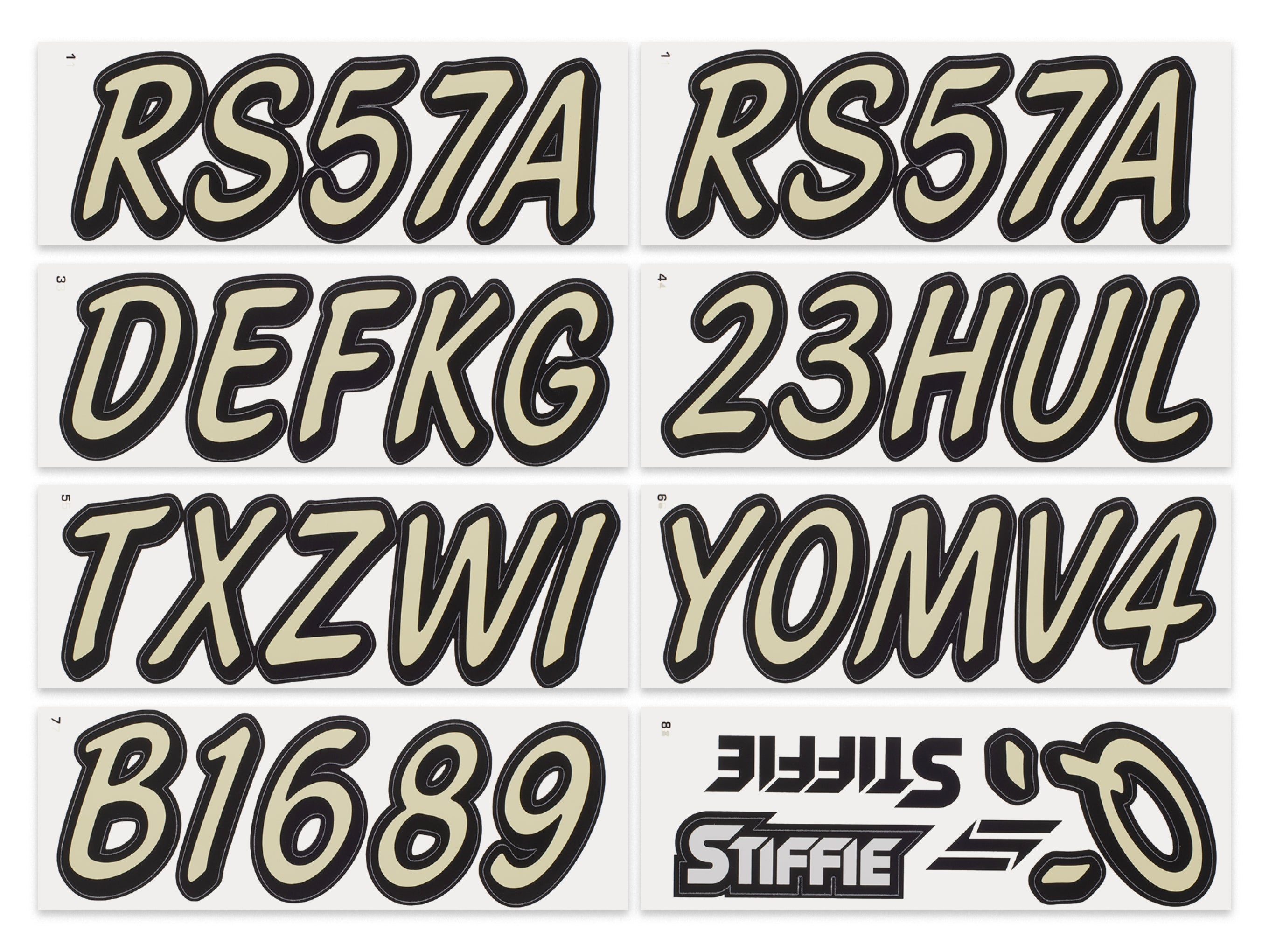 The STIFFIE WhiplineSolid™ Alpha Numeric Identification Kit is a spinoff of our best-selling STIFFIE Whipline™ design. They both use the same cursive font with a forward-facing slant and smooth, rounded edges but STIFFIE WhiplineSolid™ is offered as a solid fill, two-color boat registration numbers and letters.