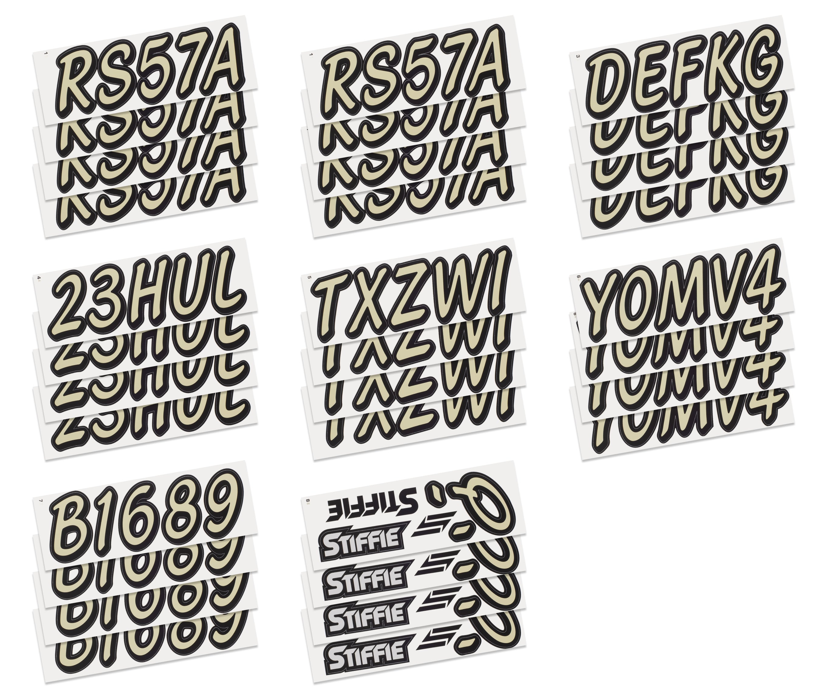 All Alphanumeric ID Kits offered by STIFFIE come with characters that are 3" in height and meet or exceed US Coast Guard Regulations. Every ID kit comes with 4 sets of 0-9 and A-Z decals (146 total decals). STIFFIE Alphanumeric registration decals are resistant to chemical deterioration, fading, curling, tearing and scratching. STIFFIE decals are also UV Coated for protection from harmful ultra-violet (UV) rays.