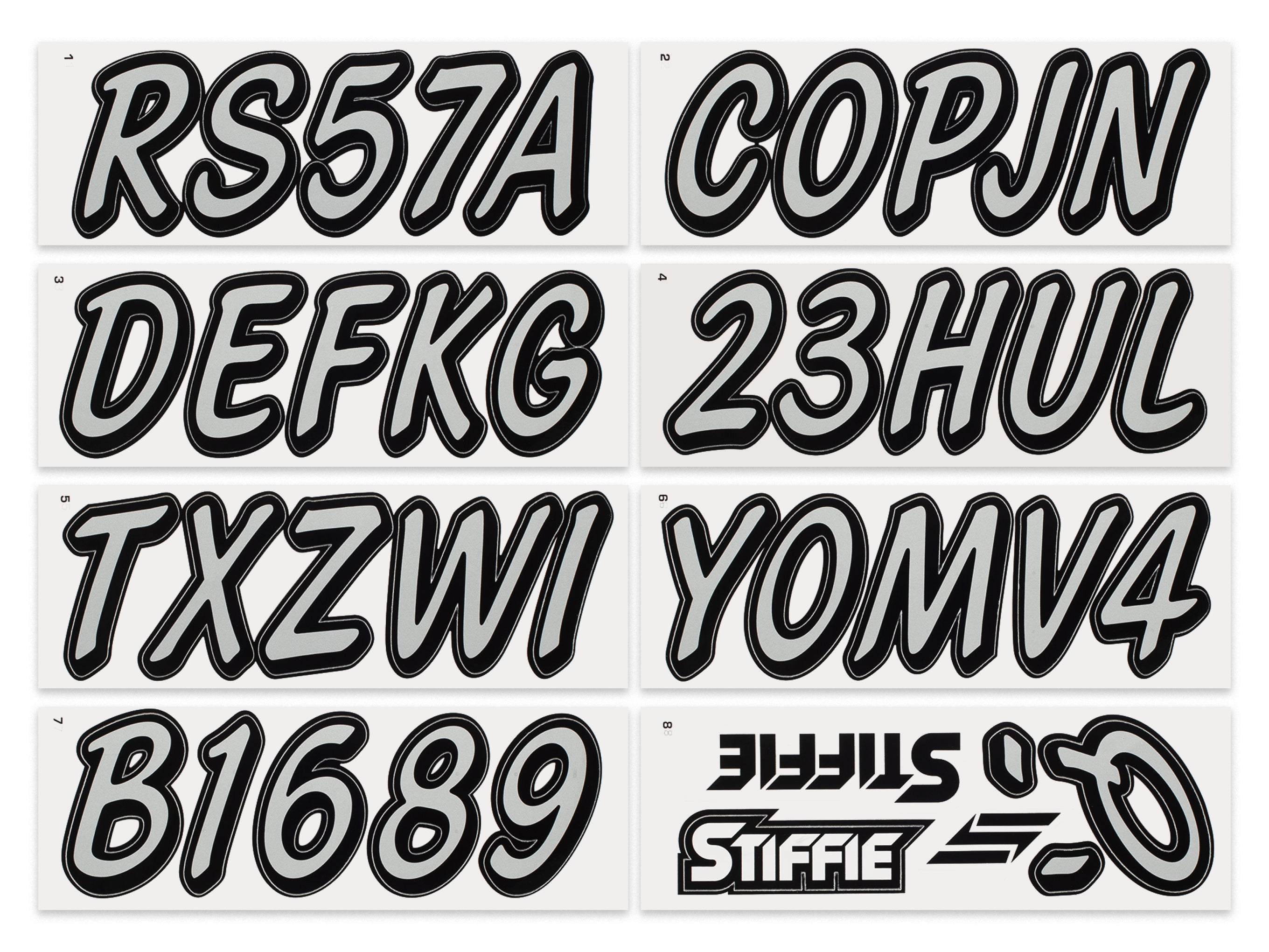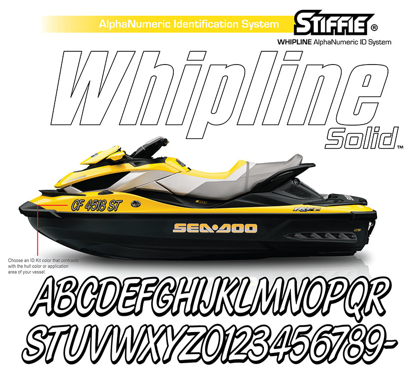 The STIFFIE WhiplineSolid™ Alpha Numeric Identification Kit is a spinoff of our best-selling STIFFIE Whipline™ design. They both use the same cursive font with a forward-facing slant and smooth, rounded edges but STIFFIE WhiplineSolid™ is offered as a solid fill, two-color boat registration numbers and letters.