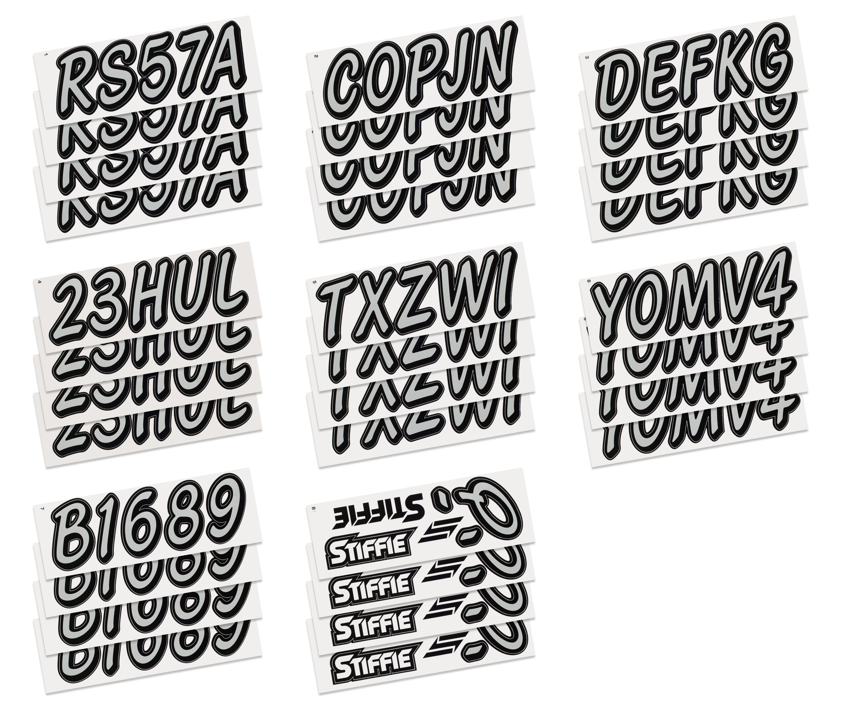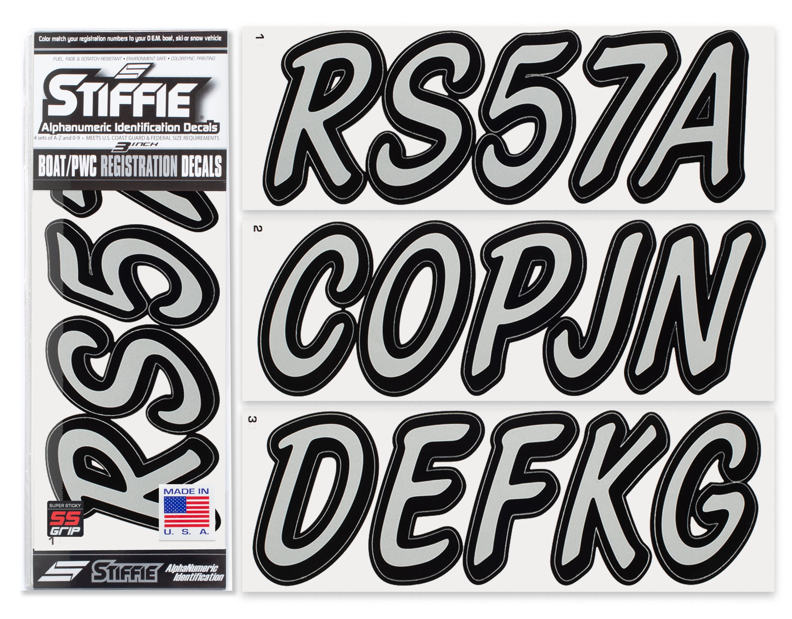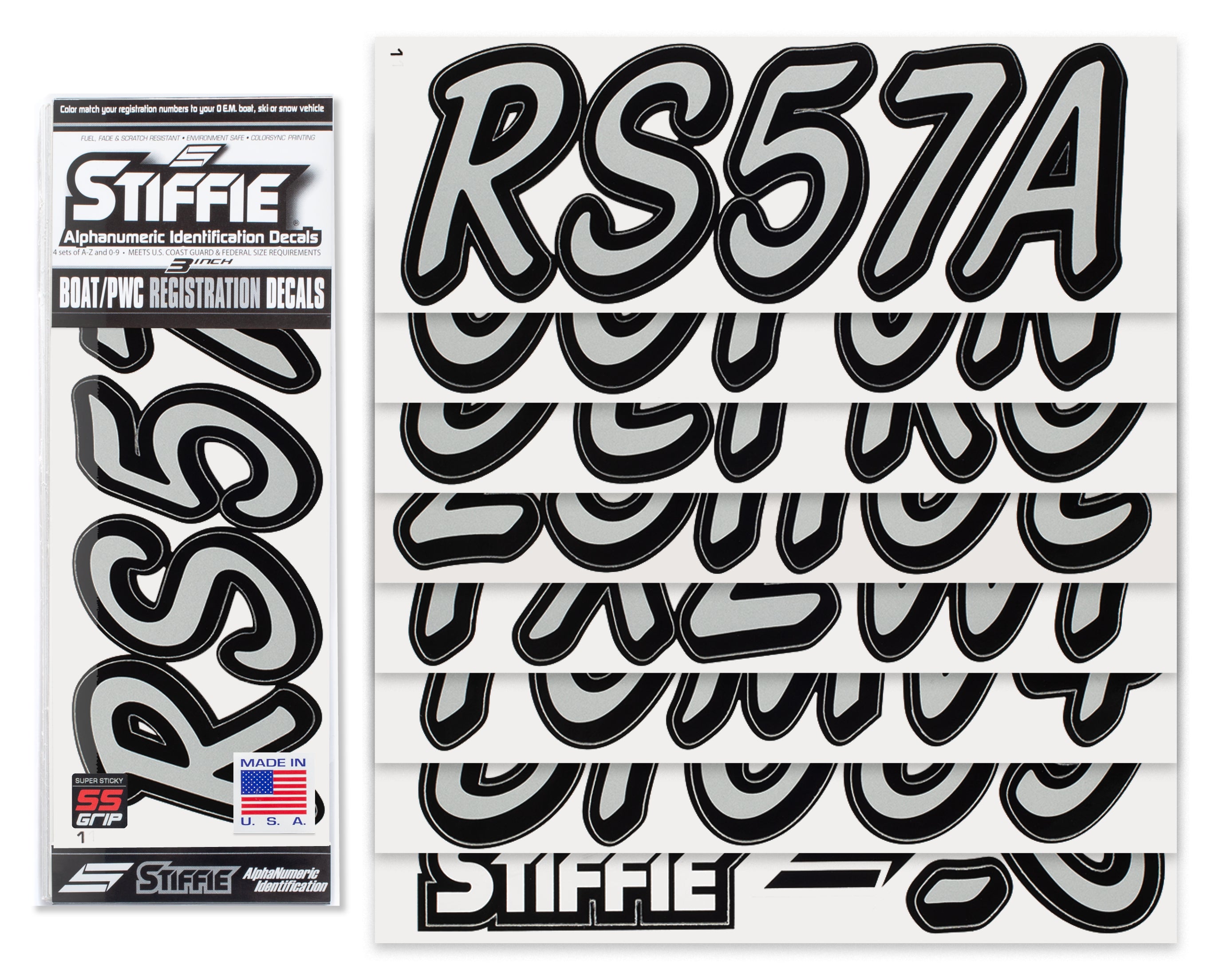 STIFFIE Whipline Solid Metallic Silver/Black 3” Super Sticky Boat & PWC Registration Decals • Numbers Letters Stickers