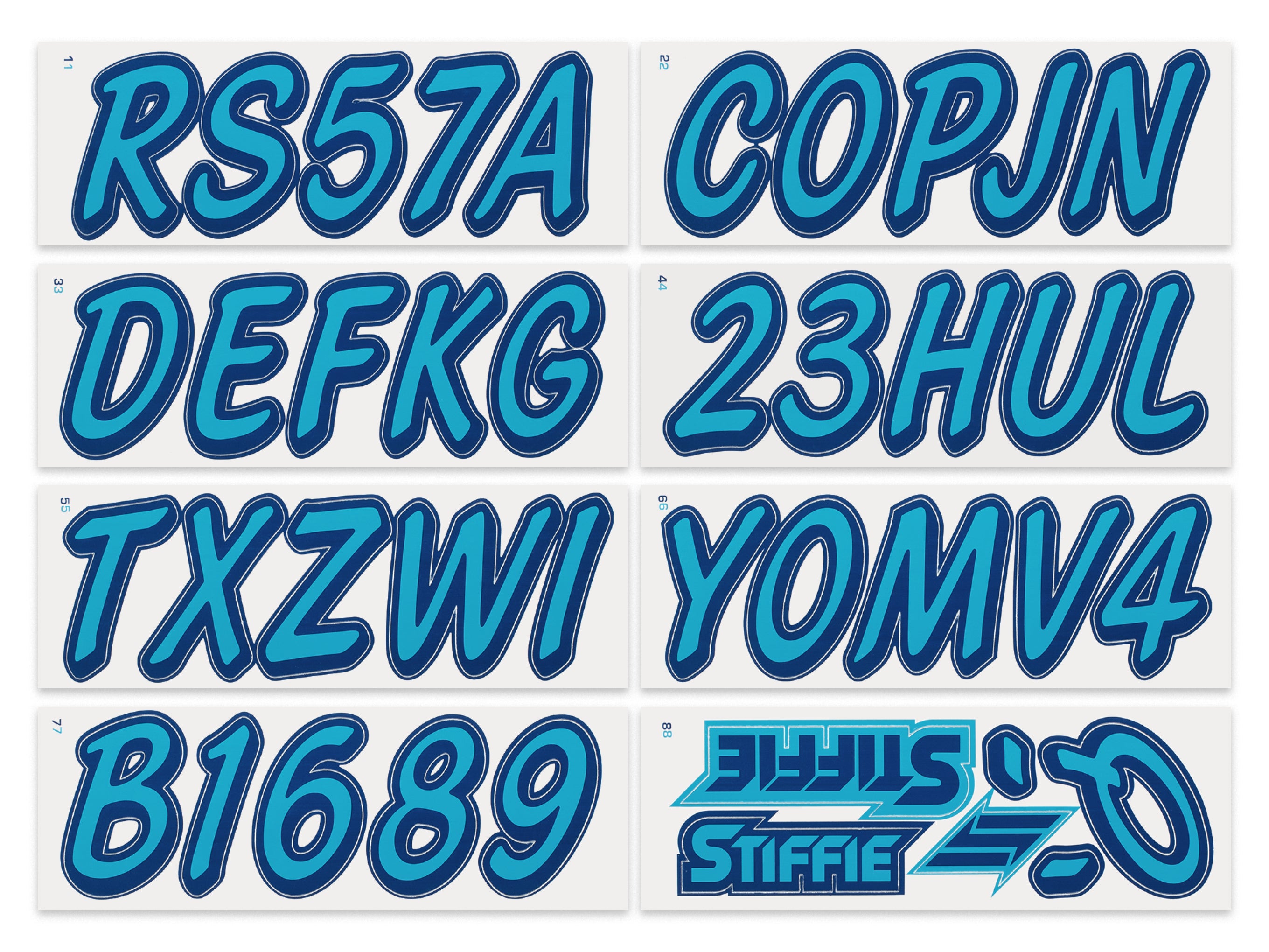 The STIFFIE WhiplineSolid™ Alpha Numeric Identification Kit is a spinoff of our best-selling STIFFIE Whipline™ design. They both use the same cursive font with a forward-facing slant and smooth, rounded edges but STIFFIE WhiplineSolid™ is offered as a solid fill, two-color boat registration numbers and letters.