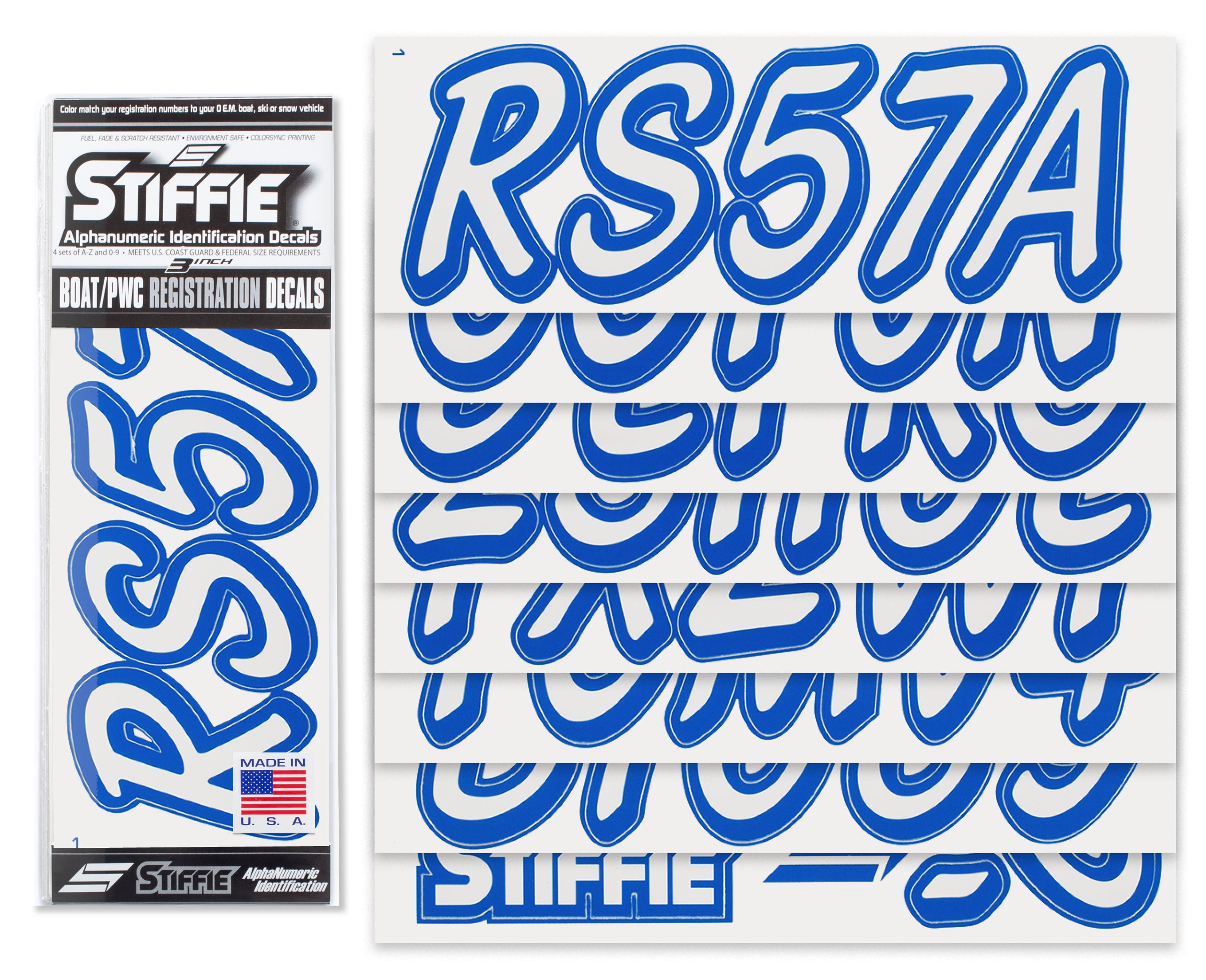 All Alphanumeric ID Kits offered by STIFFIE come with characters that are 3" in height and meet or exceed US Coast Guard Regulations. Every ID kit comes with 4 sets of 0-9 and A-Z decals (146 total decals). STIFFIE Alphanumeric registration decals are resistant to chemical deterioration, fading, curling, tearing and scratching. STIFFIE decals are also UV Coated for protection from harmful ultra-violet (UV) rays.