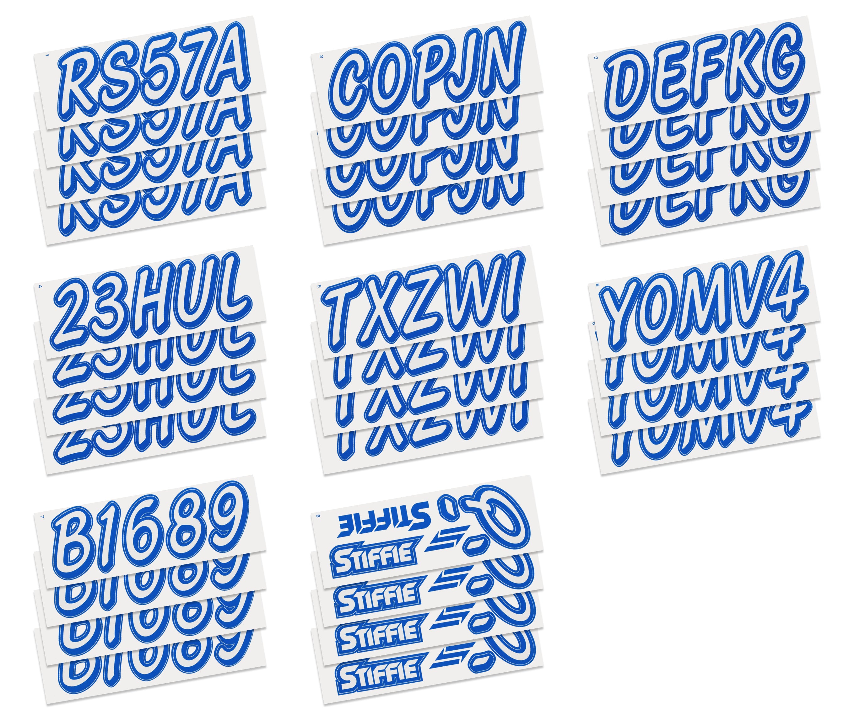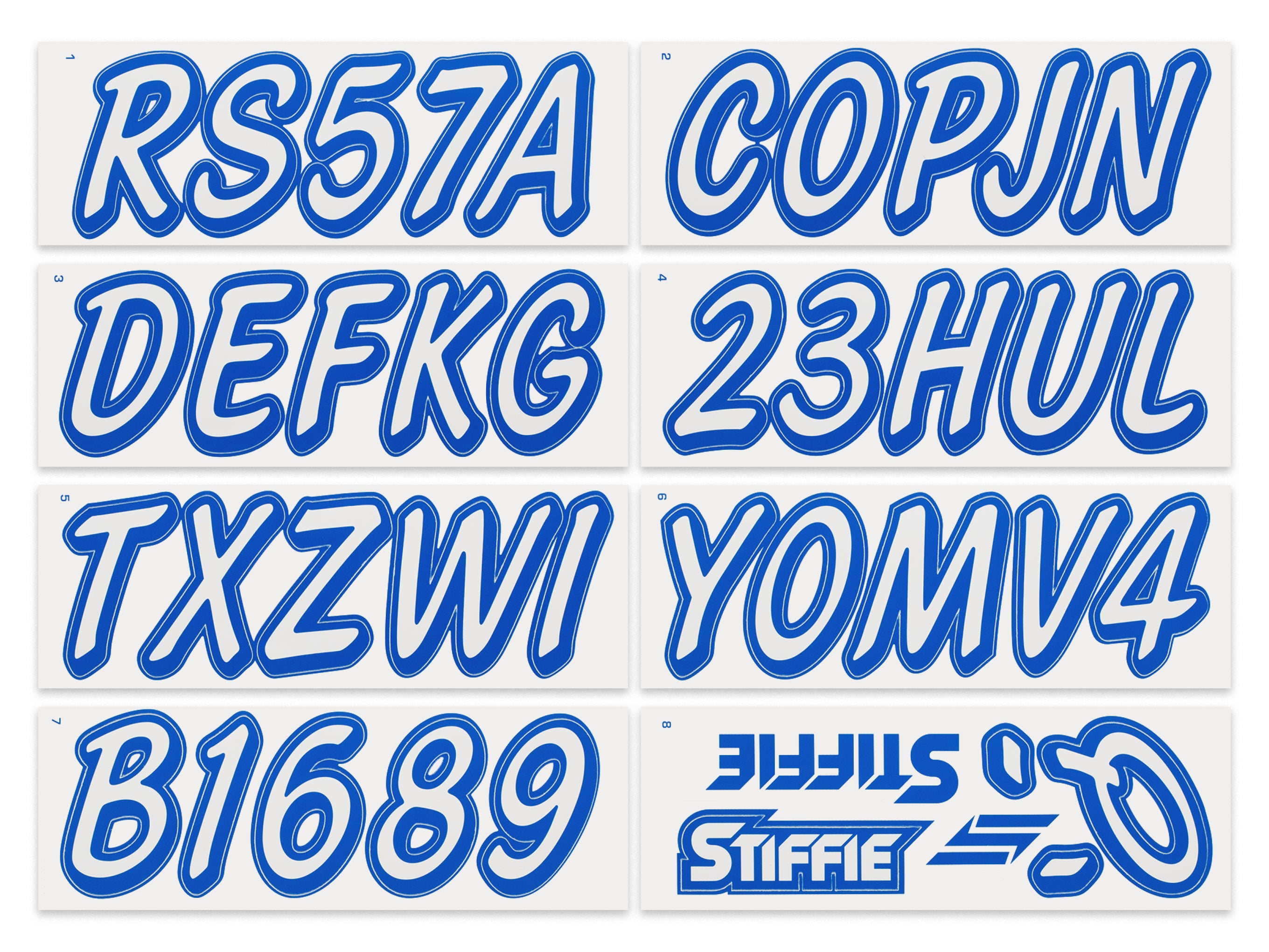 The STIFFIE WhiplineSolid™ Alpha Numeric Identification Kit is a spinoff of our best-selling STIFFIE Whipline™ design. They both use the same cursive font with a forward-facing slant and smooth, rounded edges but STIFFIE WhiplineSolid™ is offered as a solid fill, two-color boat registration numbers and letters.